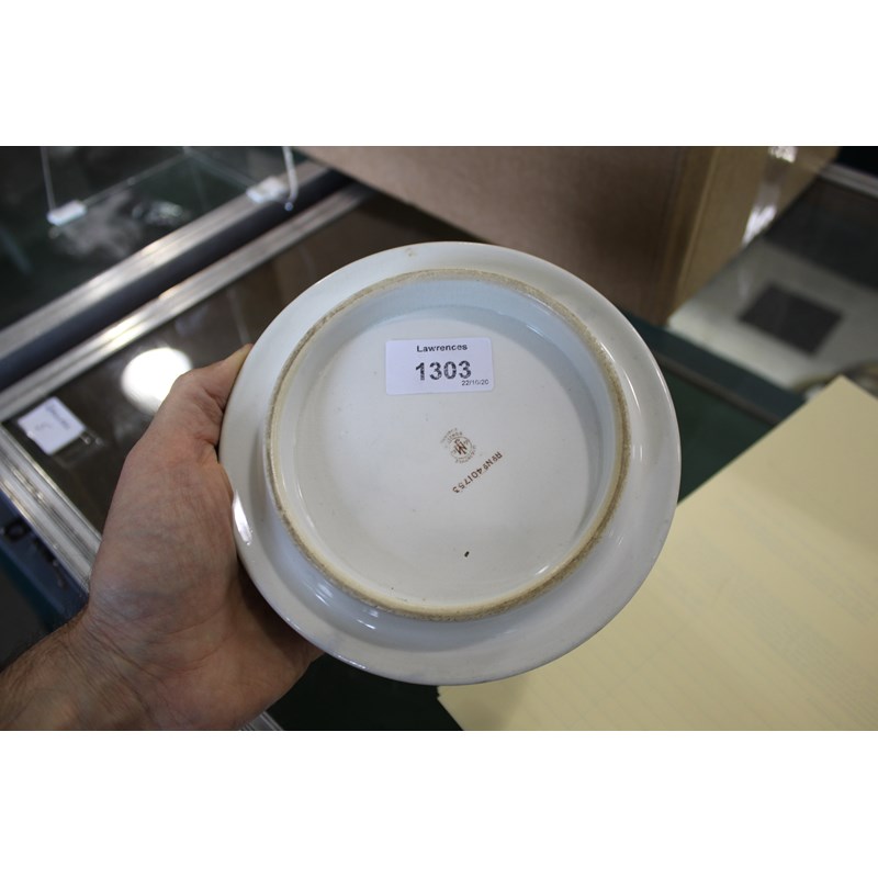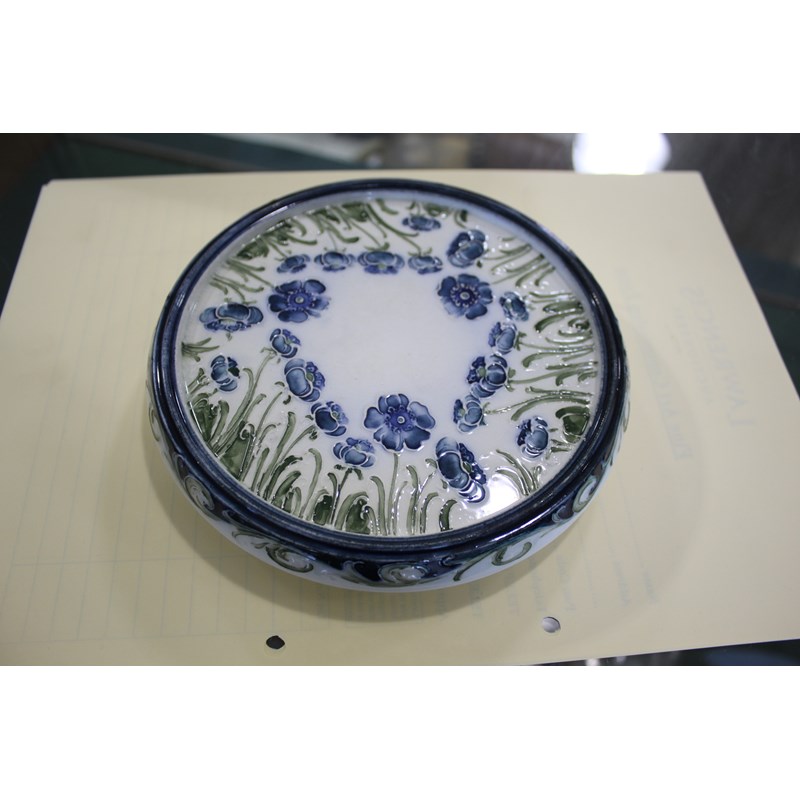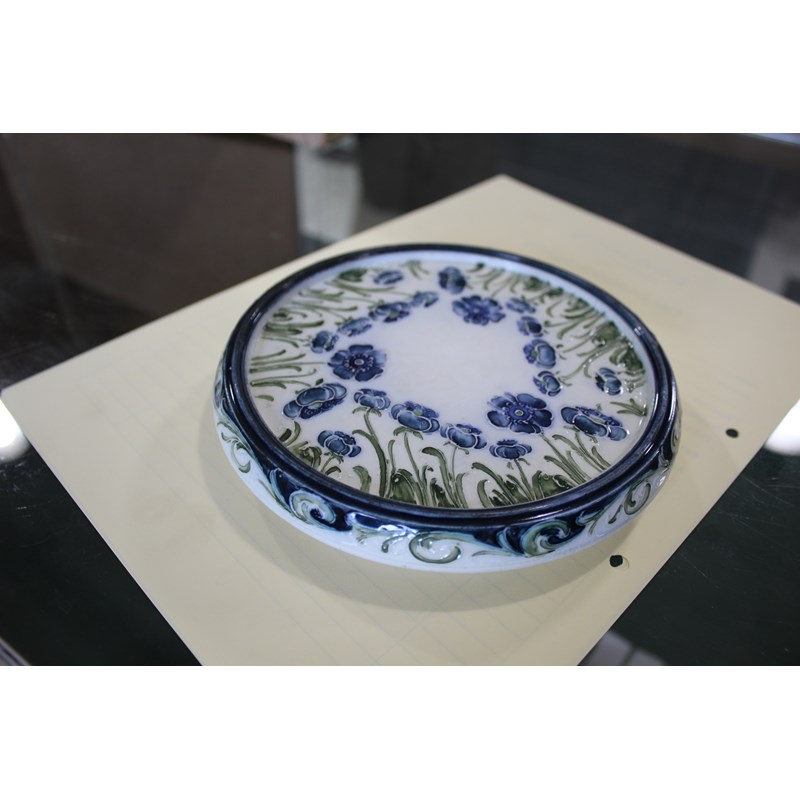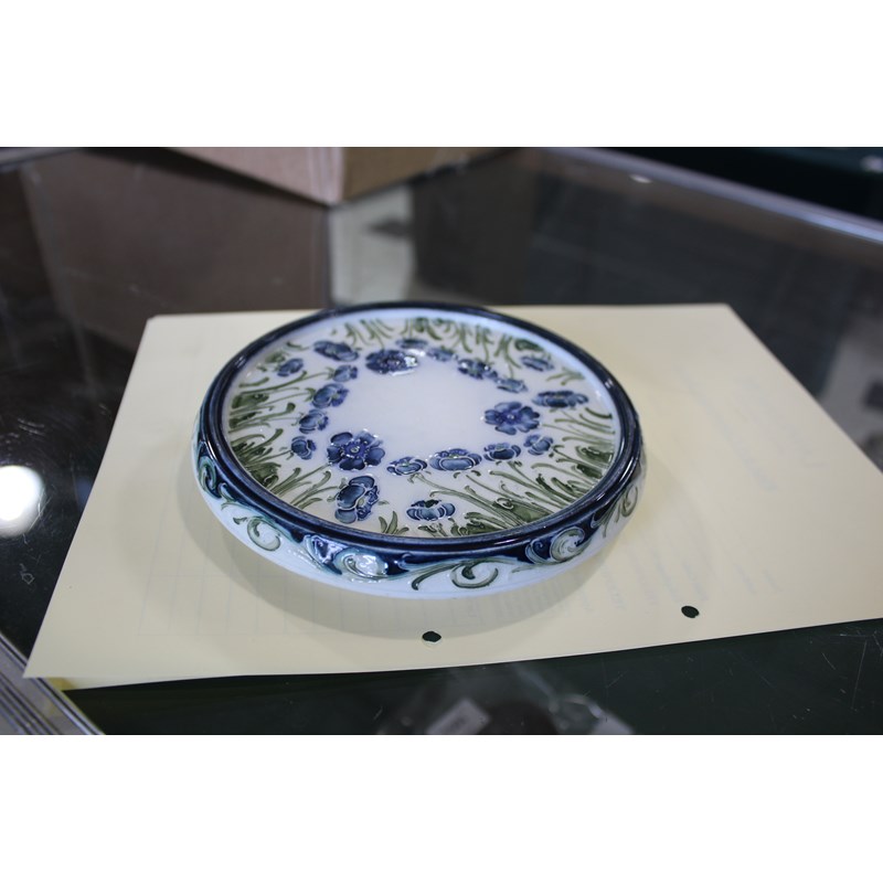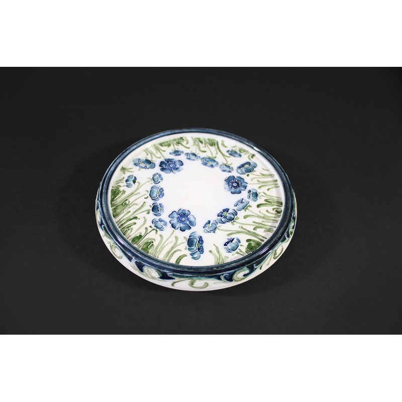a circular teapot stand painted in the Blue Poppy design, painted with flowers and foliage. Marked, Macintyre, Burslem, Rd No 401753. 16cms diameter