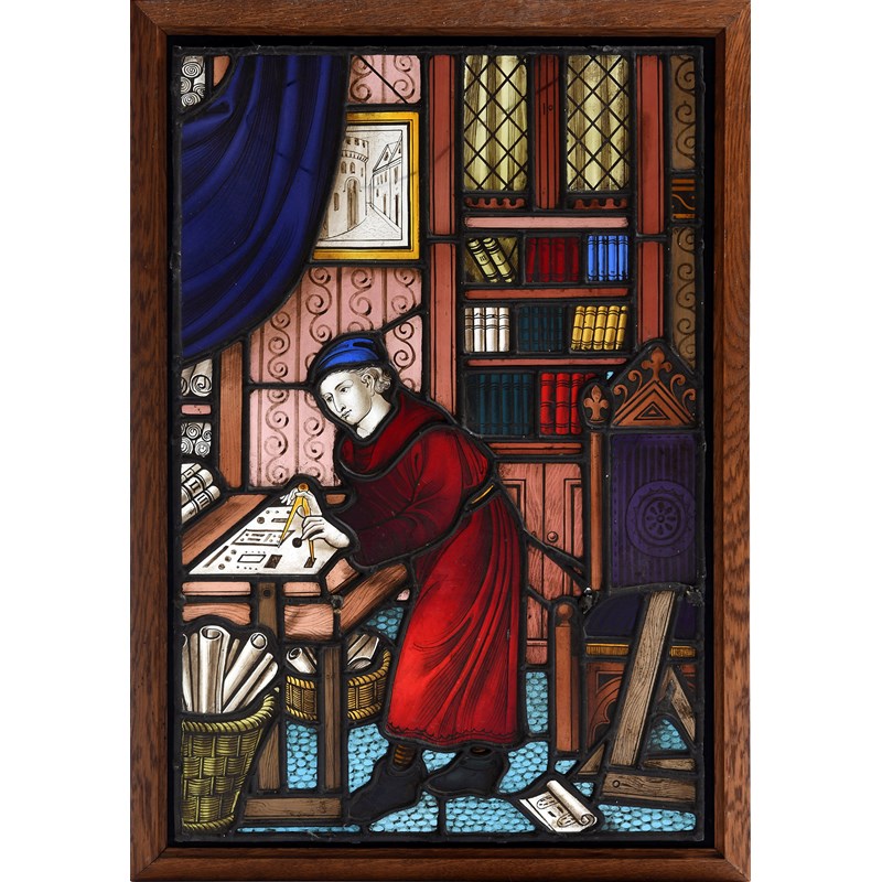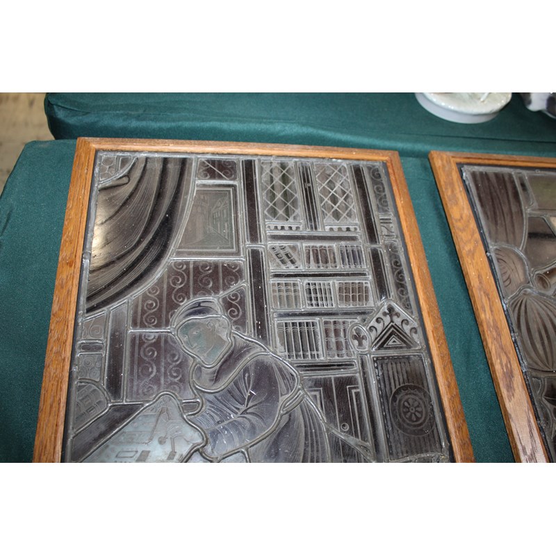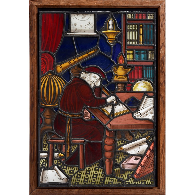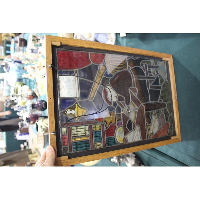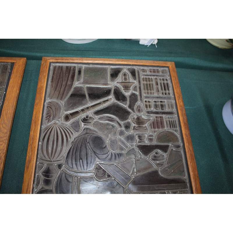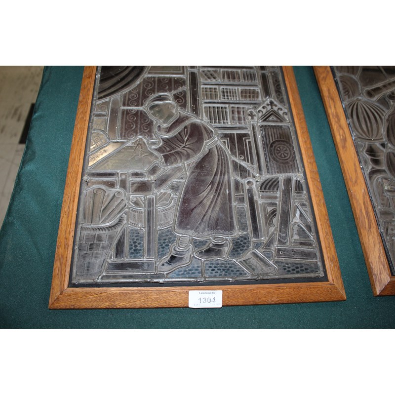 one panel with a depiction of a figure holding a pair of dividers, within a library scene with various books and charts. The other matching panel with a depiction of a scientist, with a telescope and various books and charts. Both mounted in oak frames. Glass 45cms by 30cms, Frame 50cms by 35cms. (2)