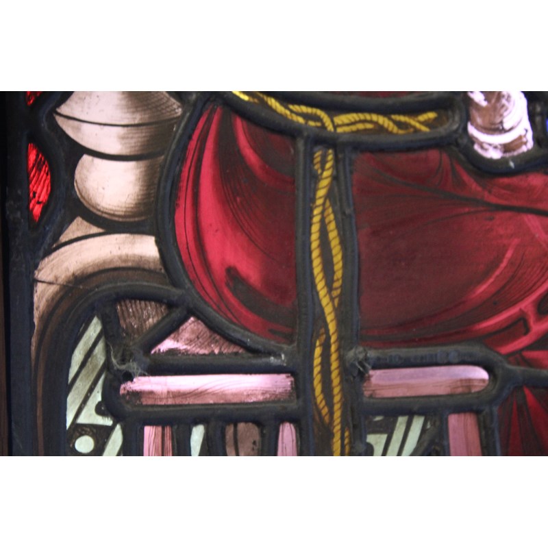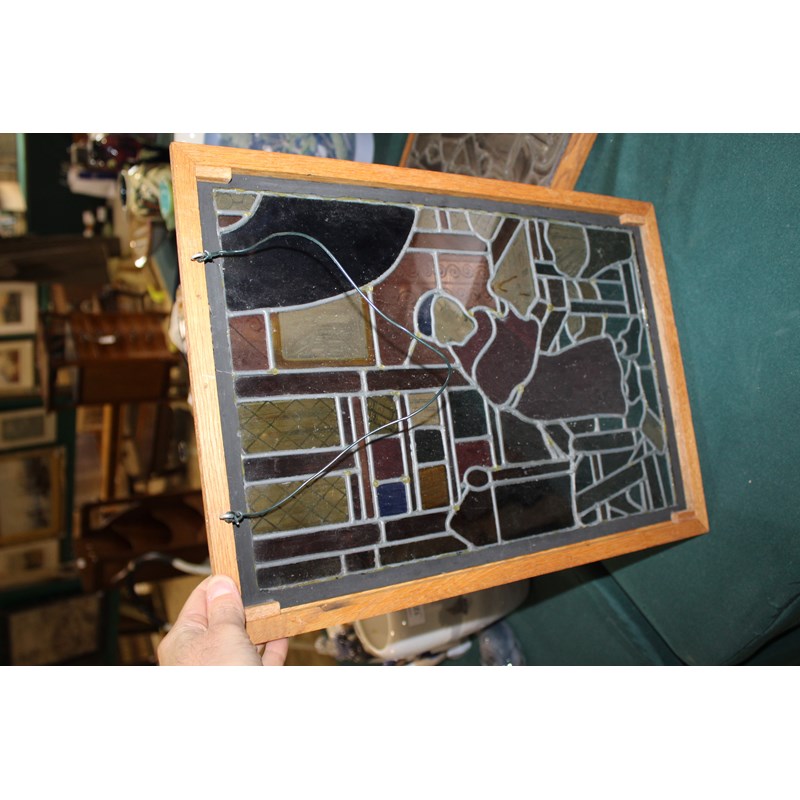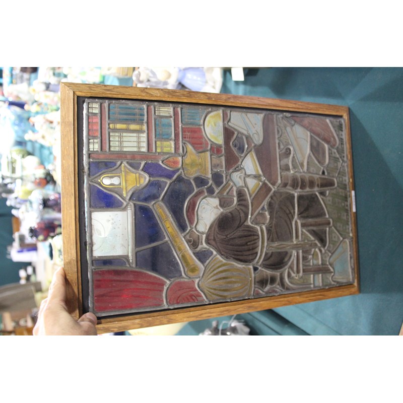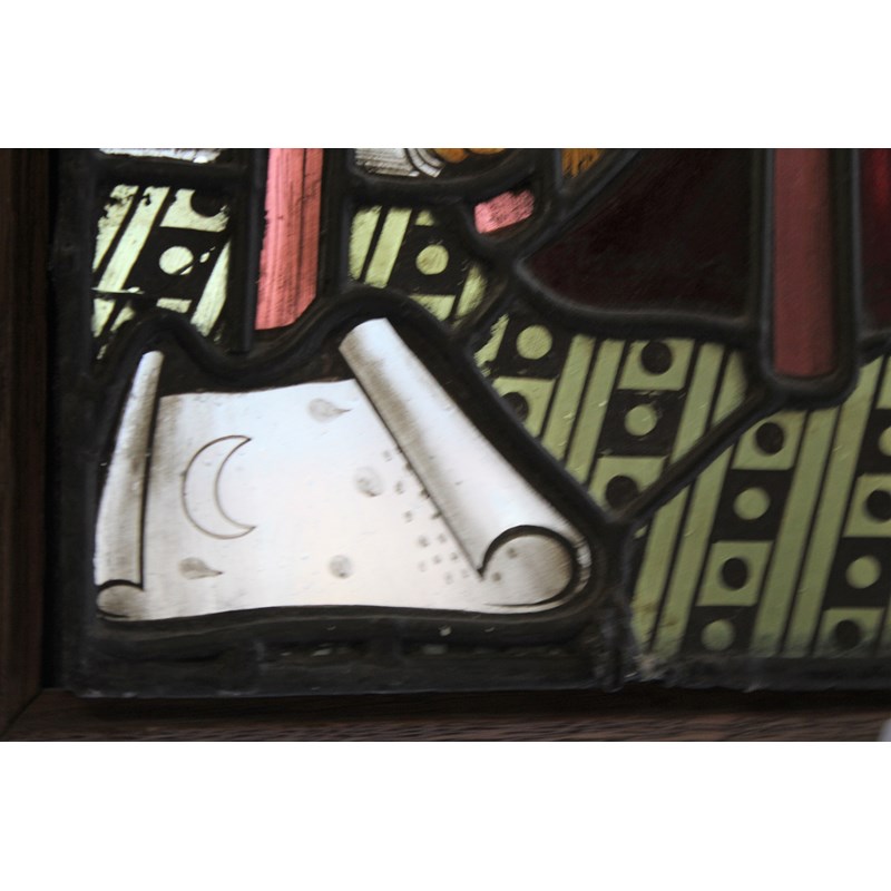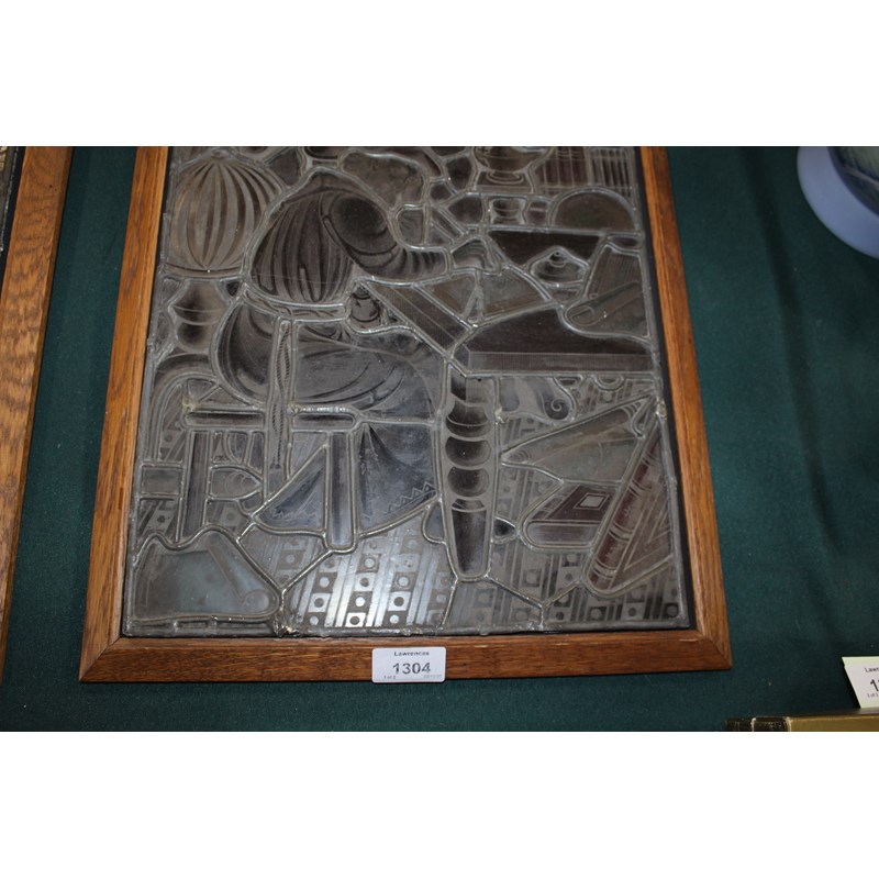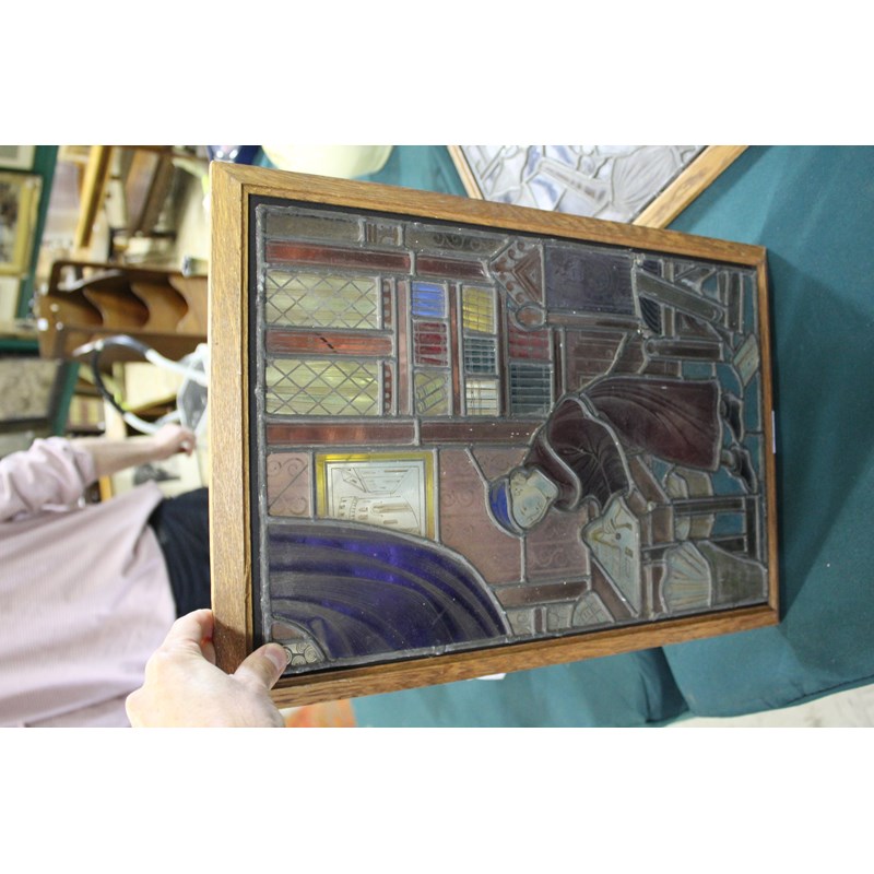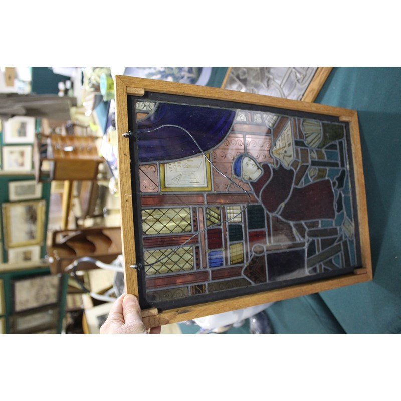 one panel with a depiction of a figure holding a pair of dividers, within a library scene with various books and charts. The other matching panel with a depiction of a scientist, with a telescope and various books and charts. Both mounted in oak frames. Glass 45cms by 30cms, Frame 50cms by 35cms. (2)