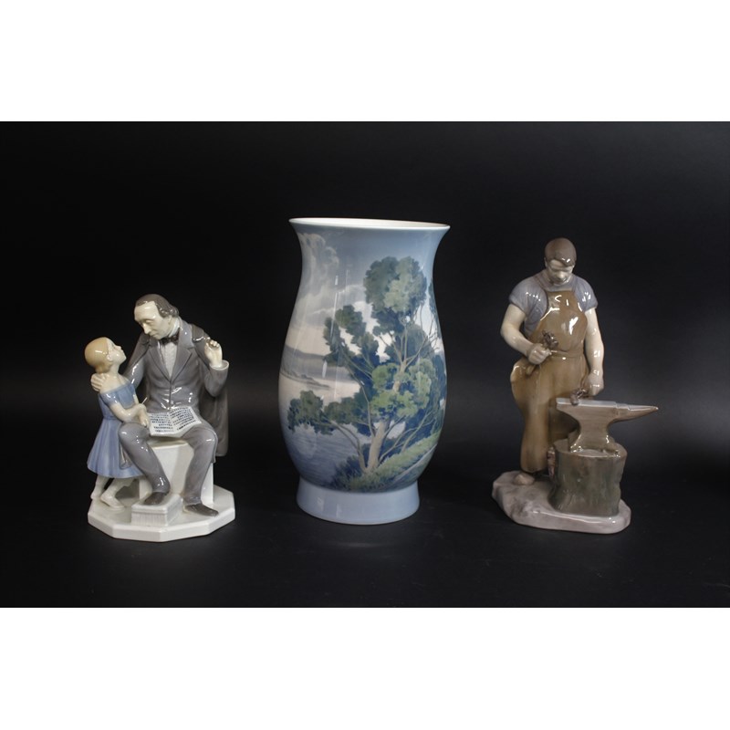 a large figure of a Blacksmith, Model No 2225, also with another large Bing & Grondahl figure of a Teacher and Child, Model No 2037. Also with a large Bing & Grondahl vase with a landscape scene in Denmark, marked to the base Himmelbjerget, 8803-440. Vase 30cms high. (3)
