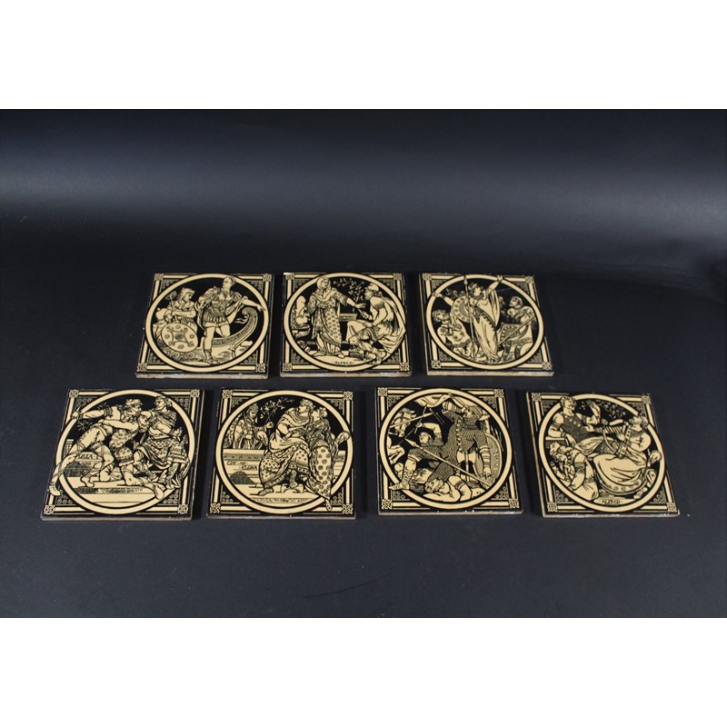 MINTON TILES - MOYR SMITH 7 various tiles designed by Moyr Smith for Mintons, including Alfred, Boadicea, Romans etc. 2 tiles damaged and repaired. (7)