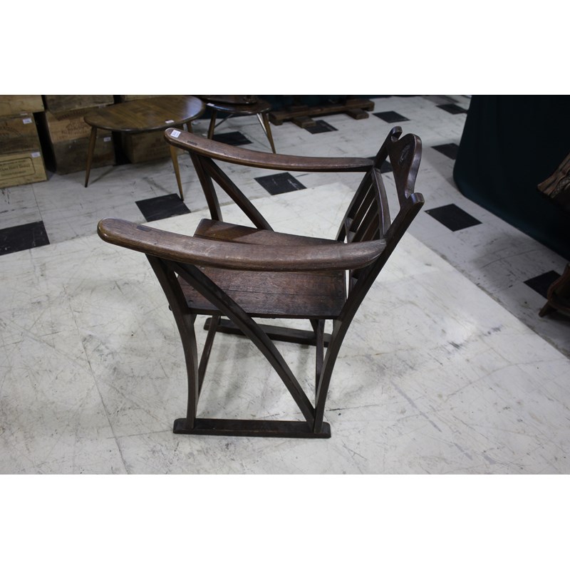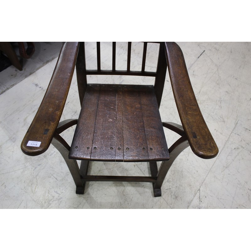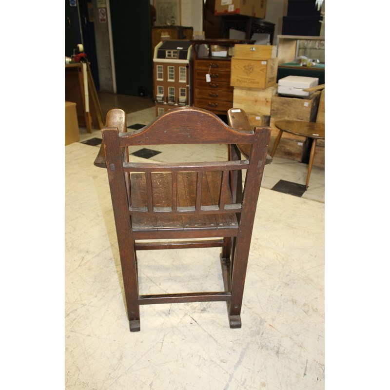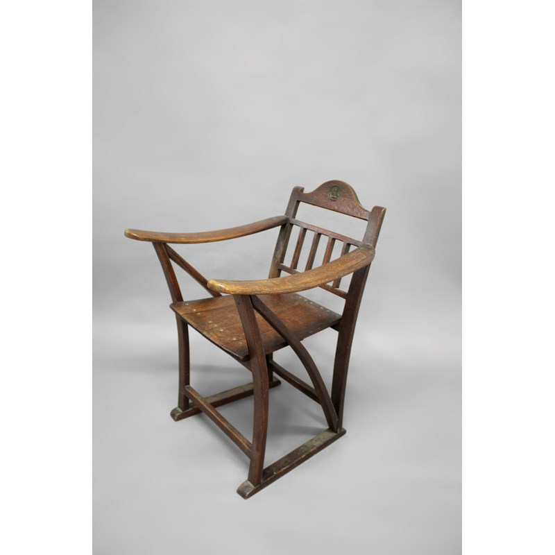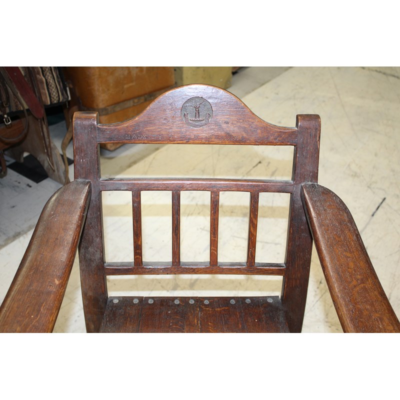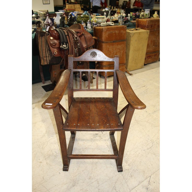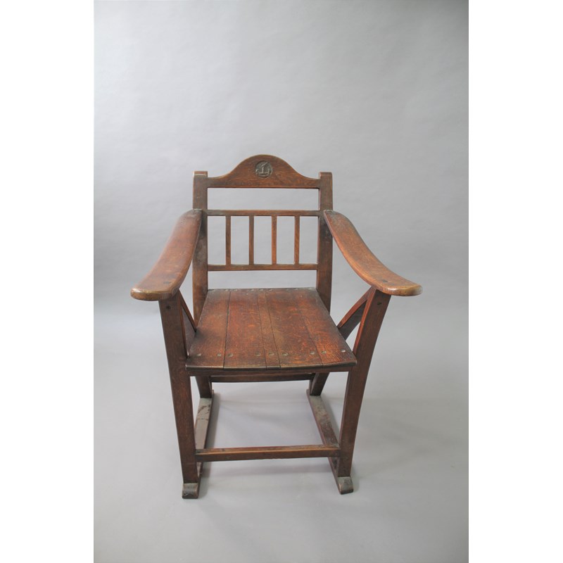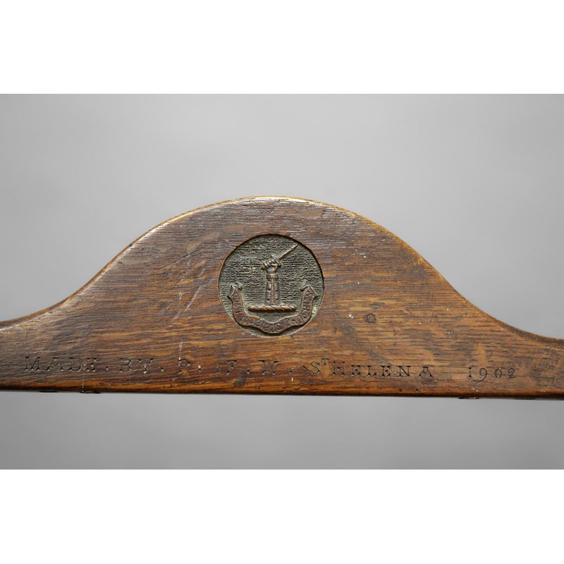an interesting elm chair with panel seat, with wide curved arms supported on curved supports. Back panel carved with crest and Latin motto Post Nubibus Phoebus, Made by P of W, St Helena, 1902. 88cms high