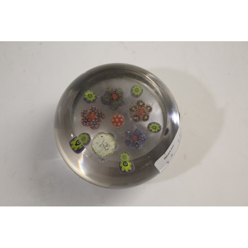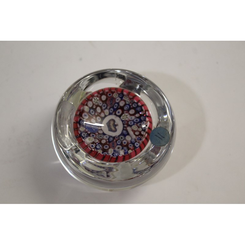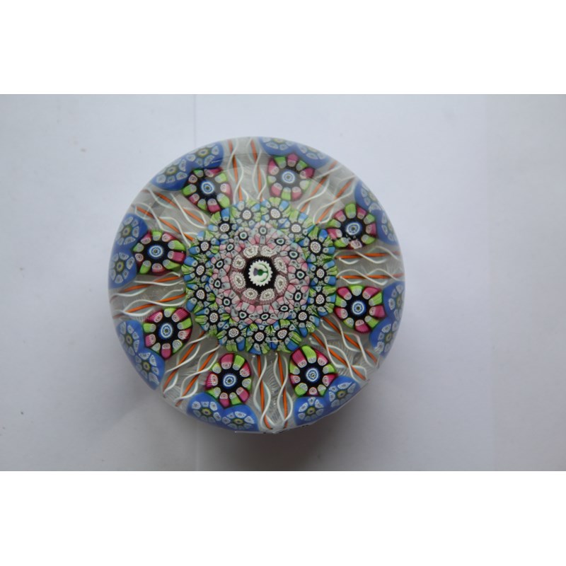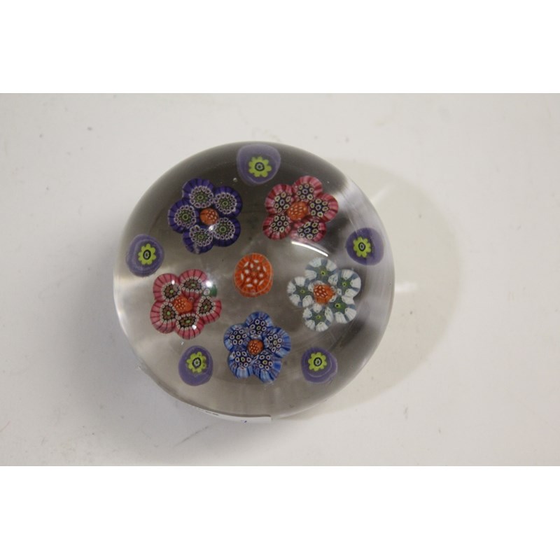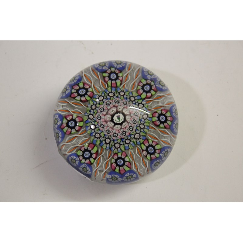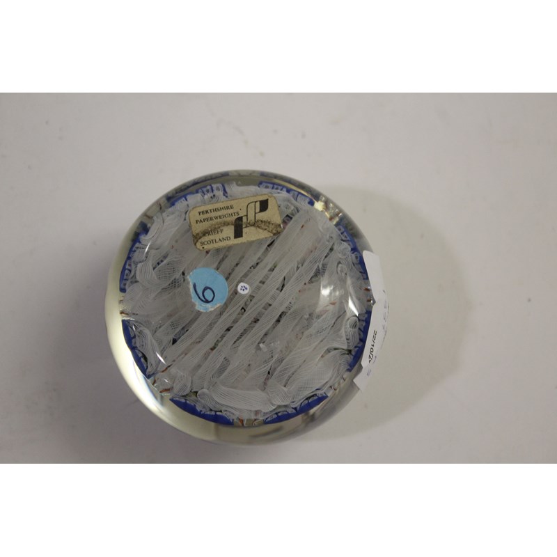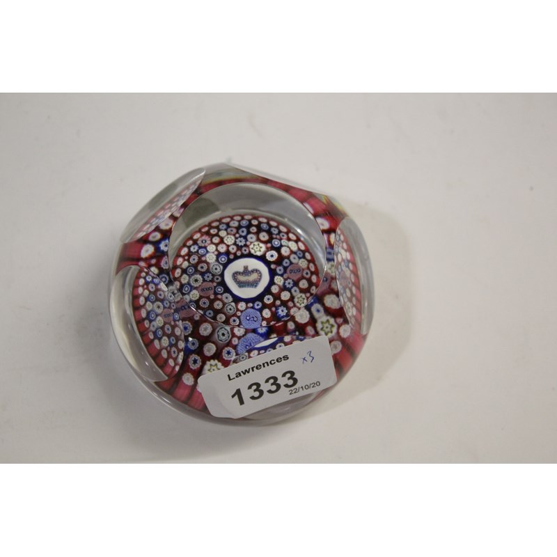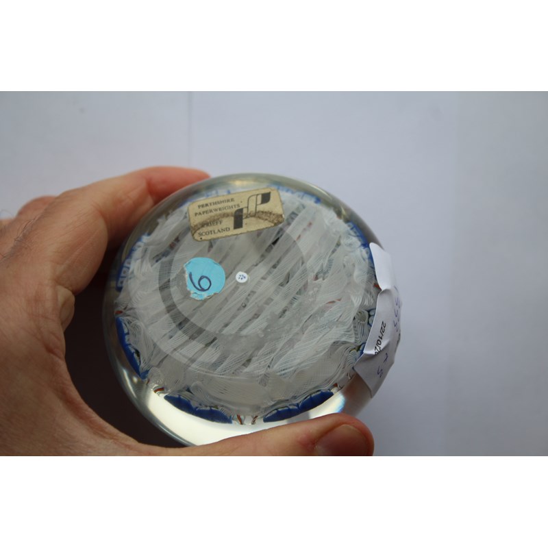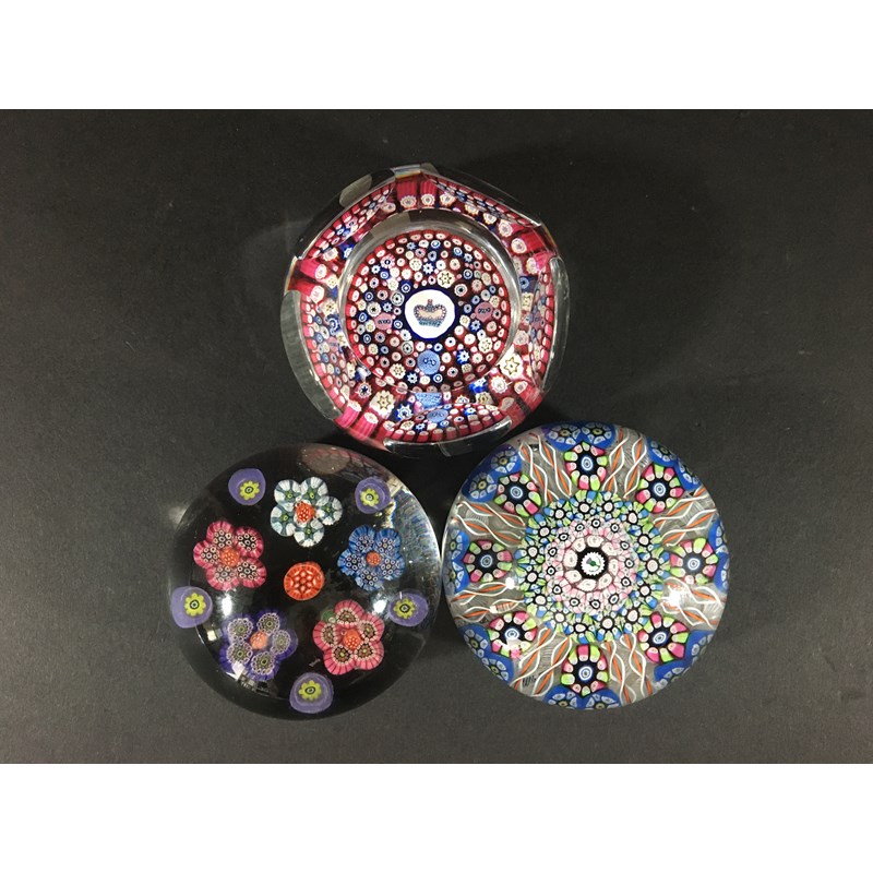 with five cinquefoil flowerheads interspersed with individual canes, diameter 7cm; a Whitefriars Elizabeth II Silver Jubilee commemorative paperweight and a Perthshire paperweight with a central thistle cane, the base with a P1975 cane (3)