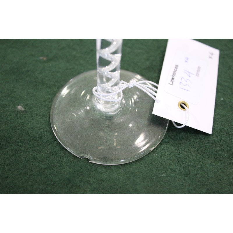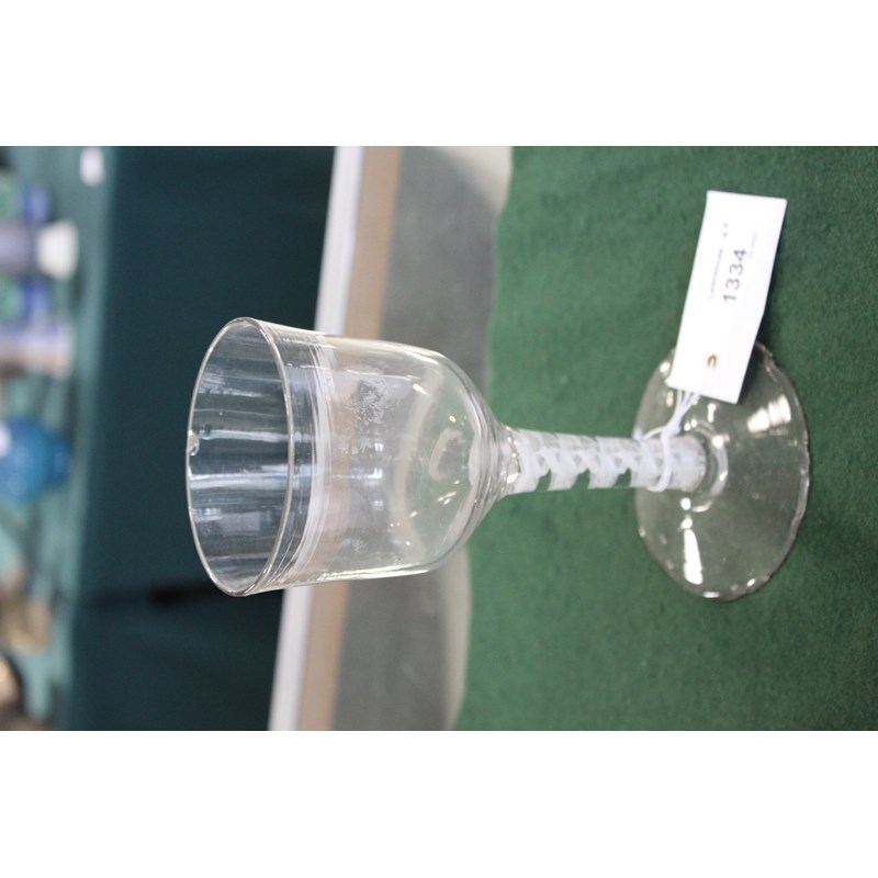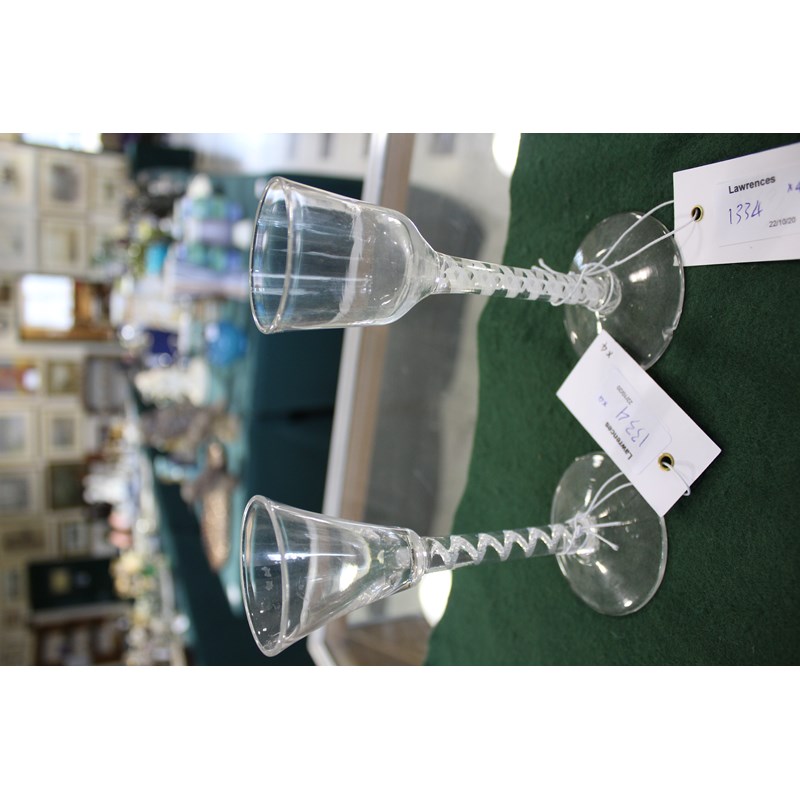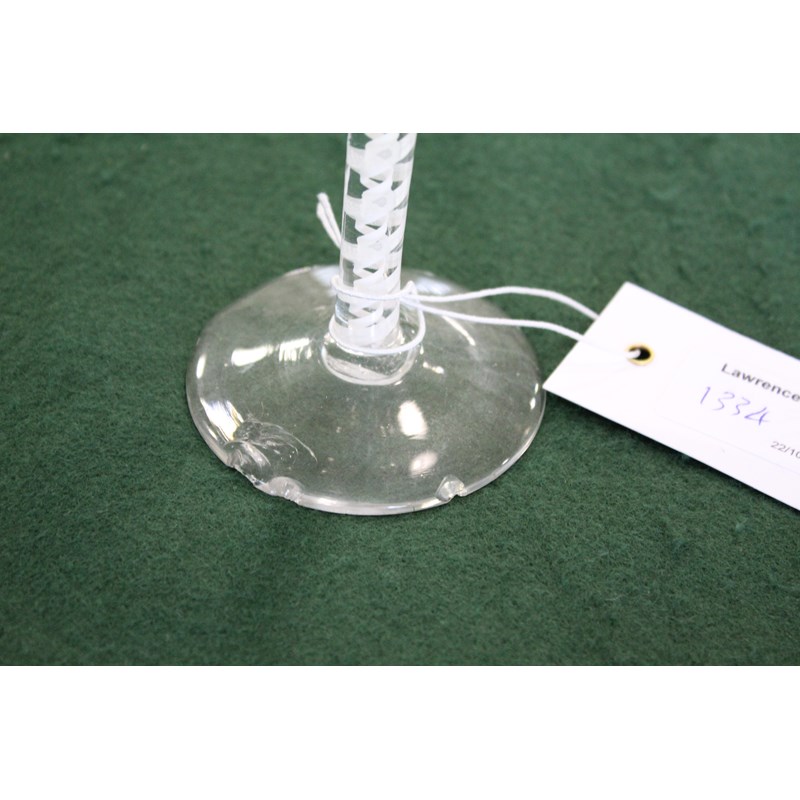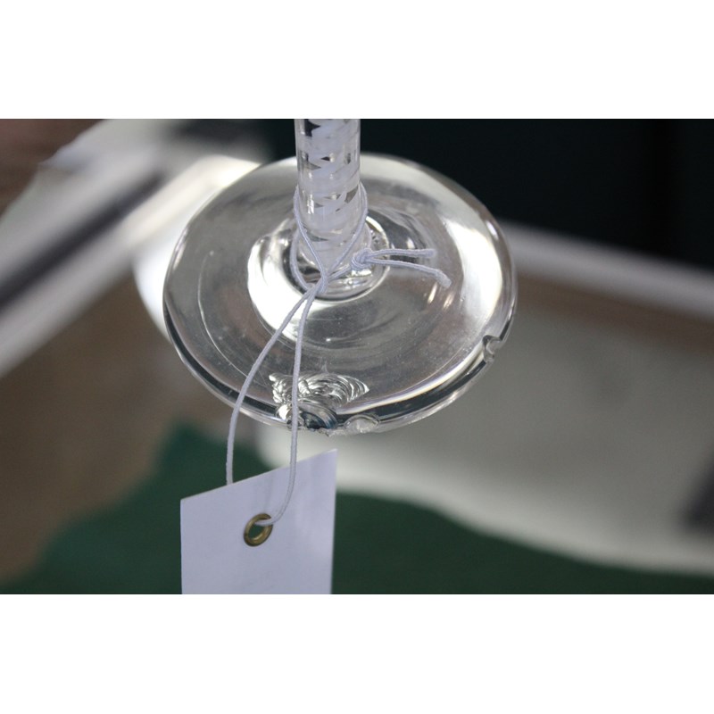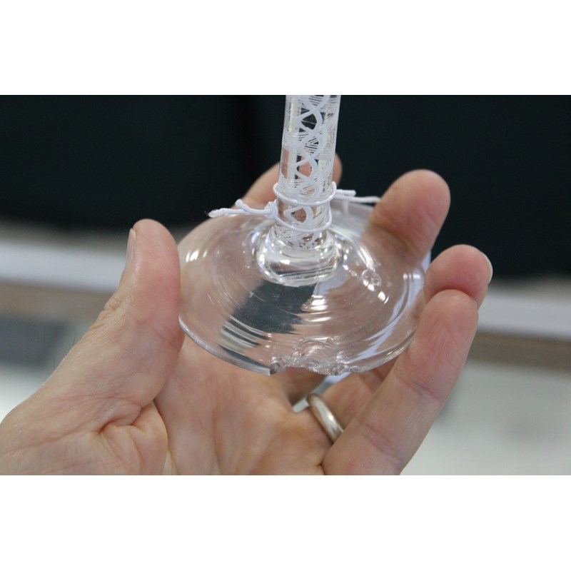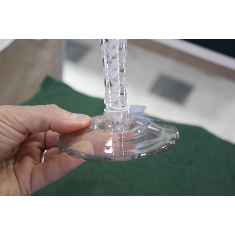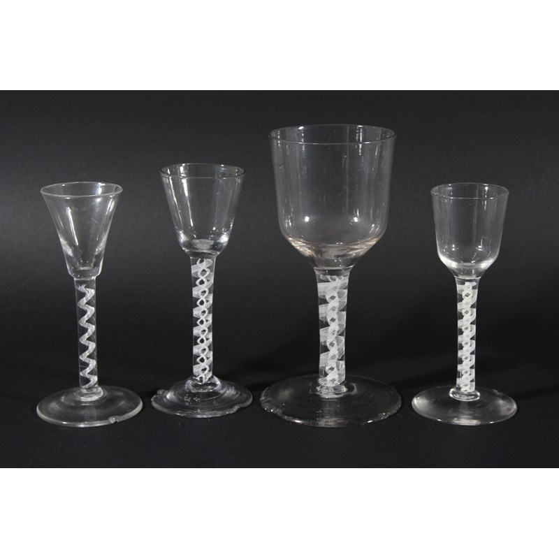 later 18th century, the ogee shaped bowl above a stem with a central double helix inside a multi-strand spiral, height 18.3cm; together with two further enamel twist wine glasses with similar stems and an air twist wine glass (4)