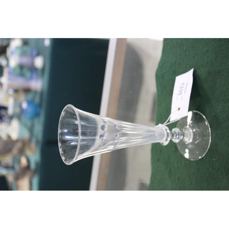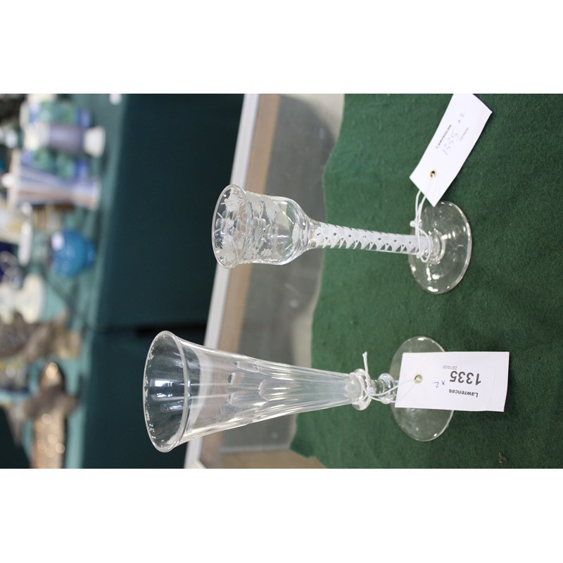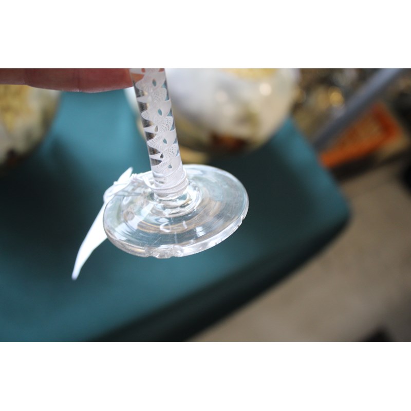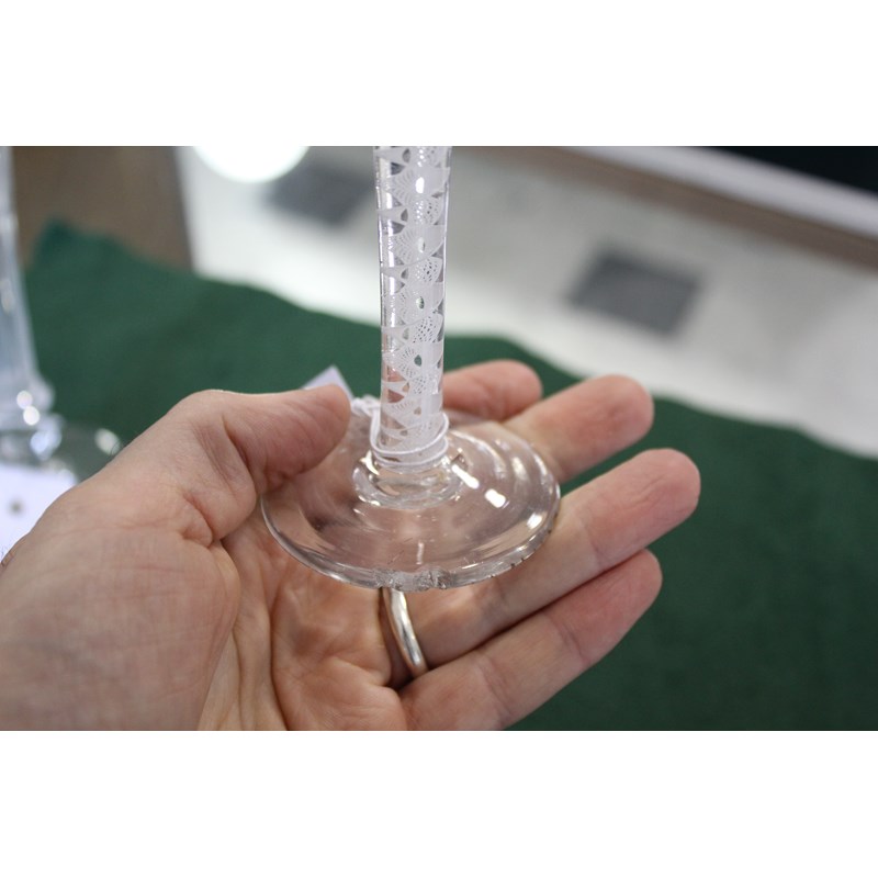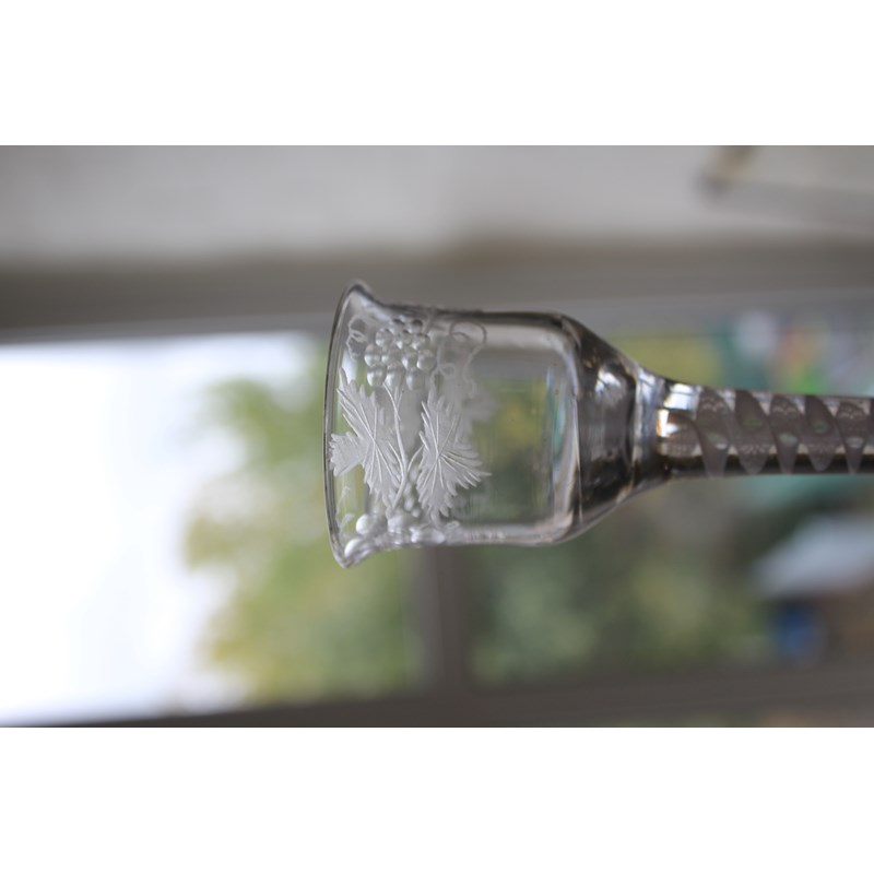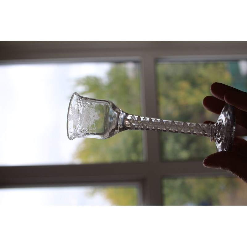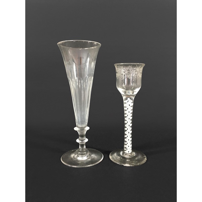 later 18th century, the ogee bowl engraved with fruiting vines on a stem with a multistrand and ribbon double helix and spreading foot, height 15cm; together with an ale glass with a faceted body, knopped stem and spreading foot, height 18cm (2)