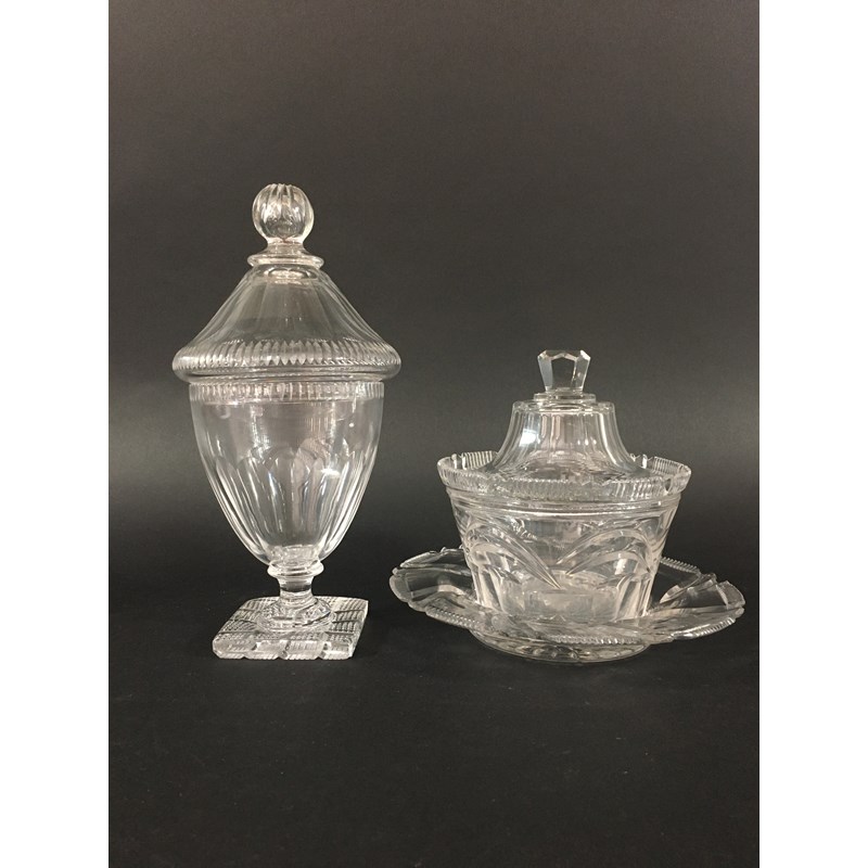 later 18th century, with faceted bodies and cut rims on a geometric cut foot, height 23cm; together with a Georgian glass circular butter dish, cover and stand, with similar faceted and cut decoration, saucer diameter 17.5cm (2)
