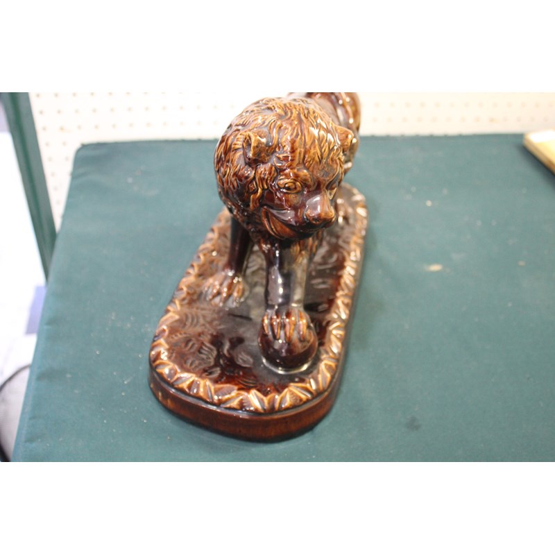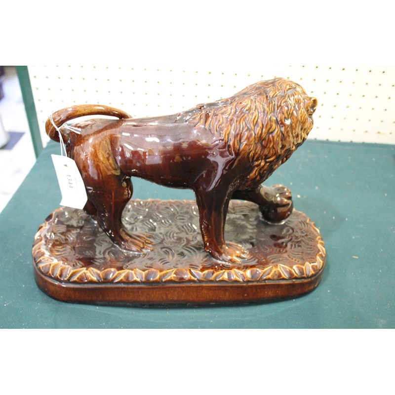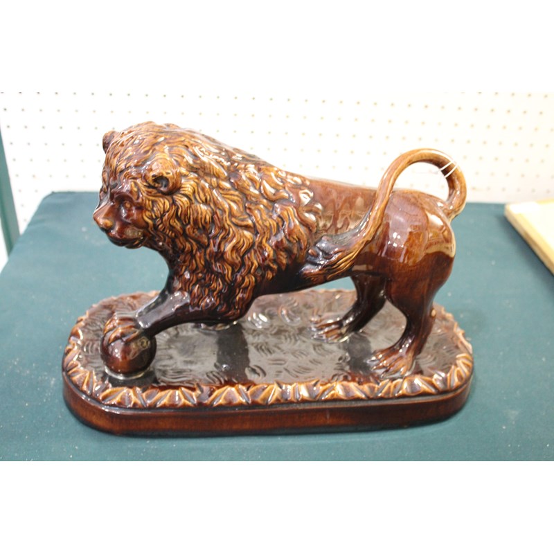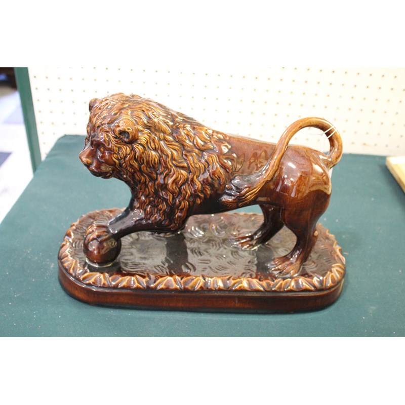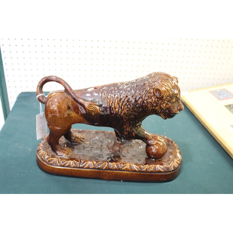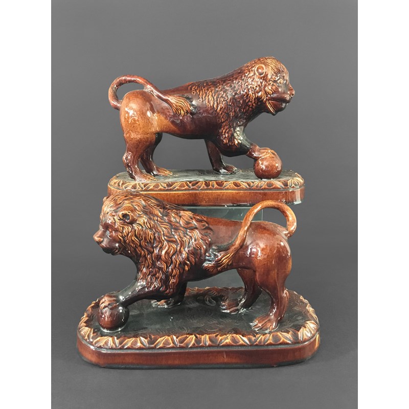 PAIR OF TREACLE GLAZED 'MEDICI' LIONS 19th century, facing left and right, on oval bases, height 27cm, width 40cm (2)