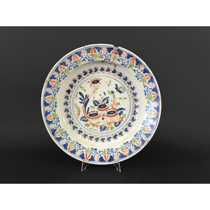 ENGLISH DELFT CHARGER mid 18th century, painted with flowers inside heart and floral borders, diameter 34cm