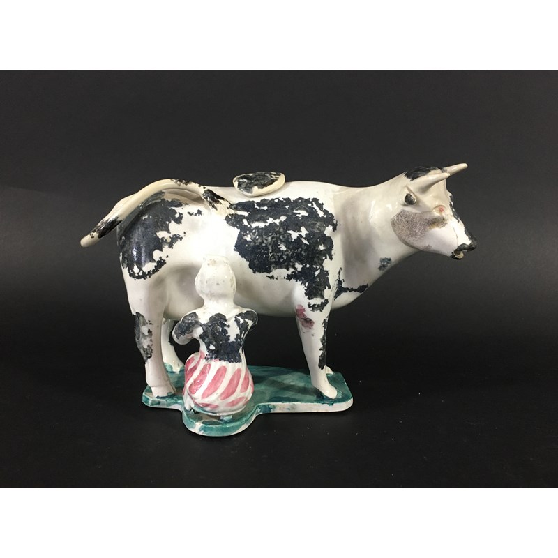 NORTH COUNTRY PEARLWARE COW CREAMER AND MAID early 19th century, with black sponged decoration on a green base, length 21cm