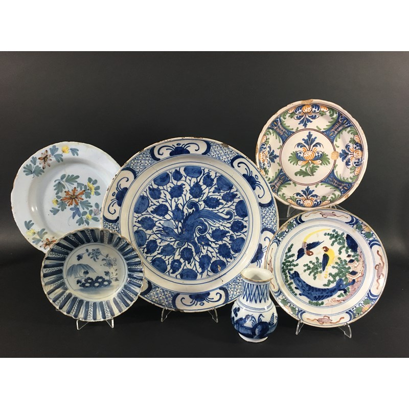 early/mid 18th century, possibly Lambeth, blue painted with a bird in foliage, diameter 34cm; an ointment jar with chinoiserie bird and floral decoration, height 12cm; and four delft plates, English and Dutch, diameters 22cm approx (6)