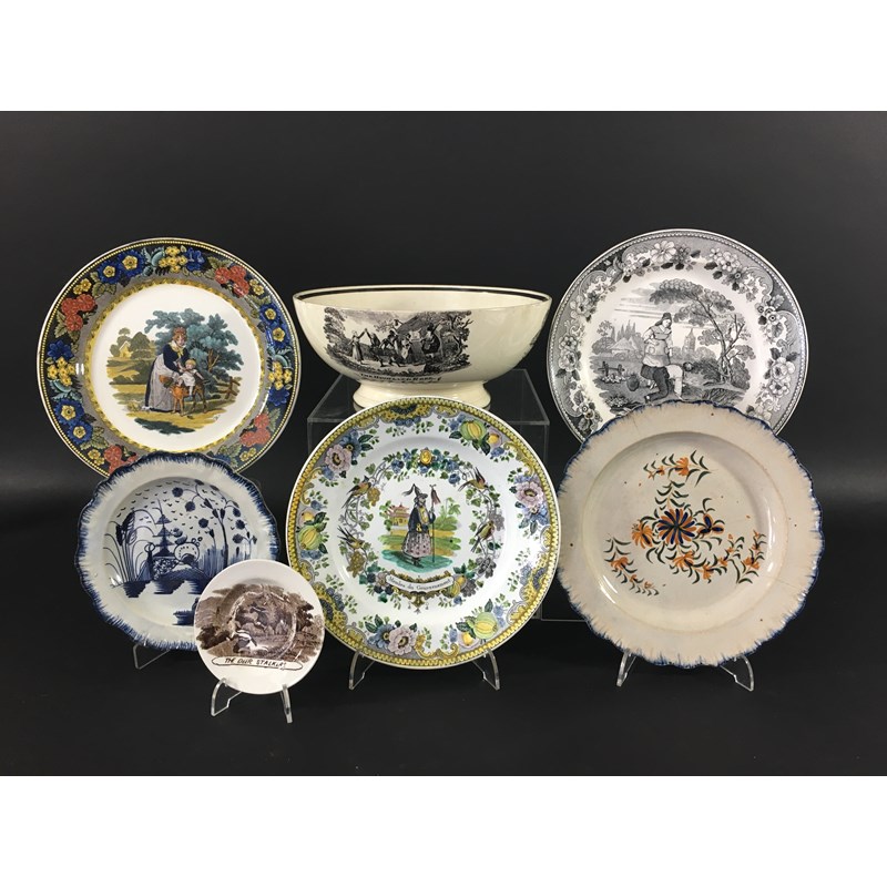 a creamware bowl, black transfer printed, diameter 22cm; together with a creamware jug black printed with exotic birds, a plate with a print titled La Source, a miniature plate titled The Deer Stalkers and a collection of French printed creamware plates (19)