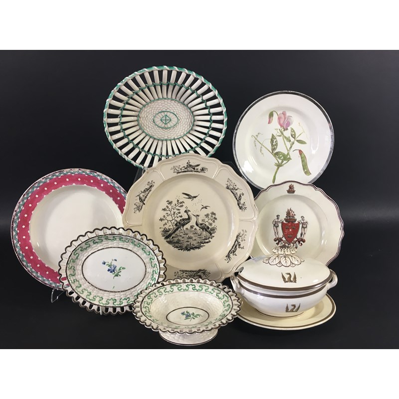 WEDGWOOD CREAMWARE SAUCE TUREEN AND COVER early 19th century, decorated with a crest; together with a collection of other creamware including an armorial plate, coffee pot and cover, baskets, plates and other items, (24)