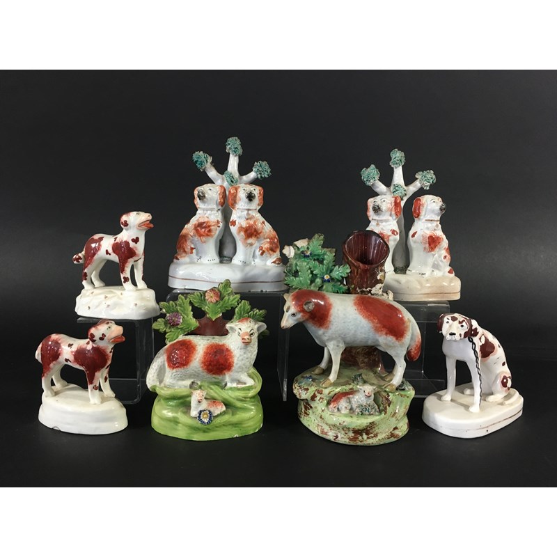 early 19th century, one before a spill vase, height 16cm; together with a pair of Staffordshire spaniel groups and three Staffordshire hounds (7)
