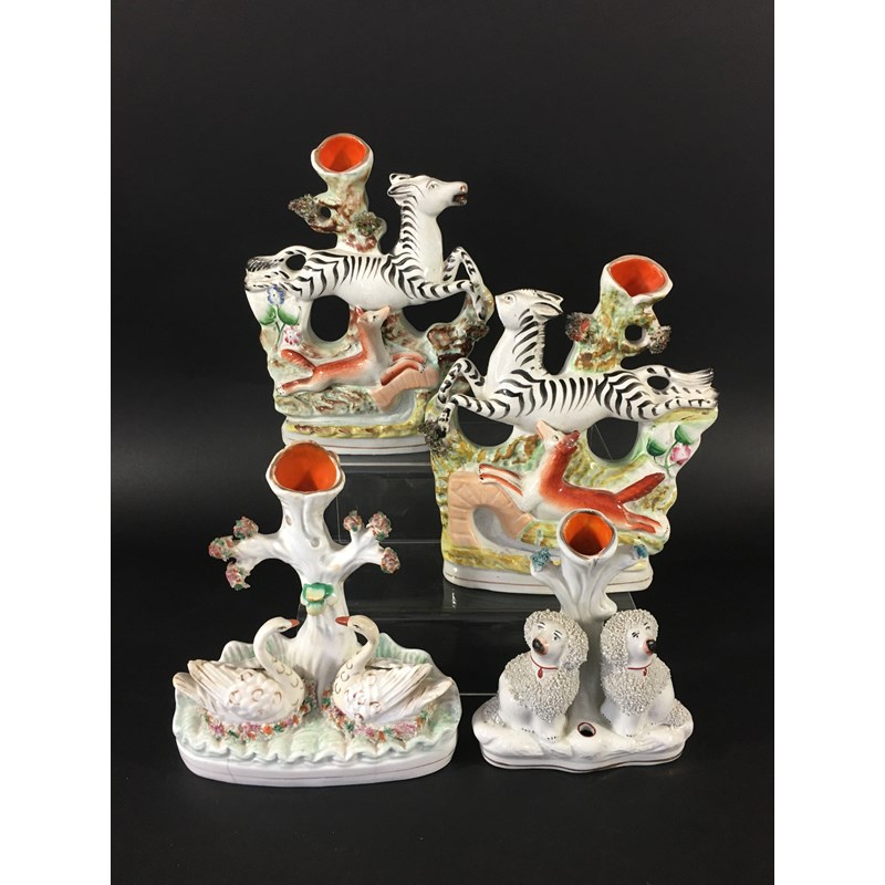 PAIR OF STAFFORDSHIRE ZEBRA AND FOX SPILL VASES the animals leaping over a stream and bridge, height 20cm; together with a spill vase with a pair of swans and another with a pair of spaniels (4)