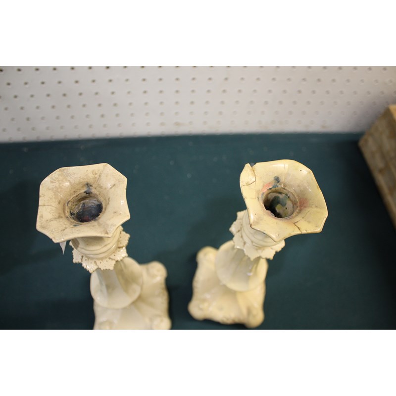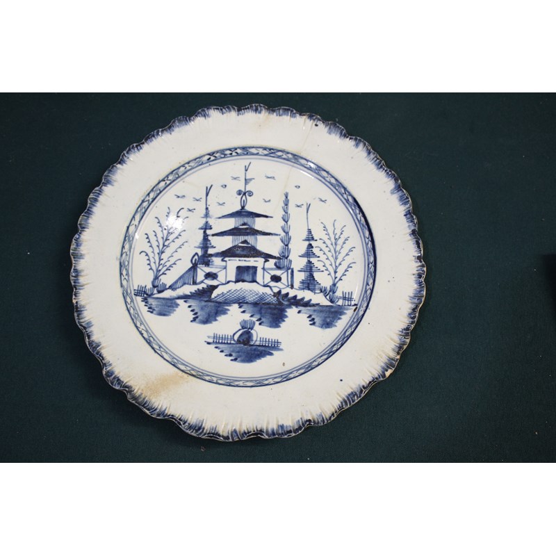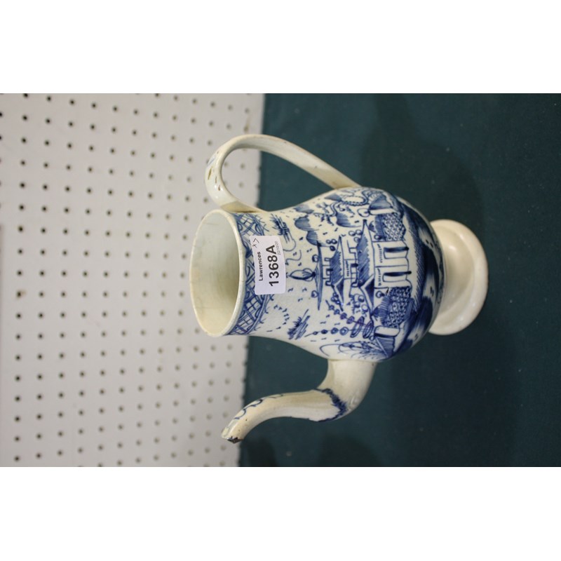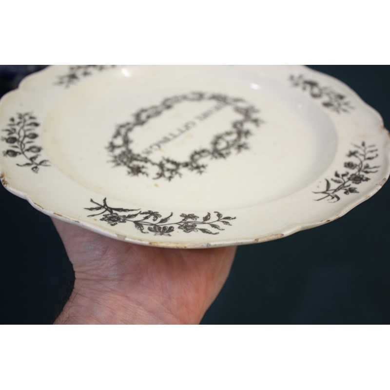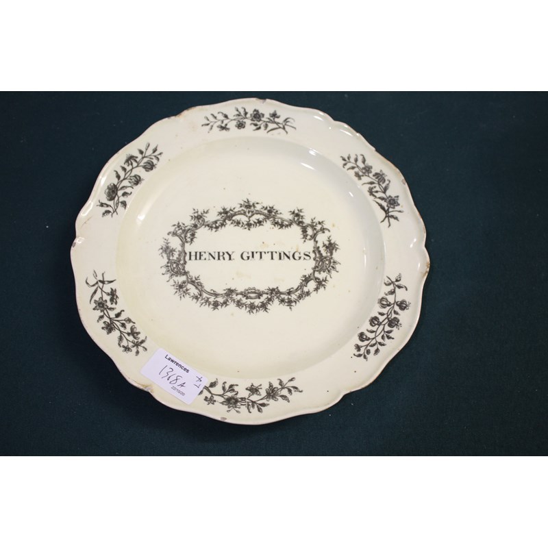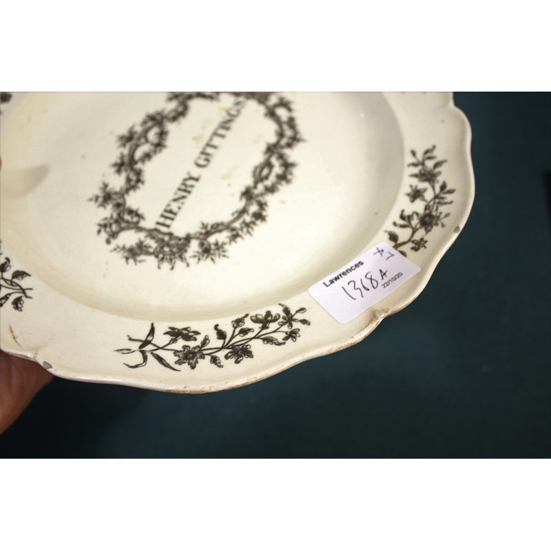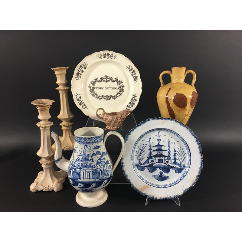 late 18th century, with brown sponged decoration, length 12cm; a creamware plate inscribed Henry Gittings; a pearlware plate with a chinoiserie scene; a pearlware coffee pot, a pair of creamware candlesticks and a slipware flagon (7)