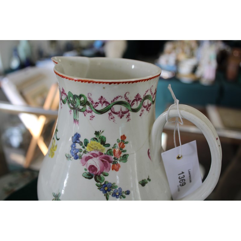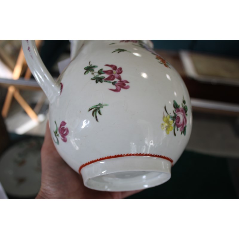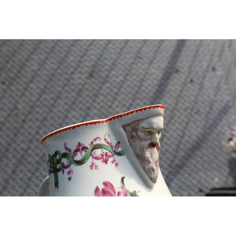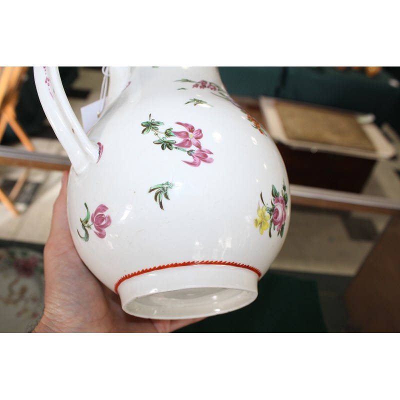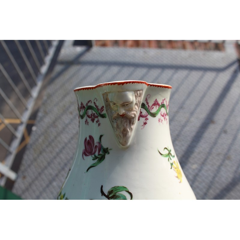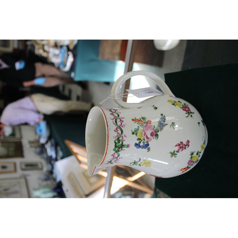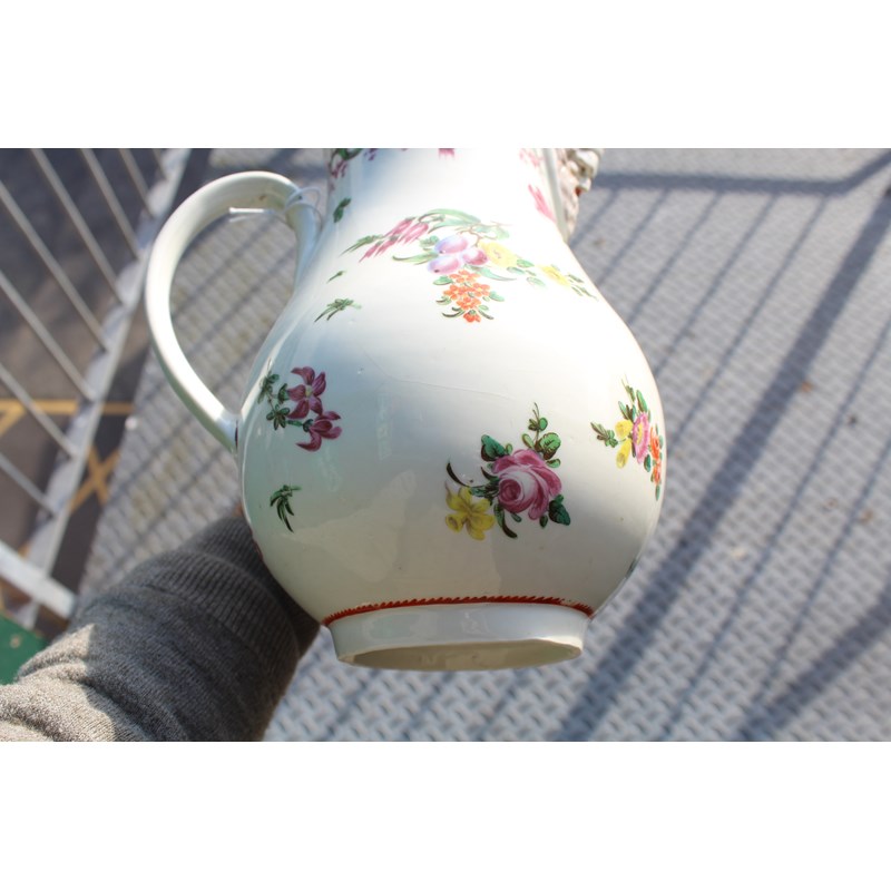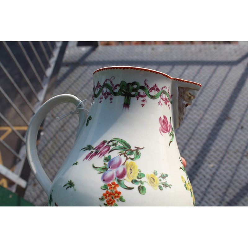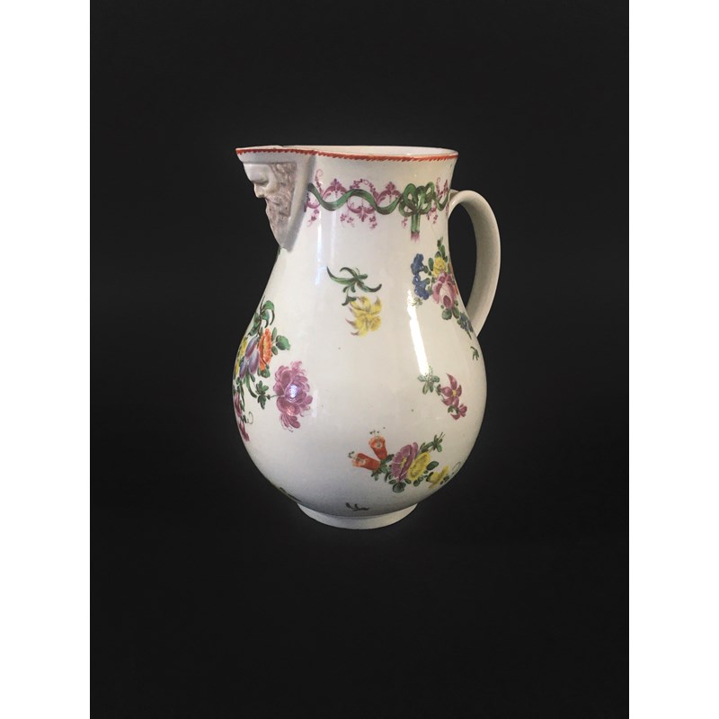 COOKWORTHY BRISTOL PORCELAIN MASK JUG painted with floral sprays beneath a moulded mask spout and floral ribbon to the rim, height 22cm