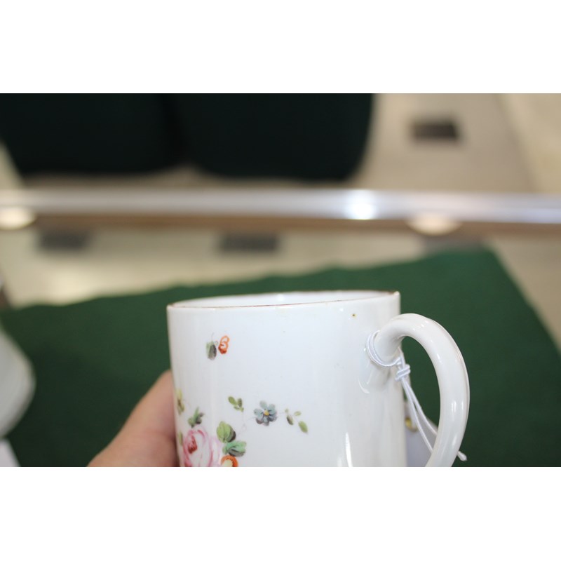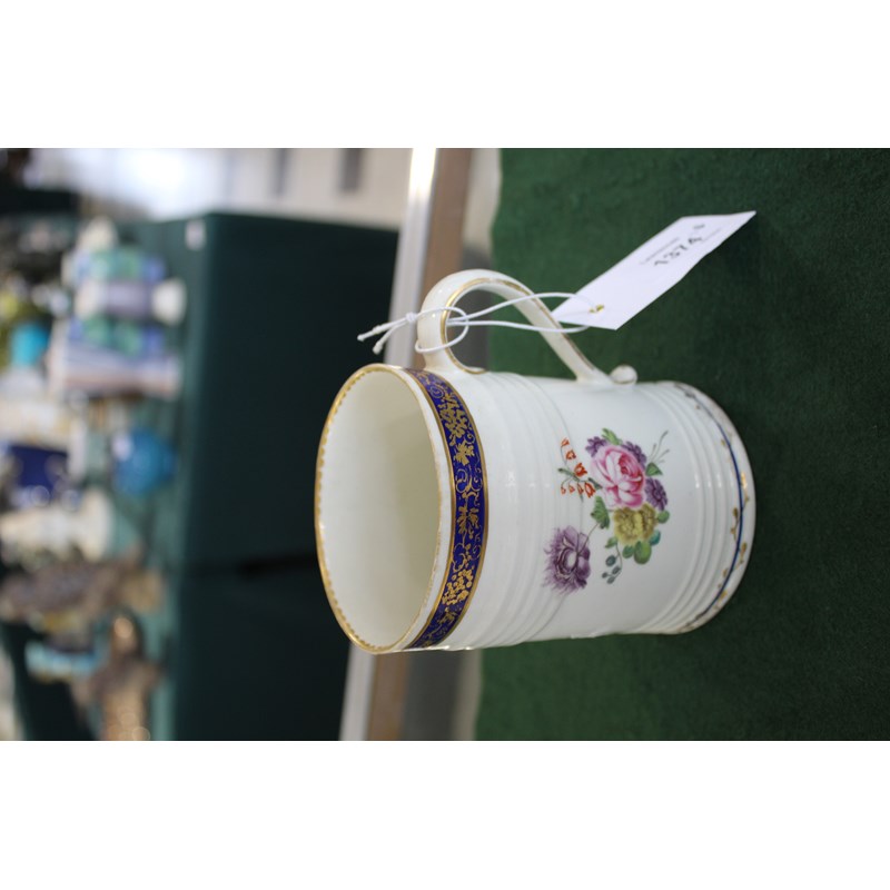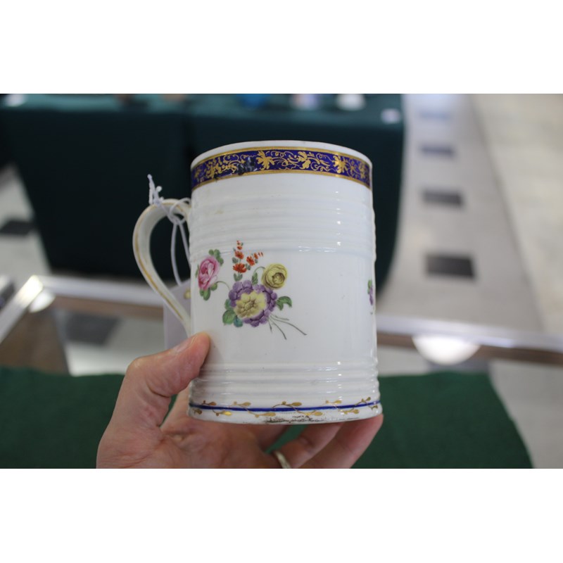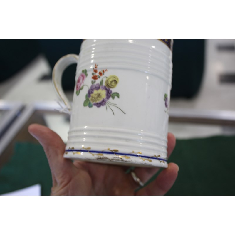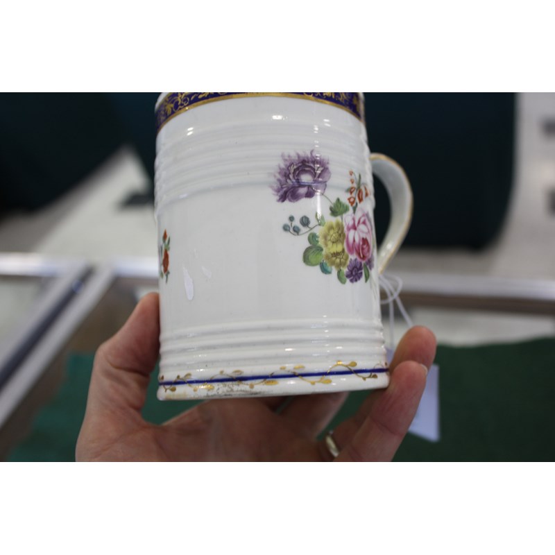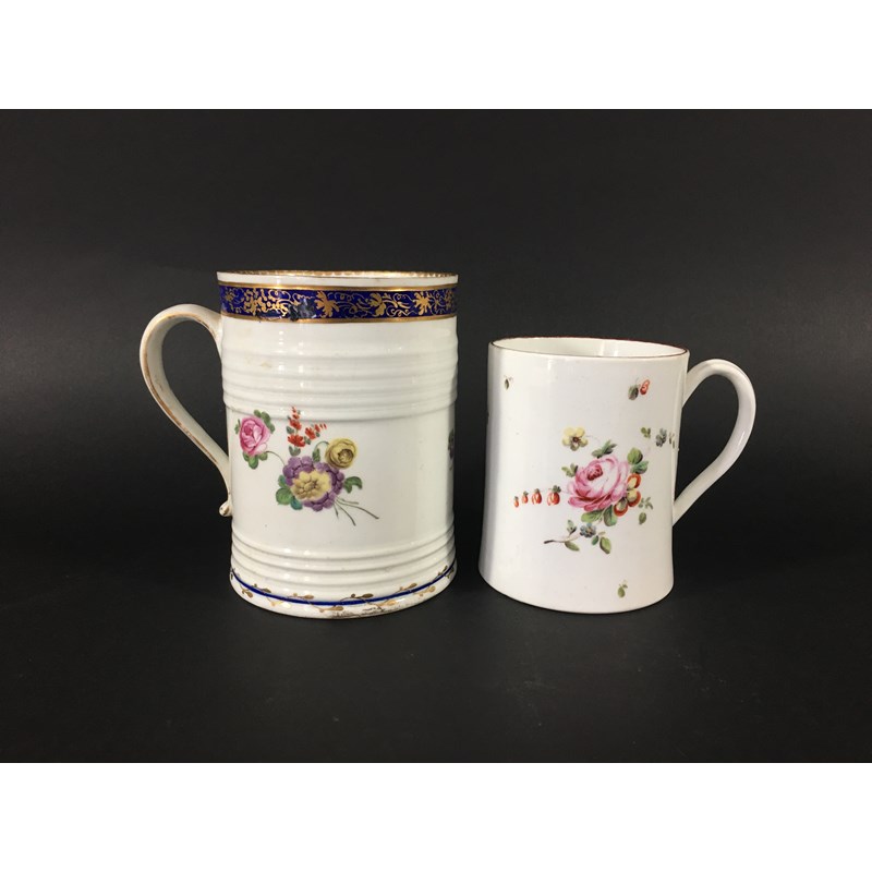 DERBY GLASS BOTTOMED MUG painted with floral sprays between blue and gilt rim and foot, height 12cm; together with another Derby mug painted with Withers' style flowers, 9cm (2) Provenance: glass bottomed mug with Foden Collection sticker, number 177