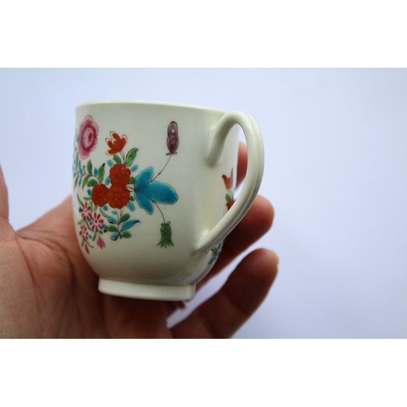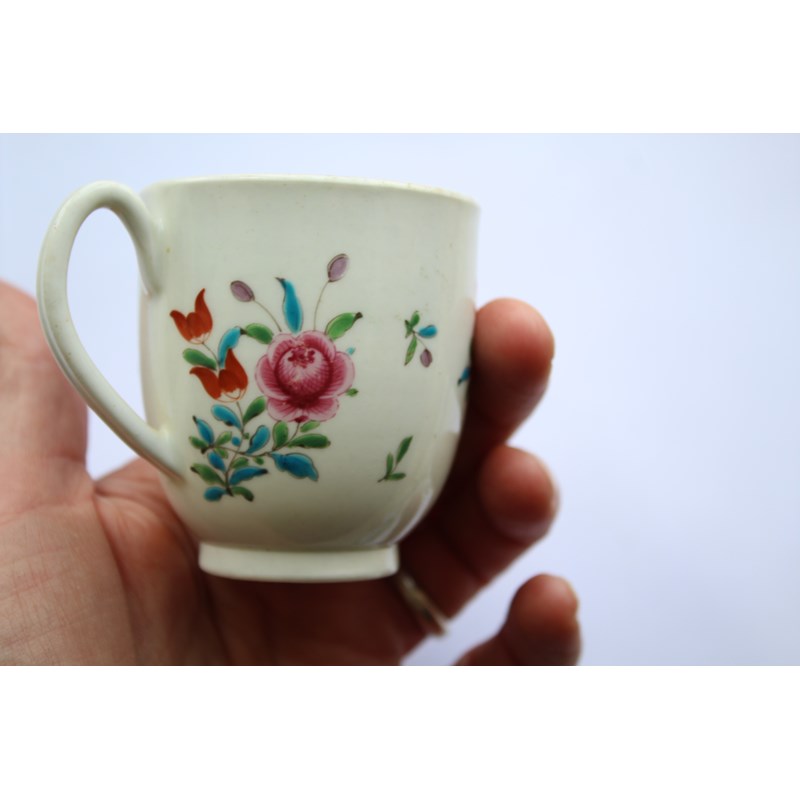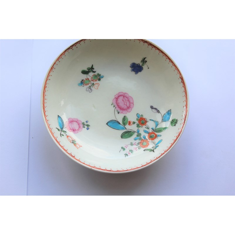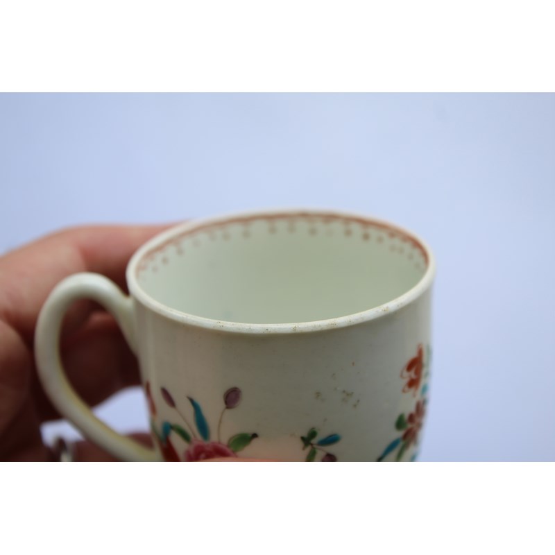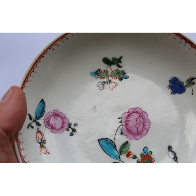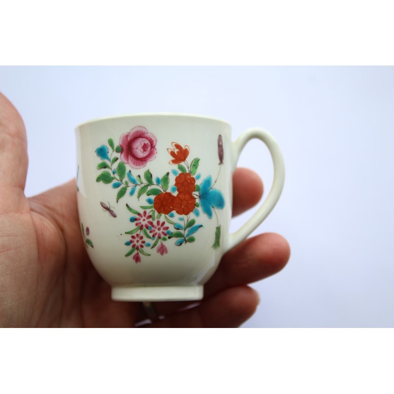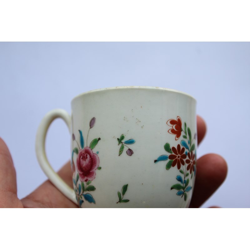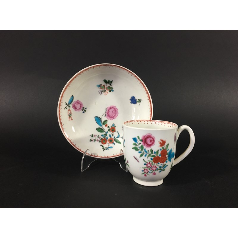 WORCESTER COFFEE CUP AND SAUCER circa 1765-70, with painted and enamelled floral sprays inside in iron red border, diameter 12cm