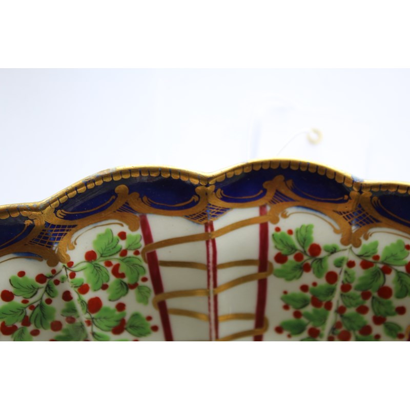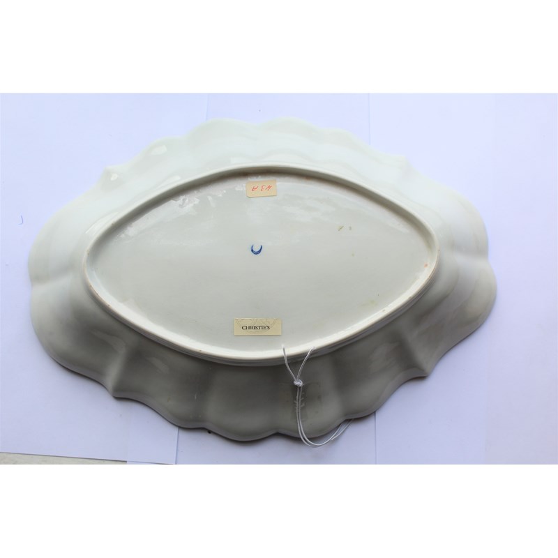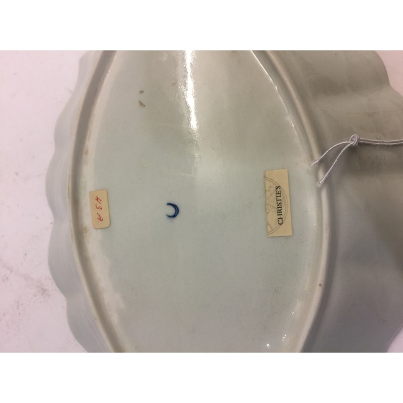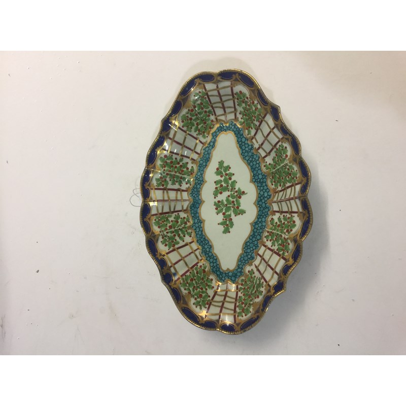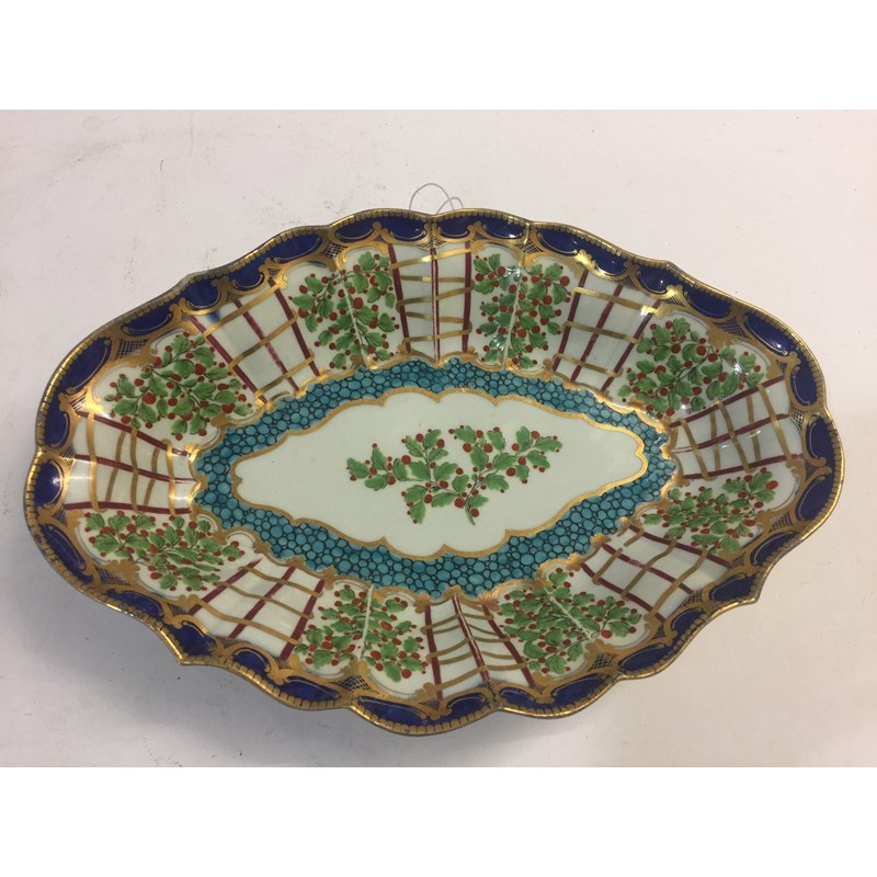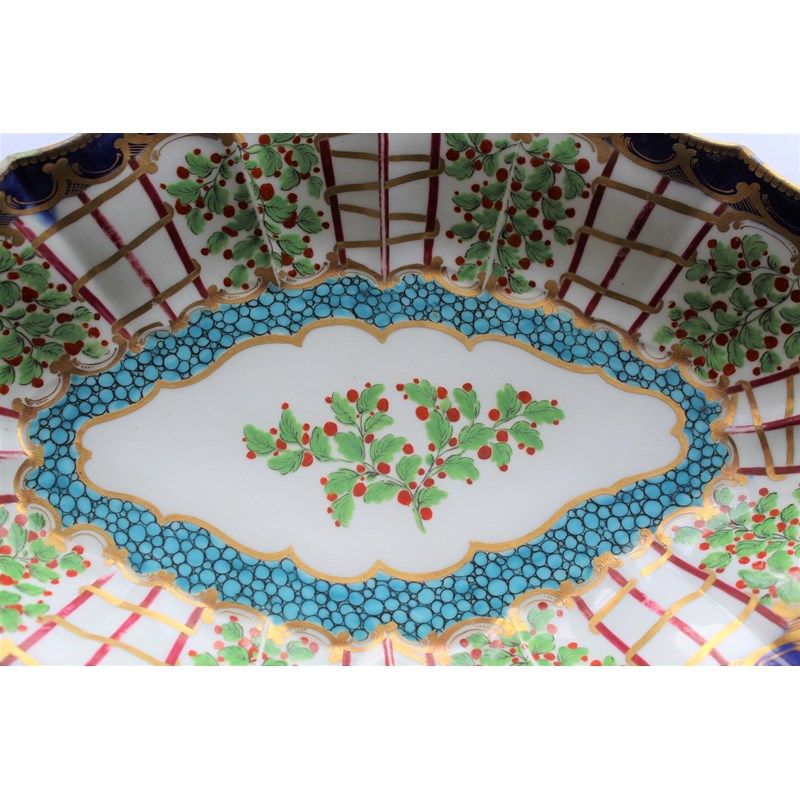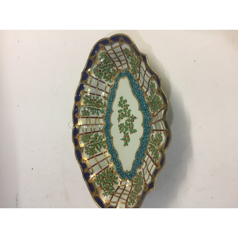 WORCESTER HOP TRELLIS DISH circa 1775, a floral spray inside a border of alternating trellis and hops and a blue and gilt border, open crescent mark, paper collection and Christies labels, length 29cm