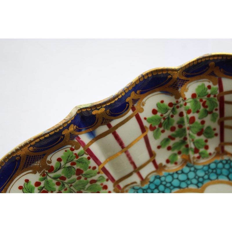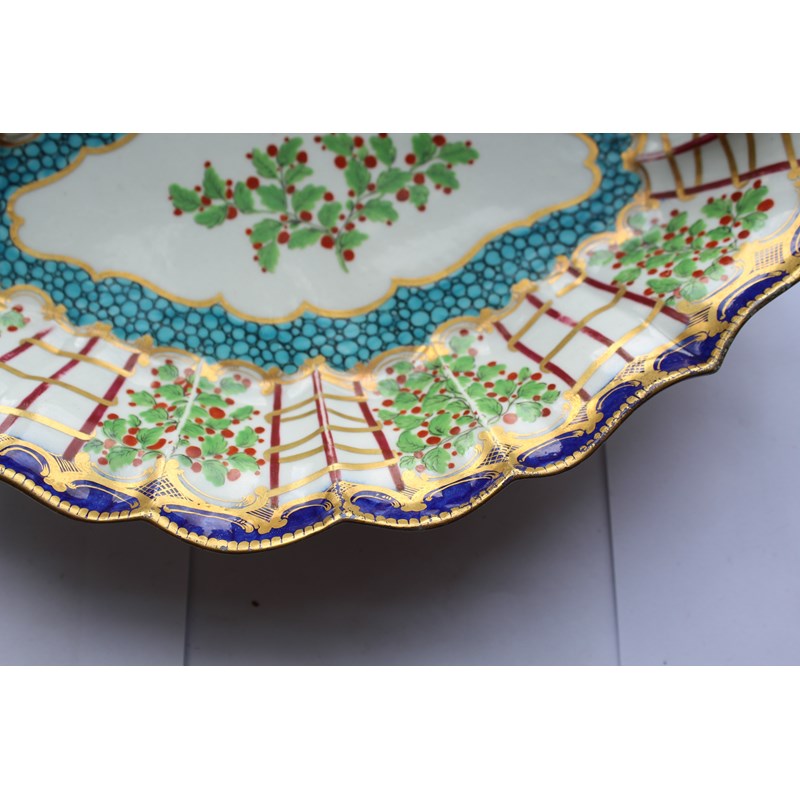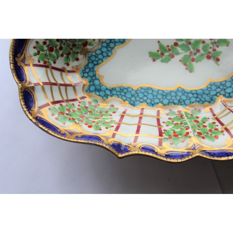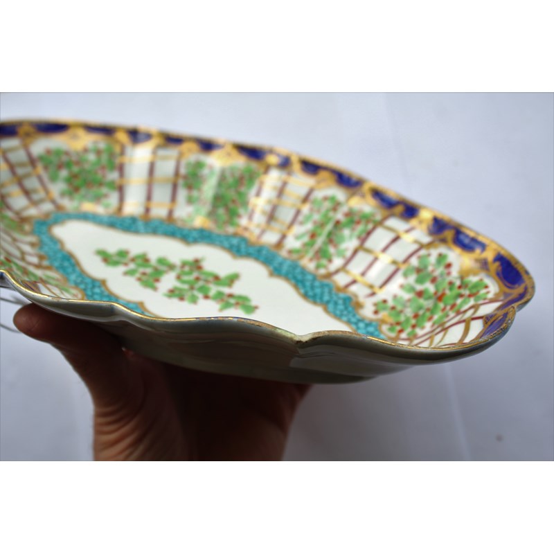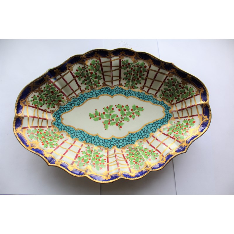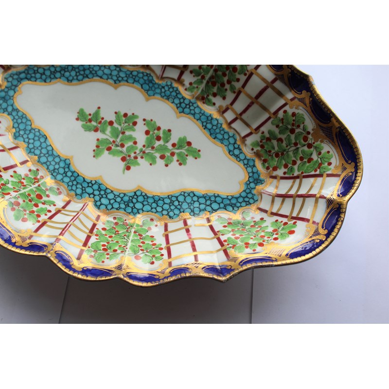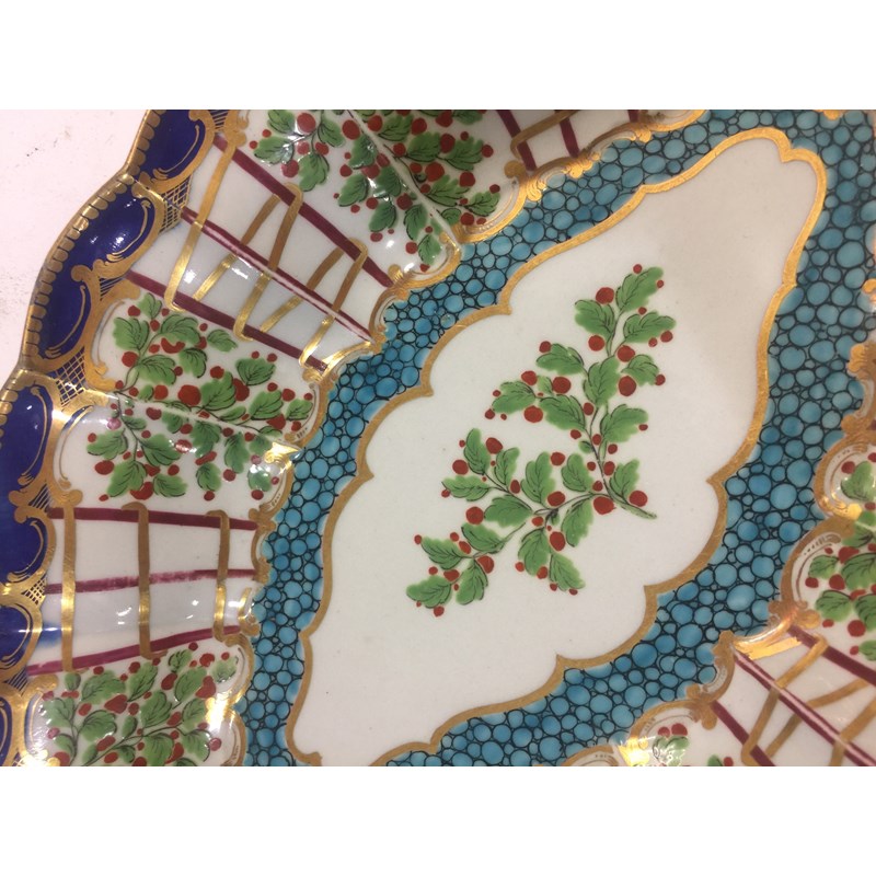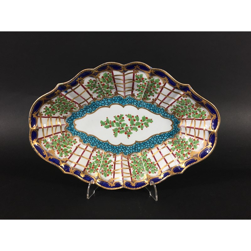 WORCESTER HOP TRELLIS DISH circa 1775, a floral spray inside a border of alternating trellis and hops and a blue and gilt border, open crescent mark, paper collection and Christies labels, length 29cm