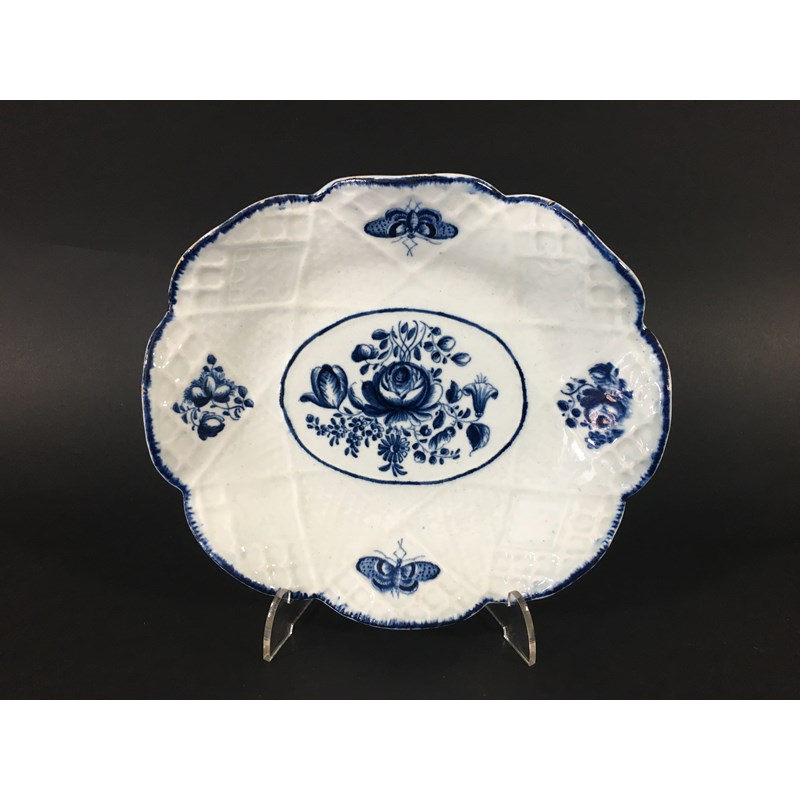BOW MOULDED DISH circa 1755-60, blue painted with flowers and butterflies on a moulded ground, length 20cm