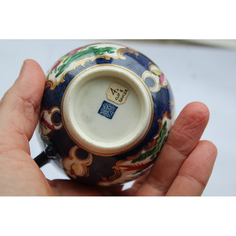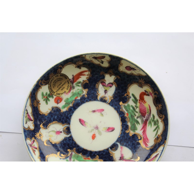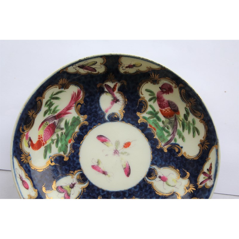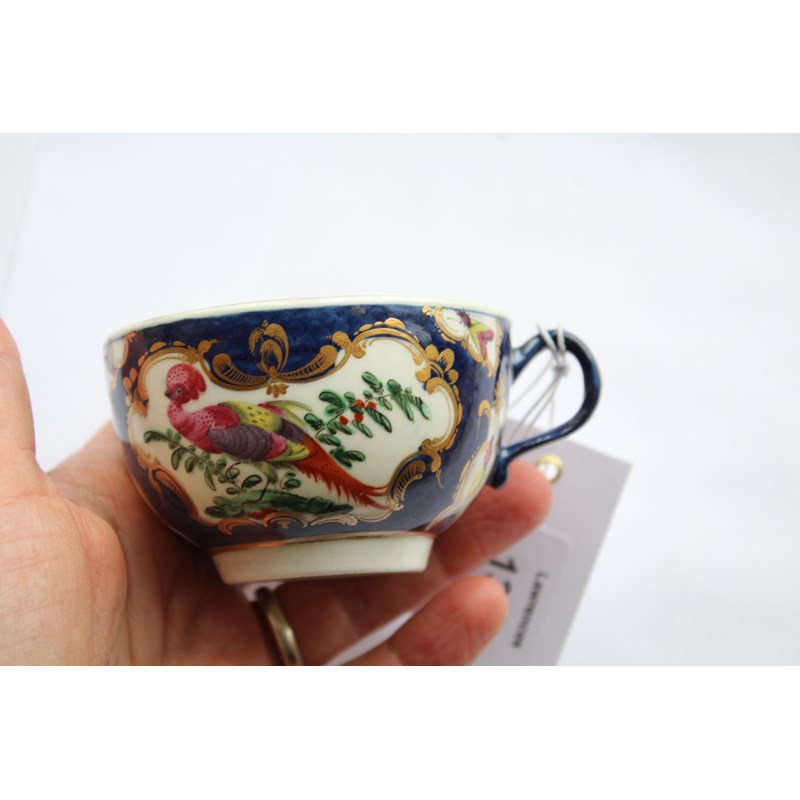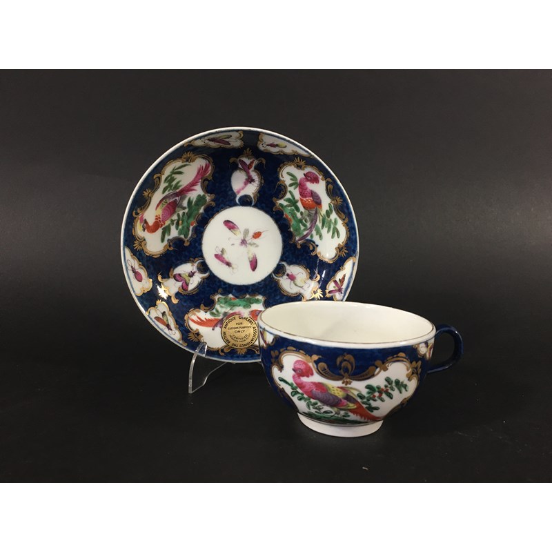 WORCESTER BLUE SCALE TEACUP AND SAUCER circa 1770, gilt mirror shaped cartouches painted with birds and insects, blue fret mark, paper collection label and gilt BADA sticker, diameter 13cm