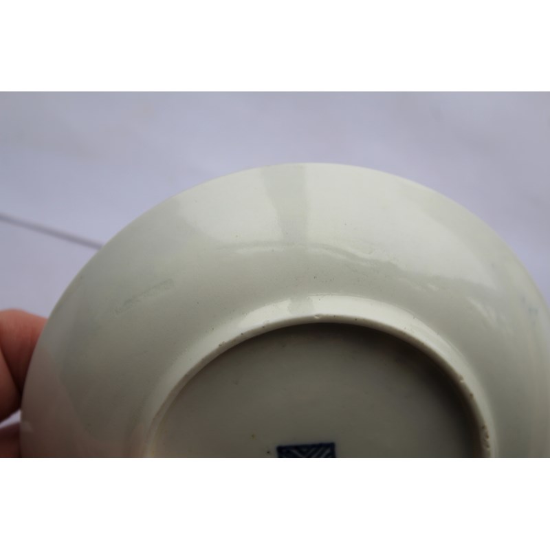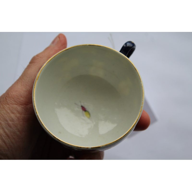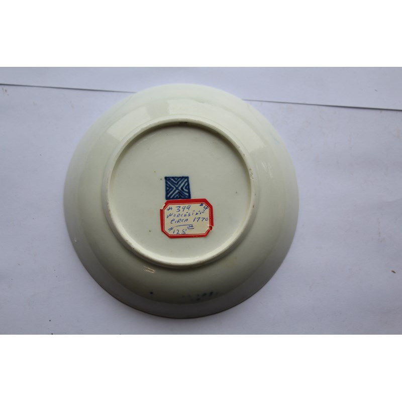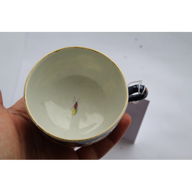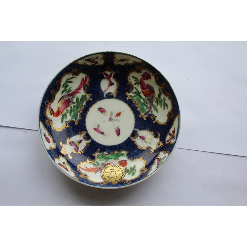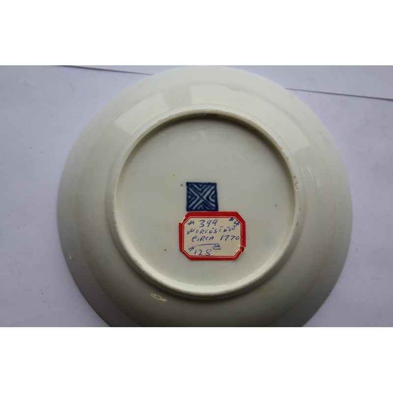 WORCESTER BLUE SCALE TEACUP AND SAUCER circa 1770, gilt mirror shaped cartouches painted with birds and insects, blue fret mark, paper collection label and gilt BADA sticker, diameter 13cm