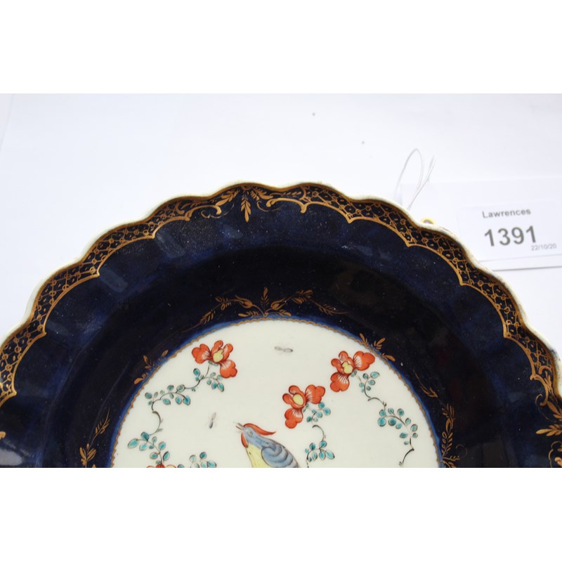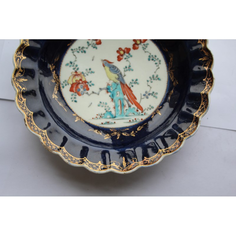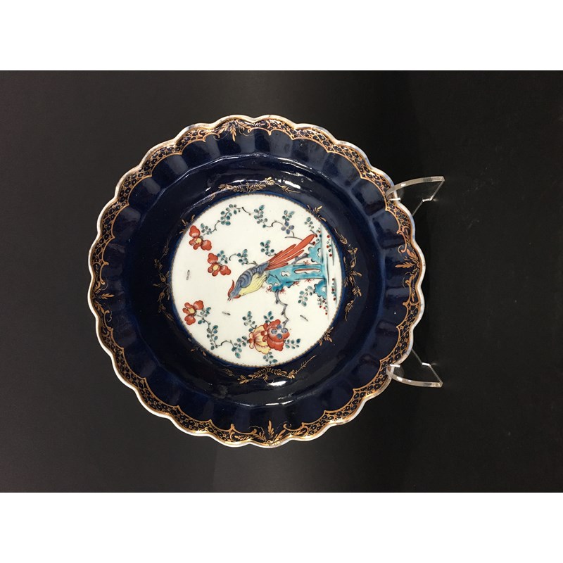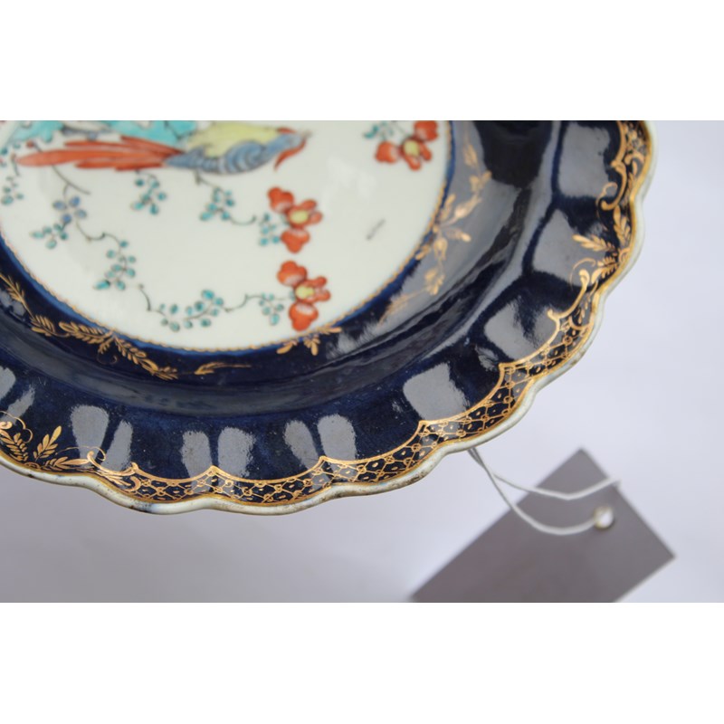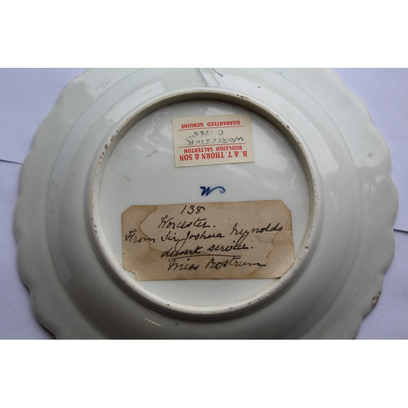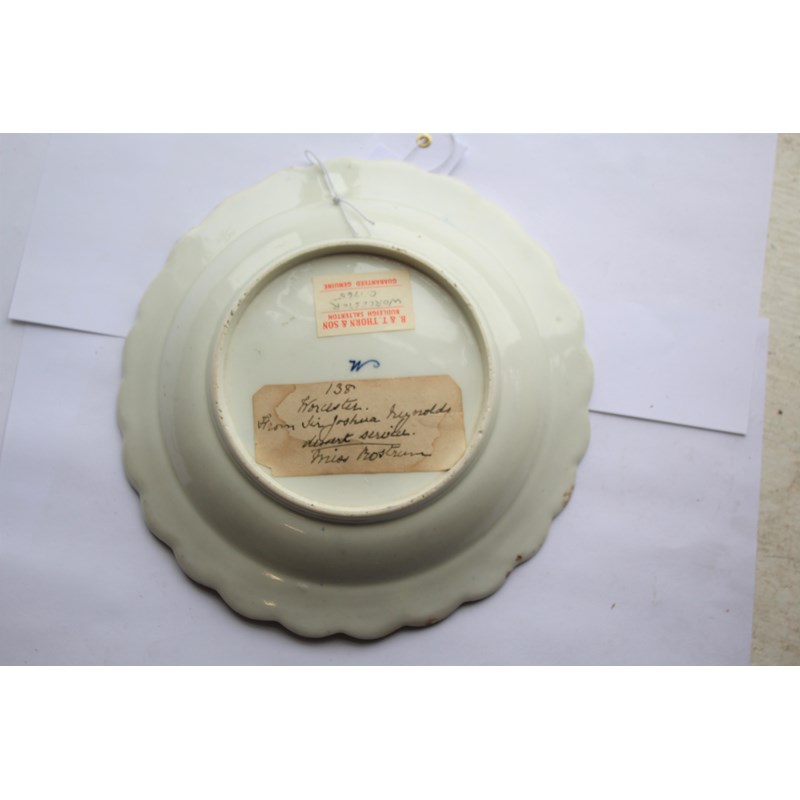 circa 1770, decorated in the Joshua Reynold pattern in the kakiemon palette, inside a deep blue and gilt border and scalloped rim, blue script W mark, old paper collection label and dealer label for B & T Thorn & Son, Budleigh Salterton, diameter 19cm