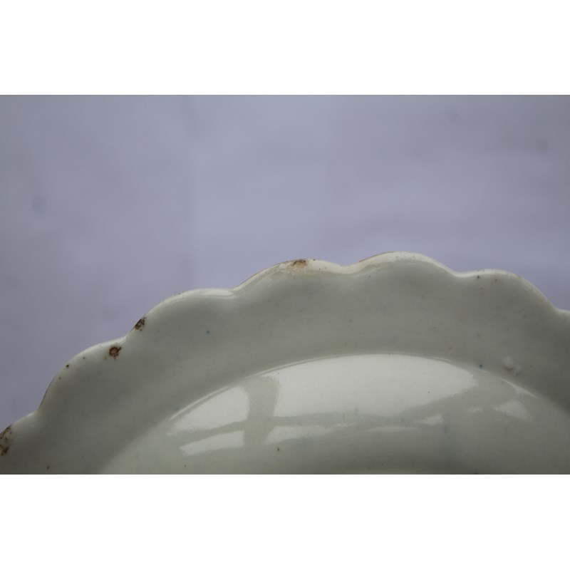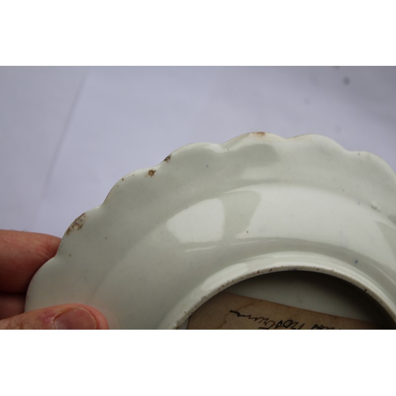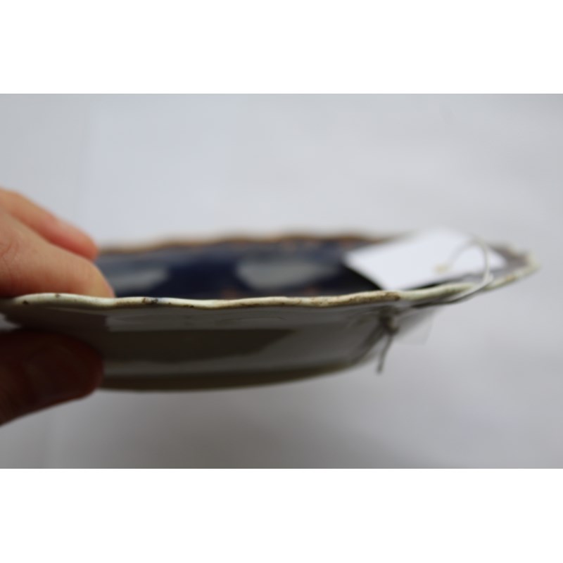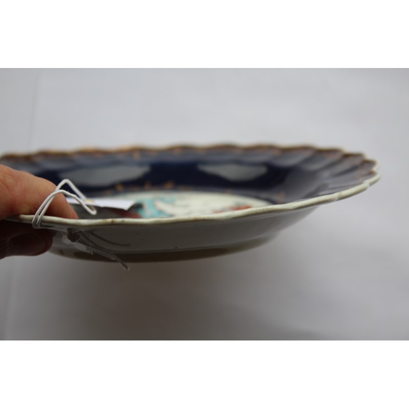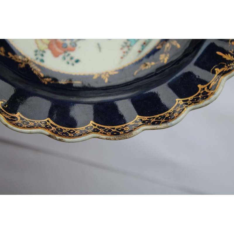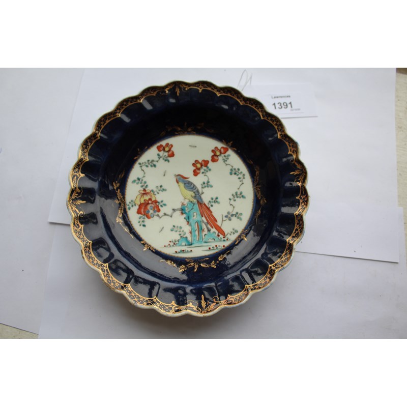 circa 1770, decorated in the Joshua Reynold pattern in the kakiemon palette, inside a deep blue and gilt border and scalloped rim, blue script W mark, old paper collection label and dealer label for B & T Thorn & Son, Budleigh Salterton, diameter 19cm