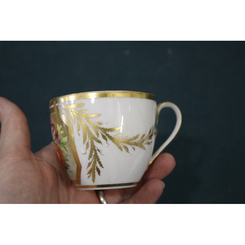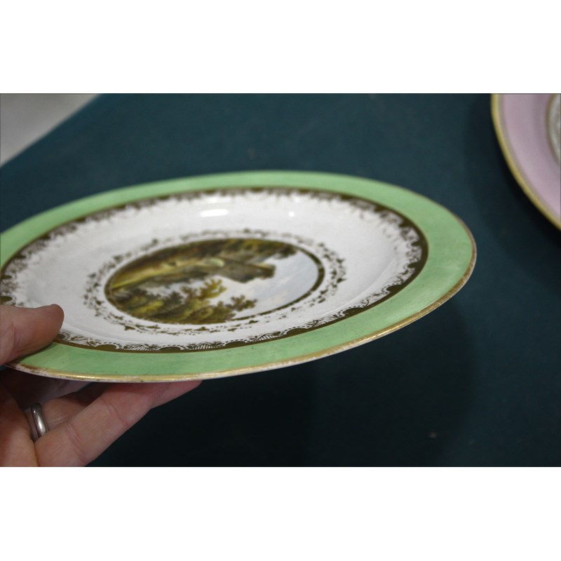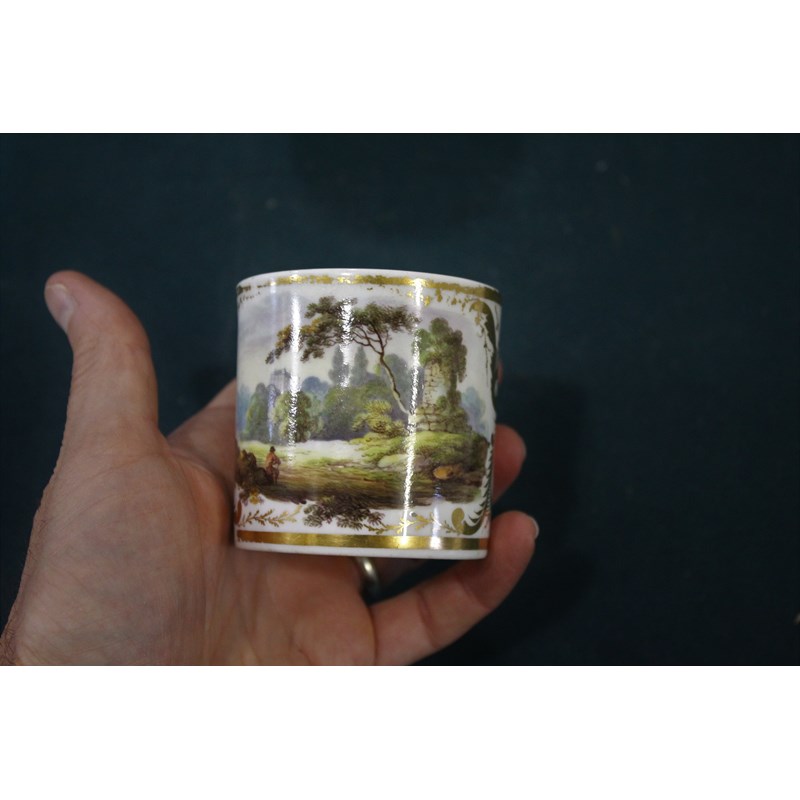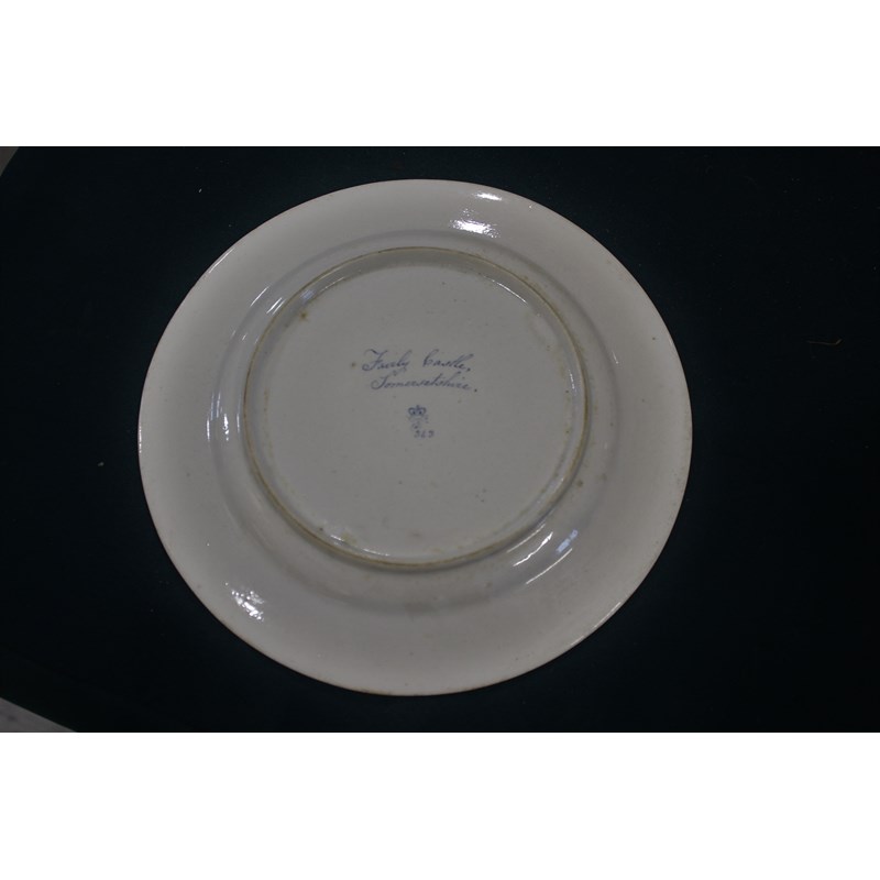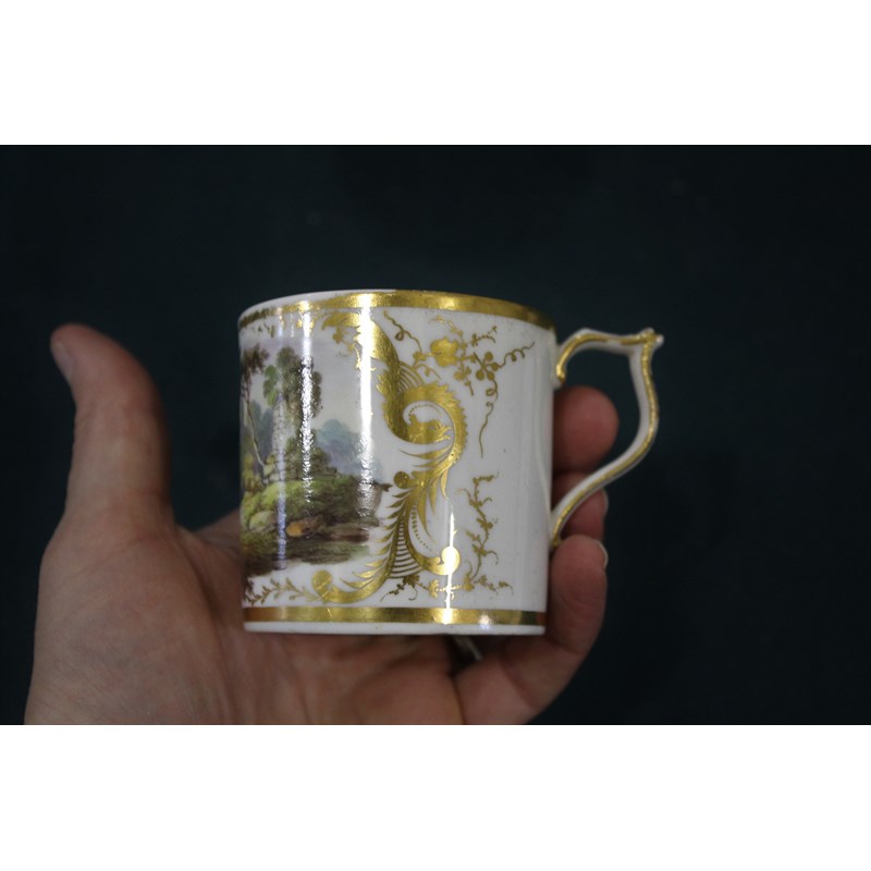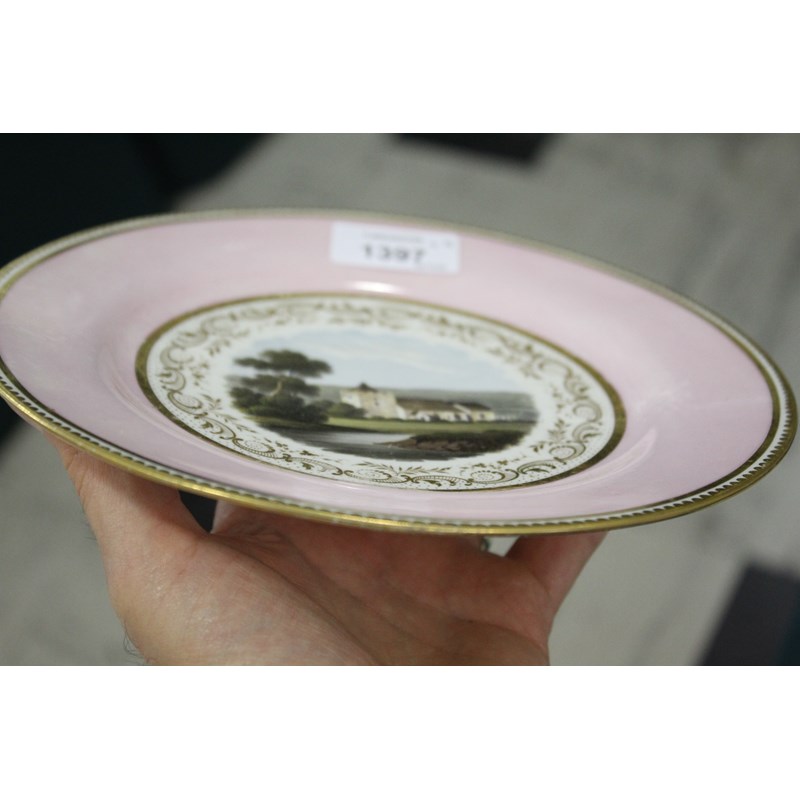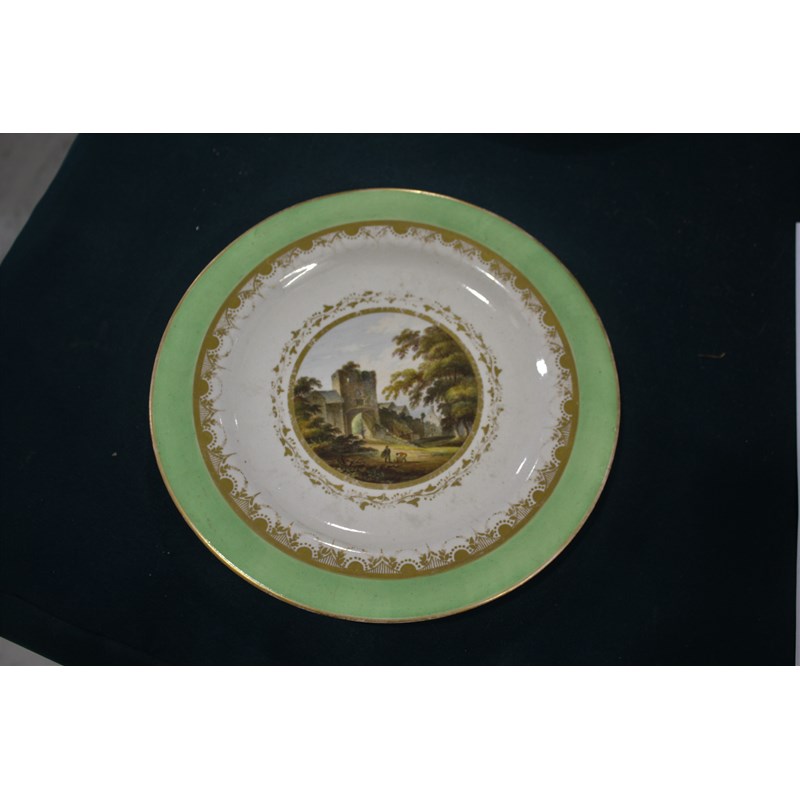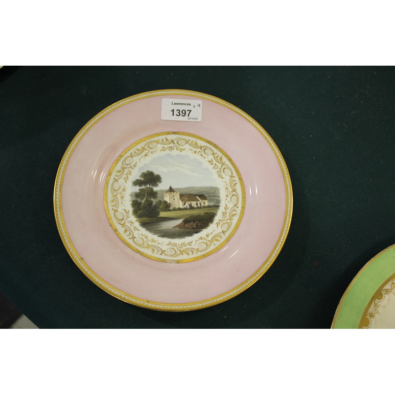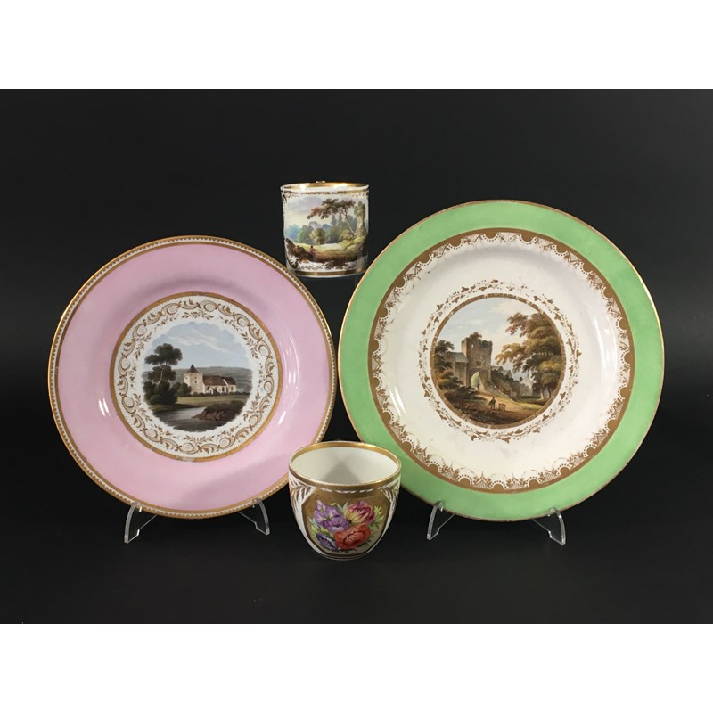 painted with a church, titled Leeds Church, Kent, inside gilt and pink borders, printed marks, diameter 20.5cm; a Derby named view plate of Favily Castle, Somersetshire, a Derby named view coffee can with a View near Alnwick, Cumberland; and a Derby coffee cup painted with flowers (4)