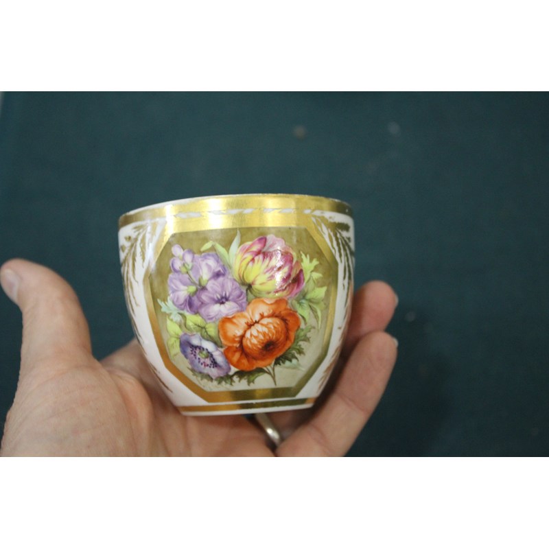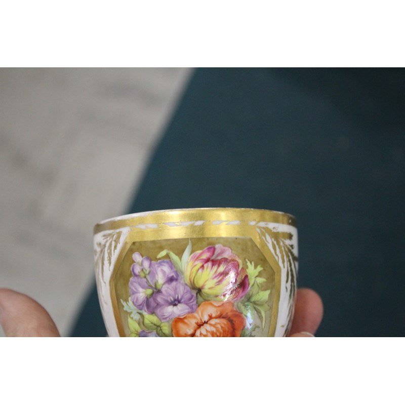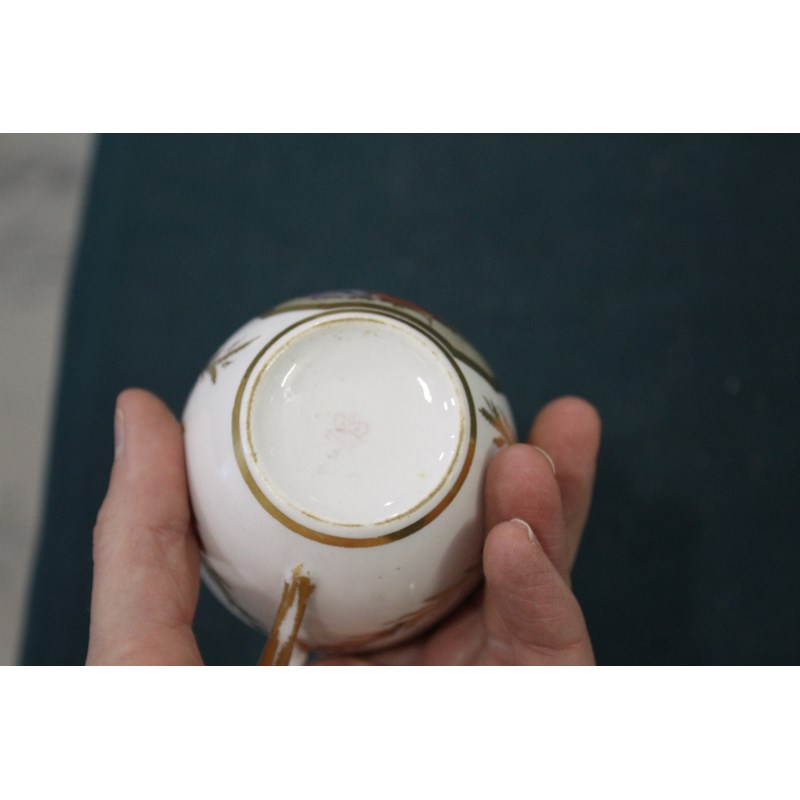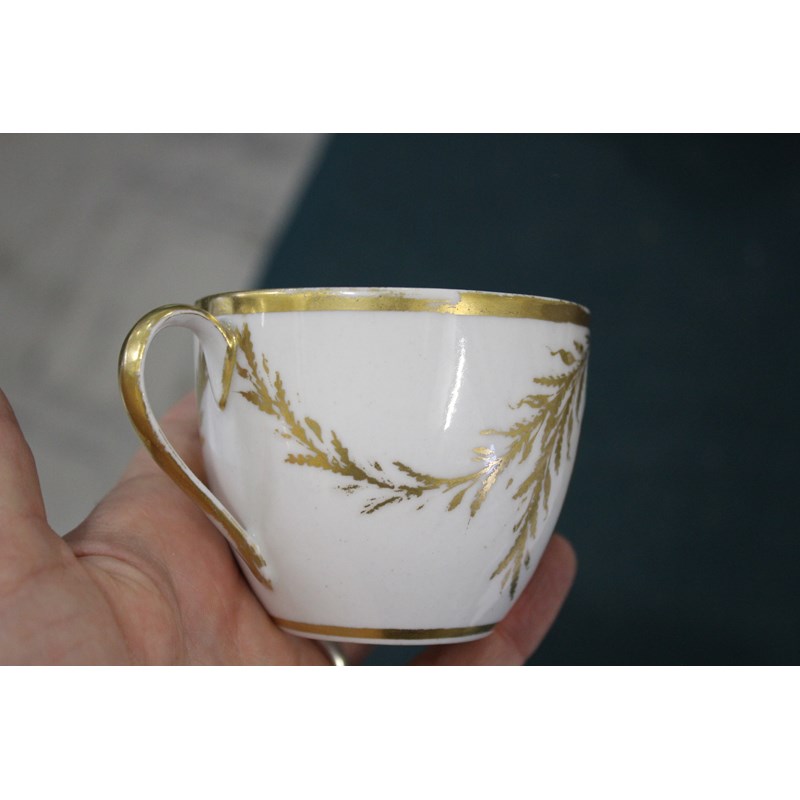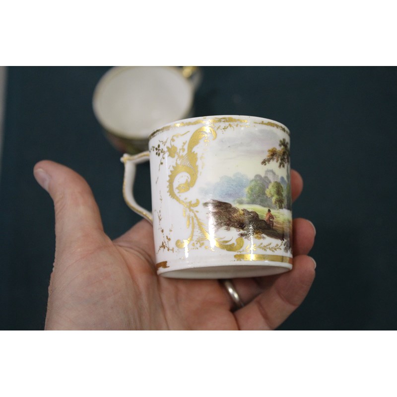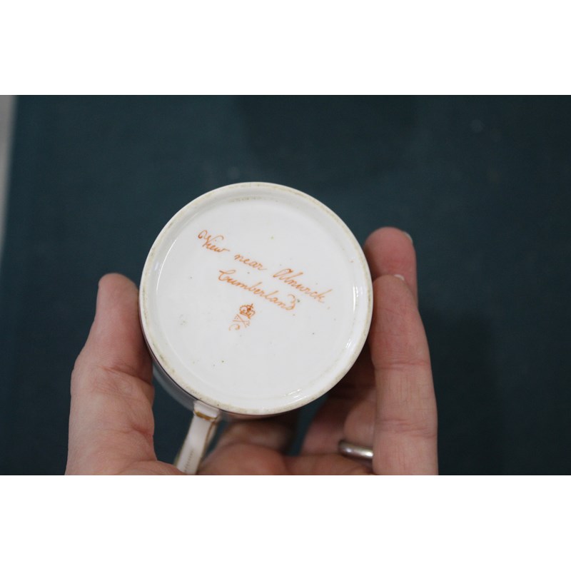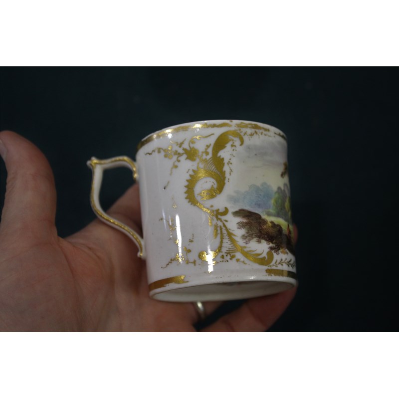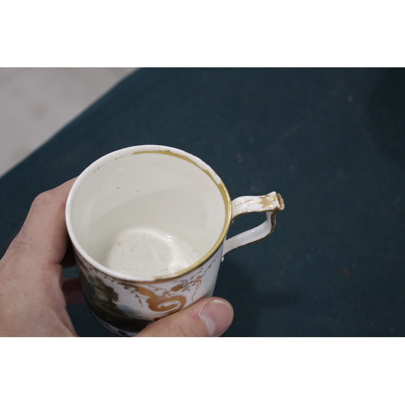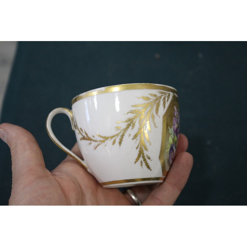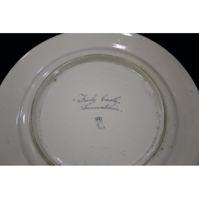 painted with a church, titled Leeds Church, Kent, inside gilt and pink borders, printed marks, diameter 20.5cm; a Derby named view plate of Favily Castle, Somersetshire, a Derby named view coffee can with a View near Alnwick, Cumberland; and a Derby coffee cup painted with flowers (4)