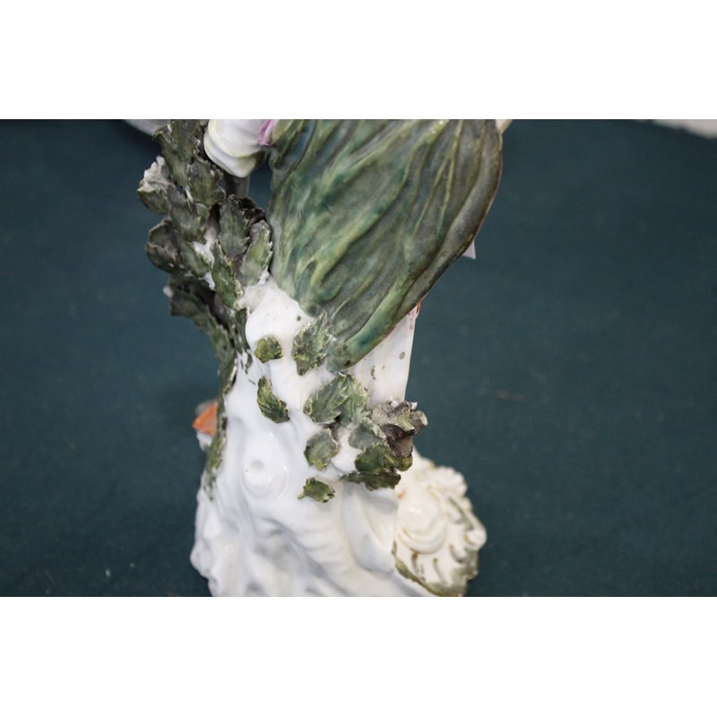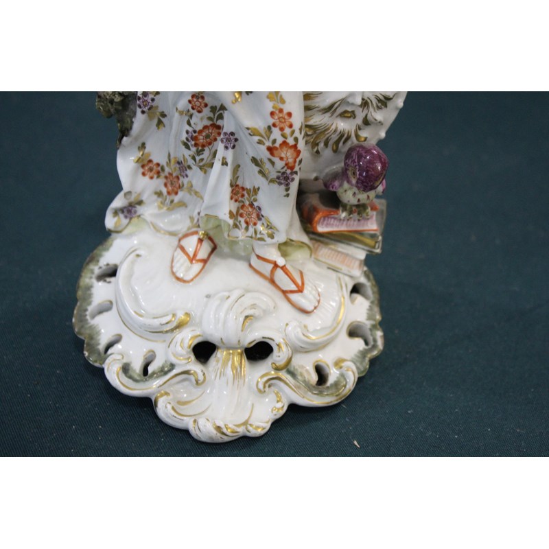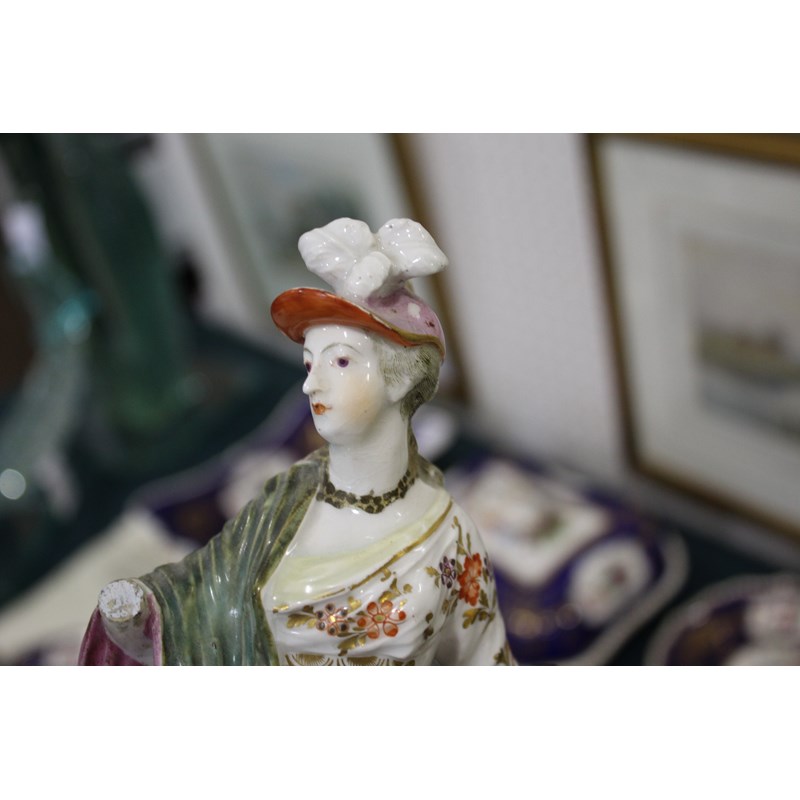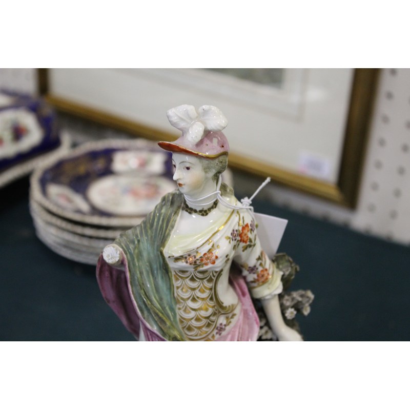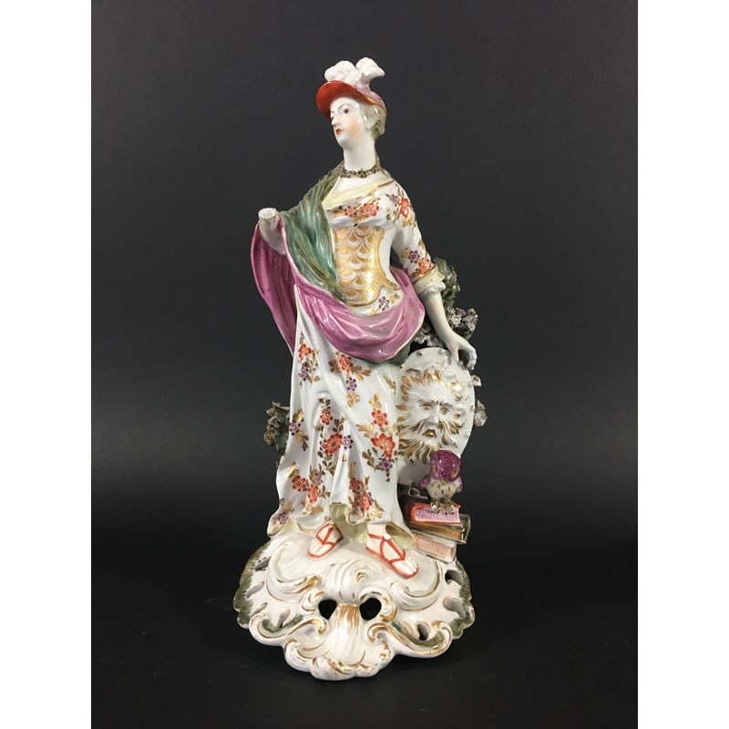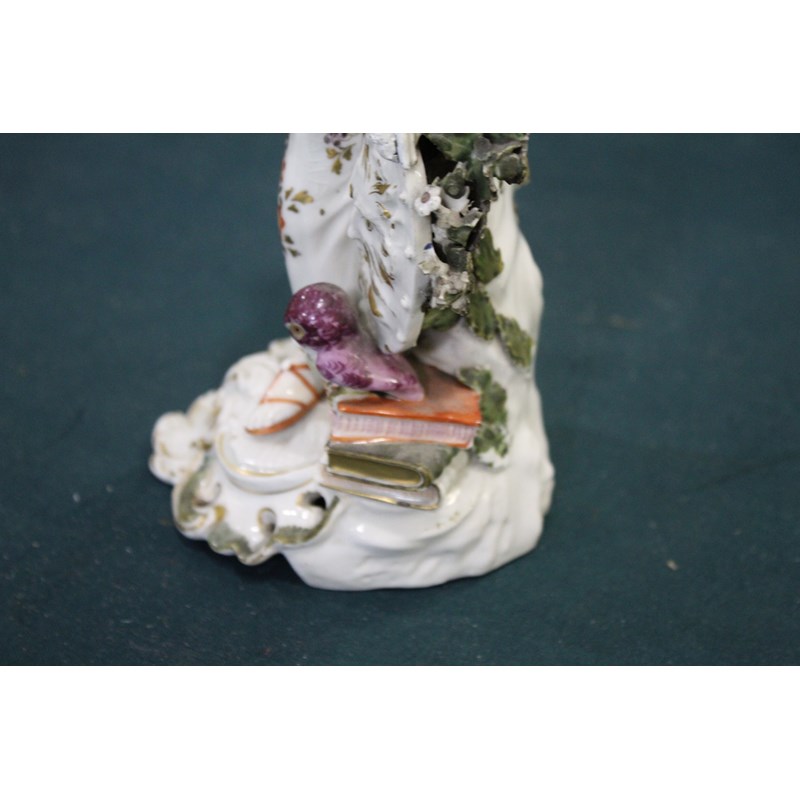 DERBY PATCH MARK FIGURE OF ATHENA late 18th century, she standing by her shield, an old perched on a stack of books, height 27cm