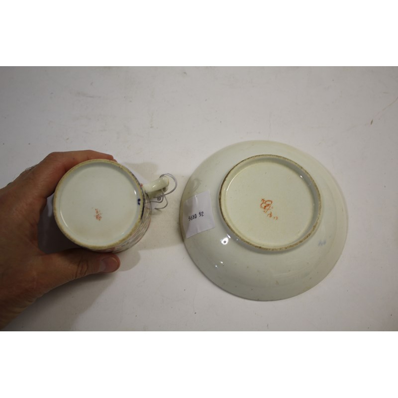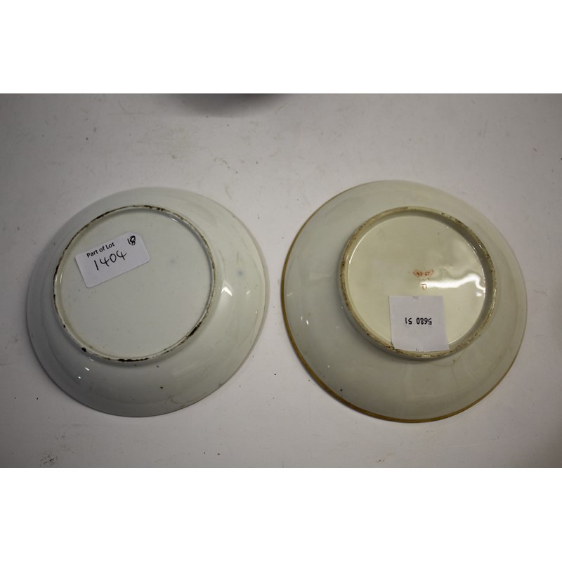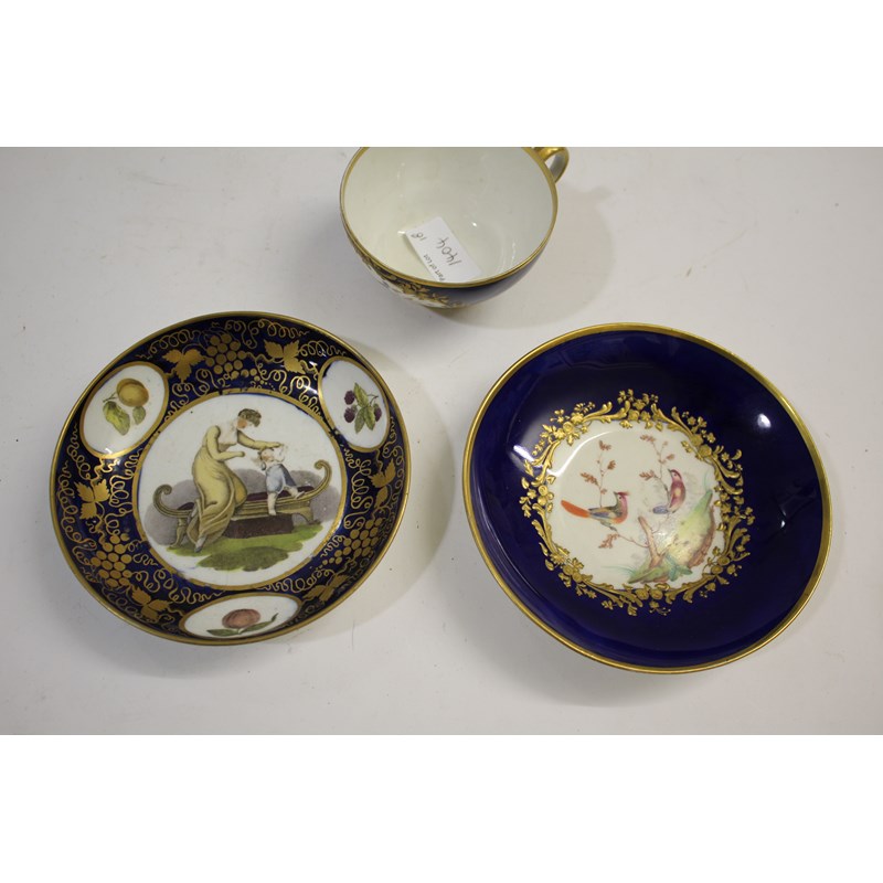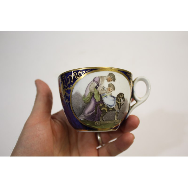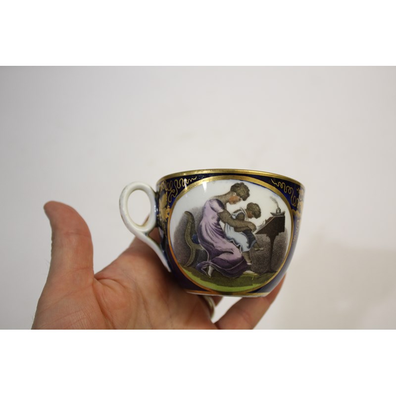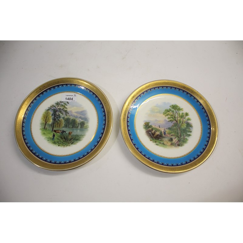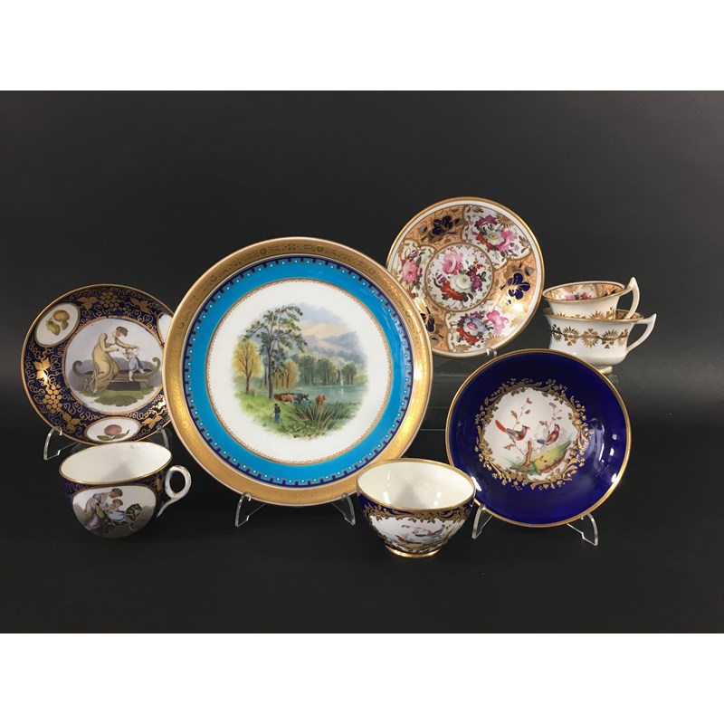 date cypher for 1878, outside painted with landscapes inside a turquoise and tooled gilt border, impressed and painted marks, diameter 23cm; together with a teacup and saucer printed and painted with a mother and child on a rocking horse and other scenes and various English porcelain cups and saucers (parcel)
