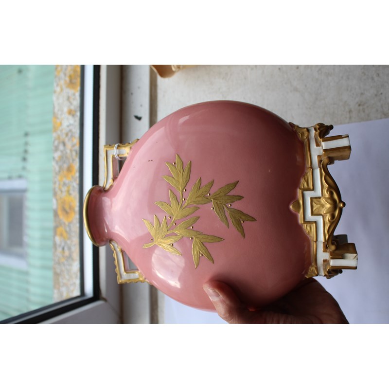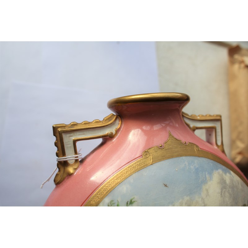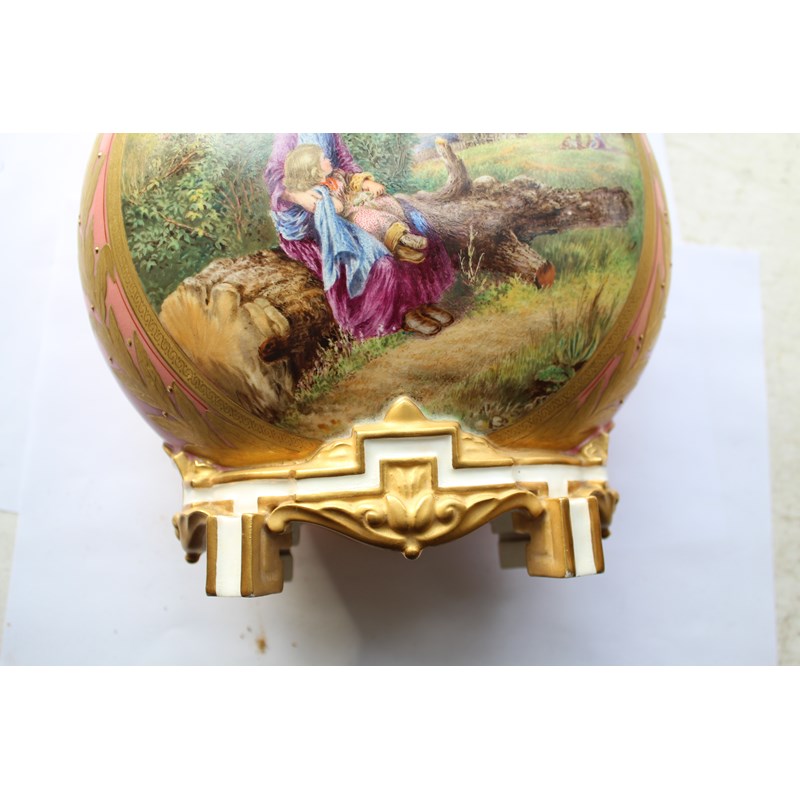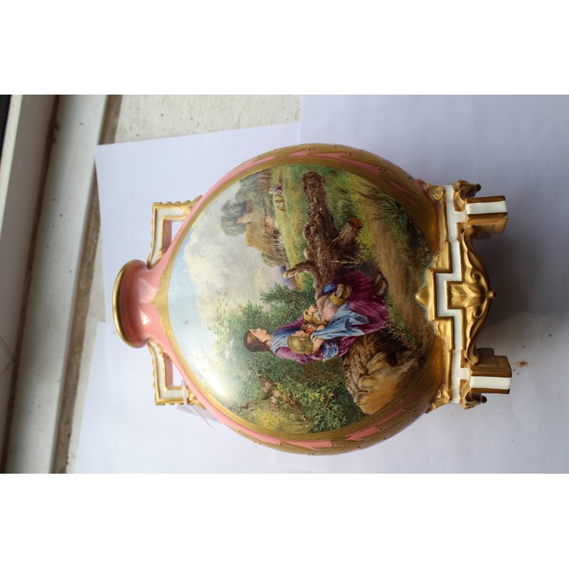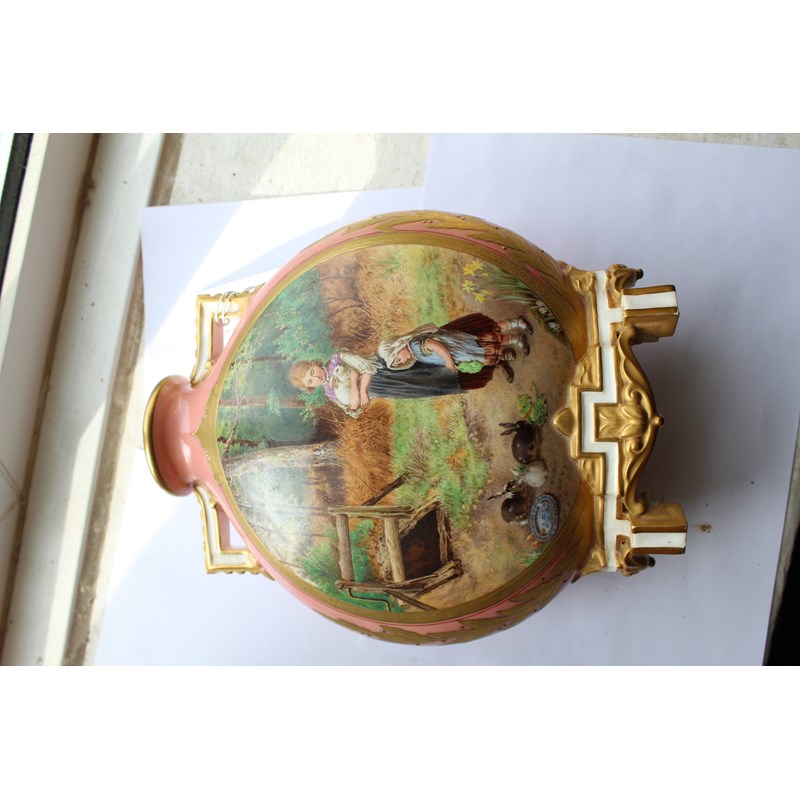 date code for 1878, the Japanesque bodies painted with rustic scenes of children in the countryside inside tooled gilt frames and on a pale pink ground, puce printed marks, height 25cm (2)