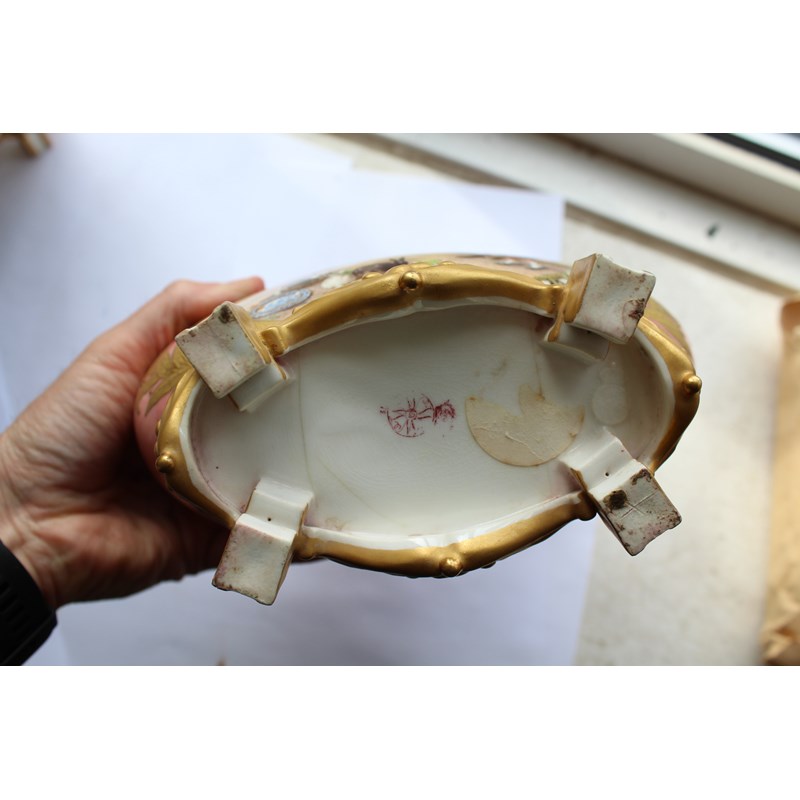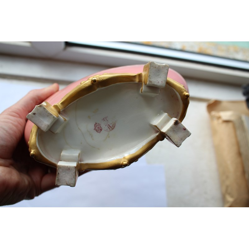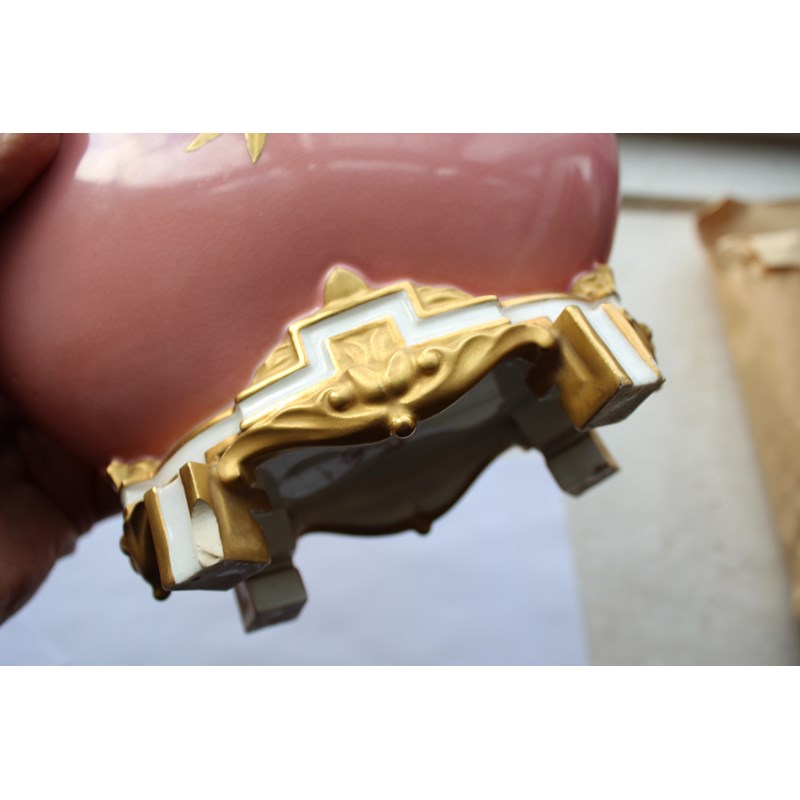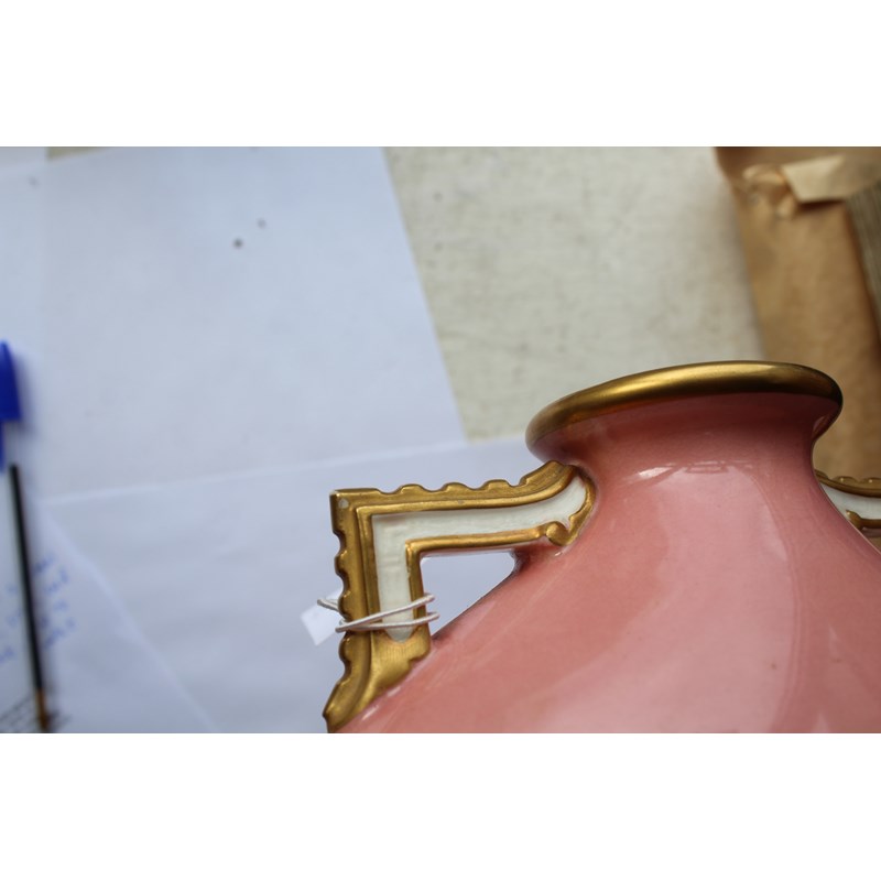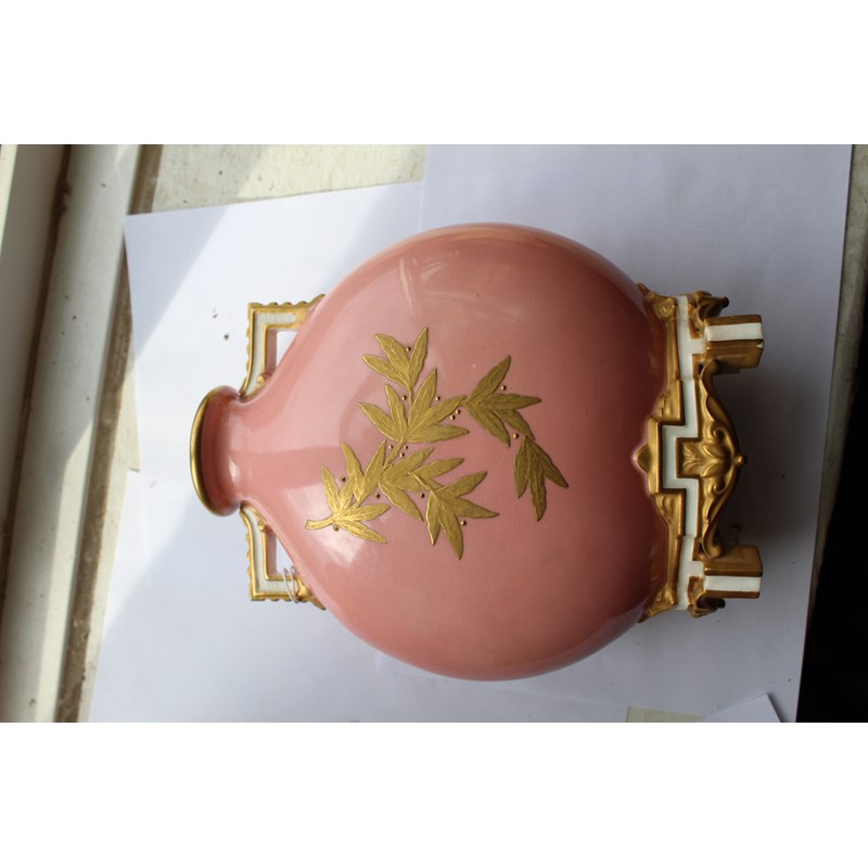 date code for 1878, the Japanesque bodies painted with rustic scenes of children in the countryside inside tooled gilt frames and on a pale pink ground, puce printed marks, height 25cm (2)