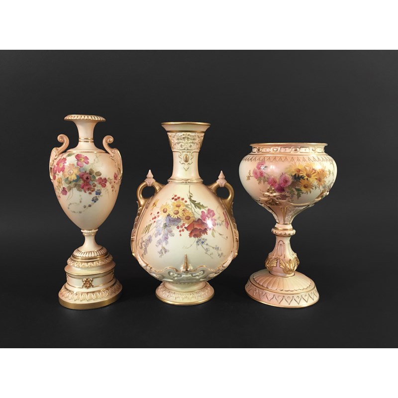 model 1969, date code for 1901, painted and gilded with flowers, green printed mark, height 28cm; together with another vase, model 1553, date code for 1896, similarly decorated; and another, model 1813, date code for 1902, also similarly decorated, green and puce marks (3)