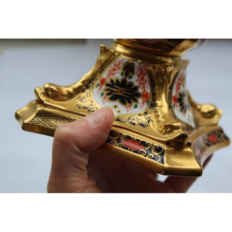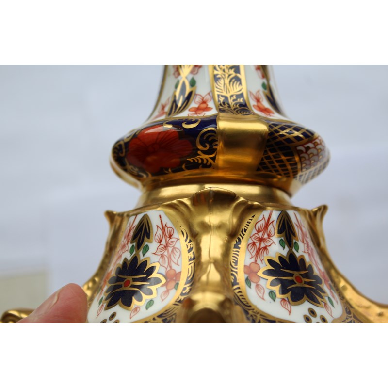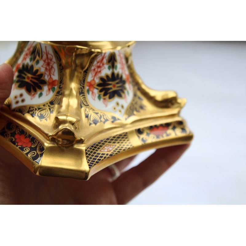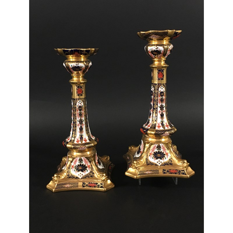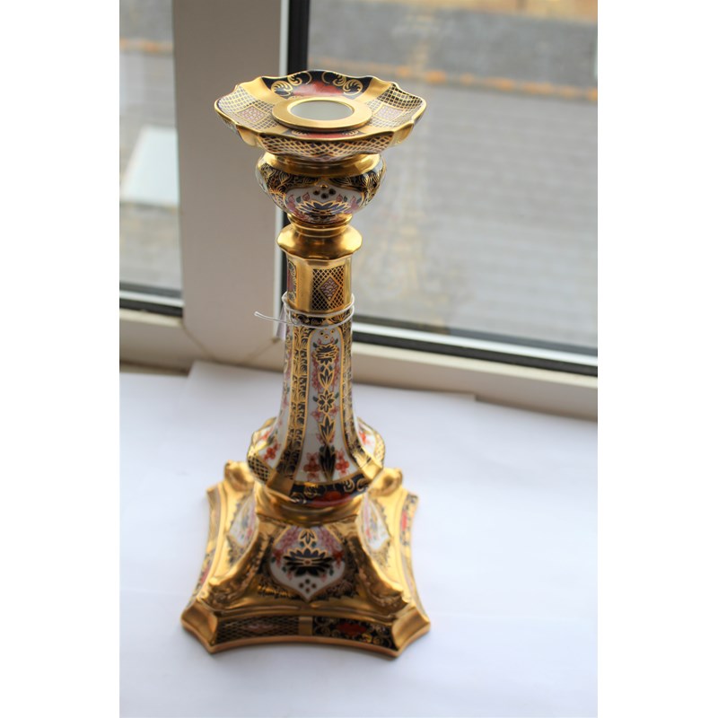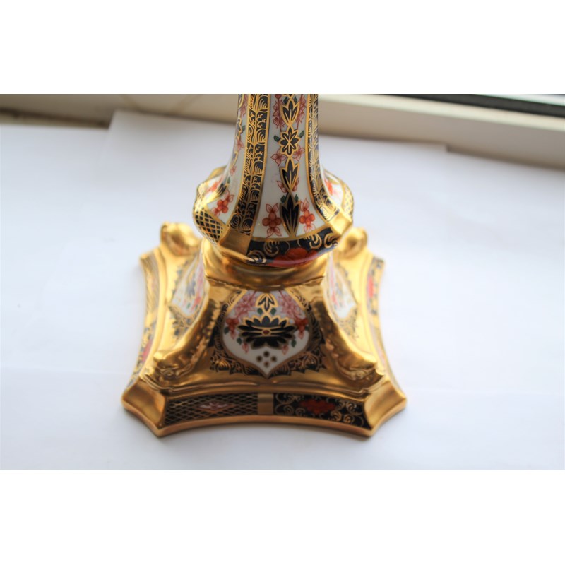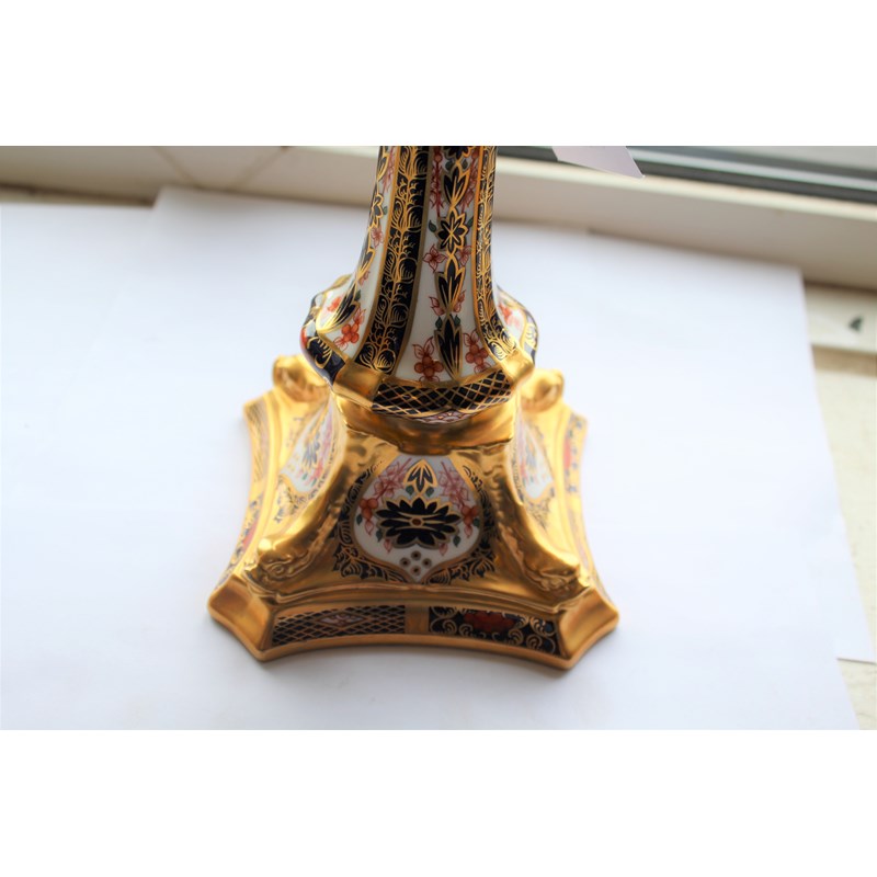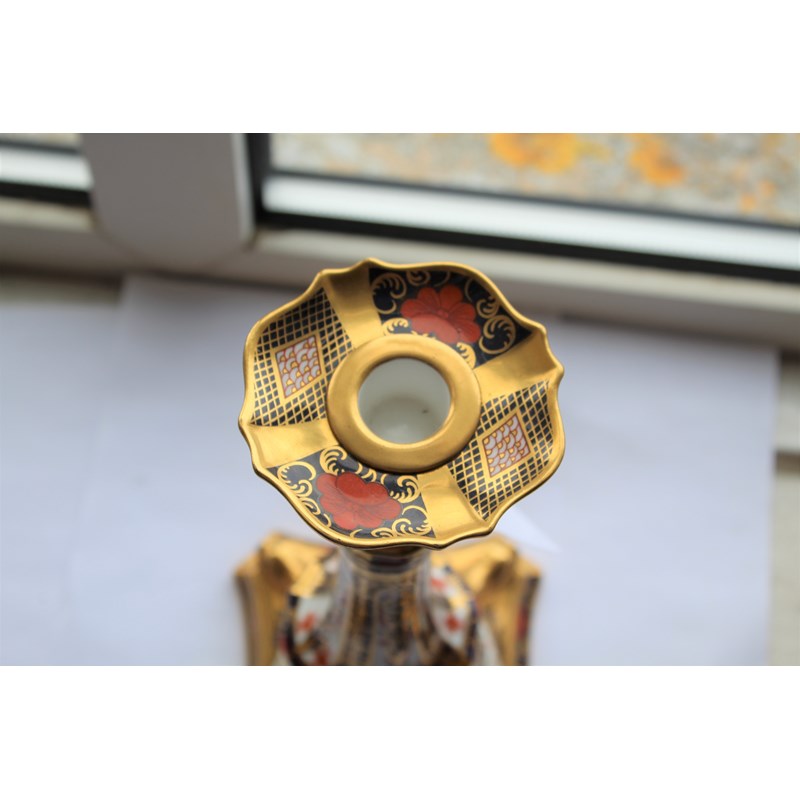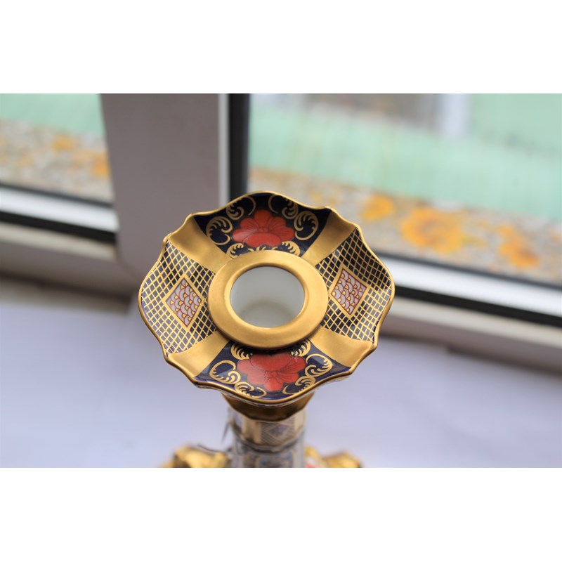 PAIR OF ROYAL CROWN DERBY CANDLESTICKS date code for 1975, in Imari pattern 1128, iron red marks, height 26cm (2)