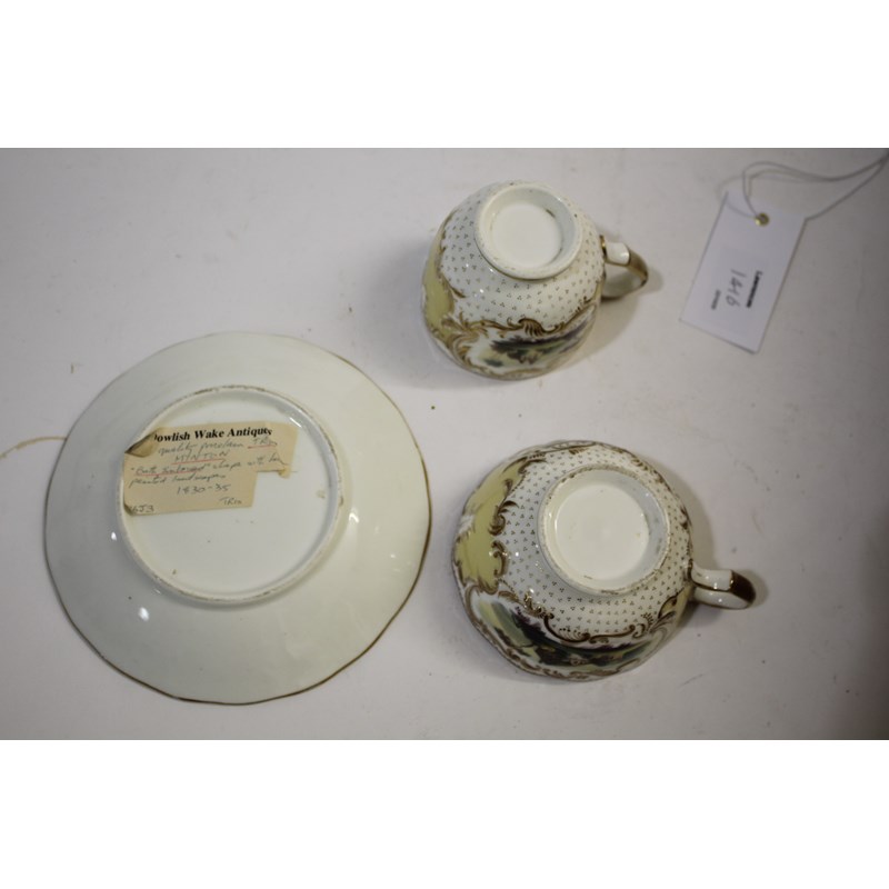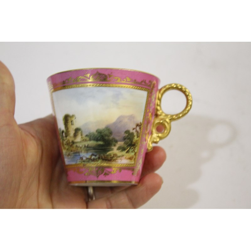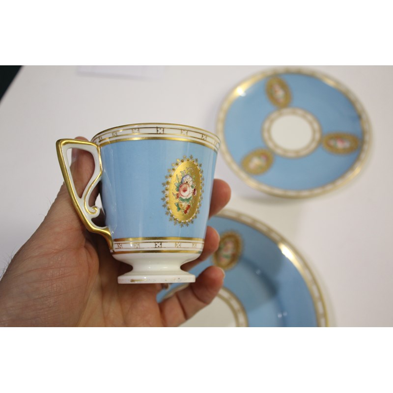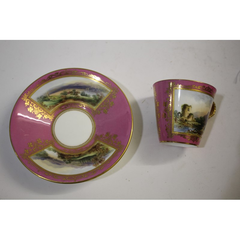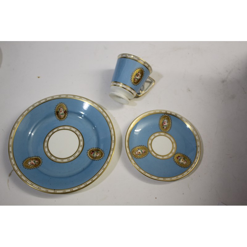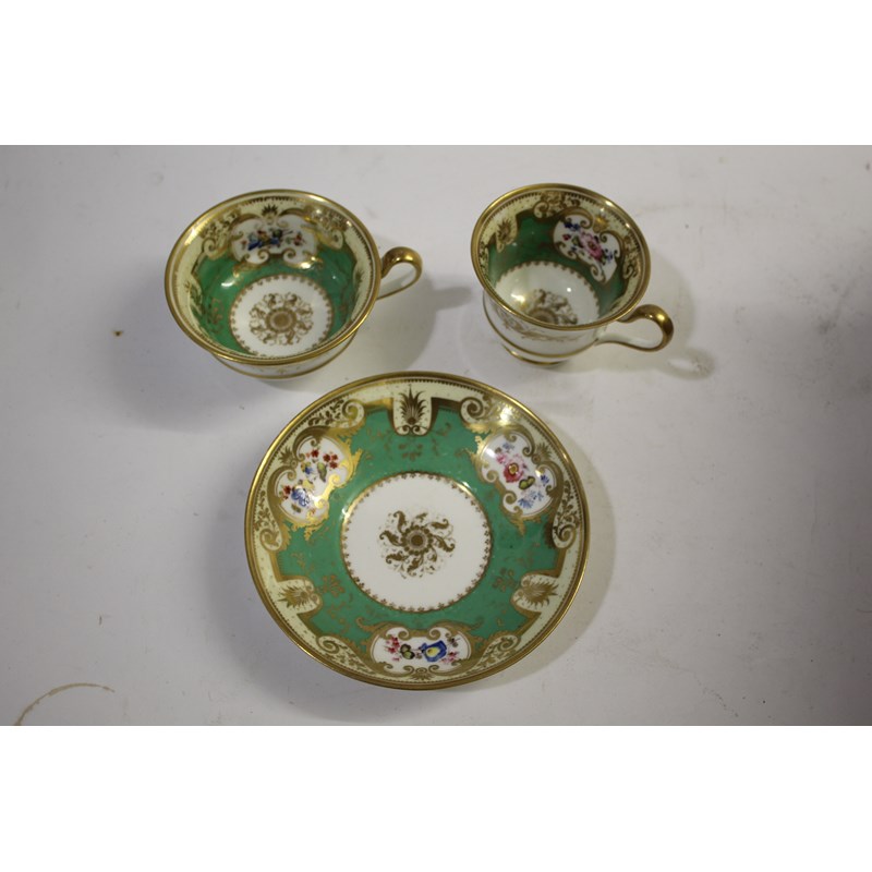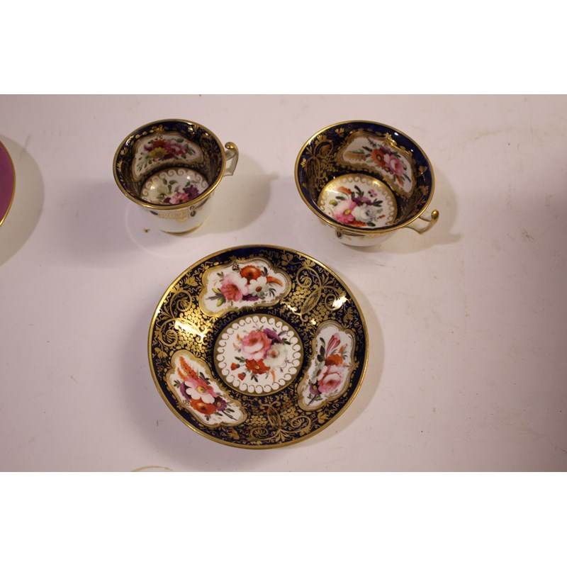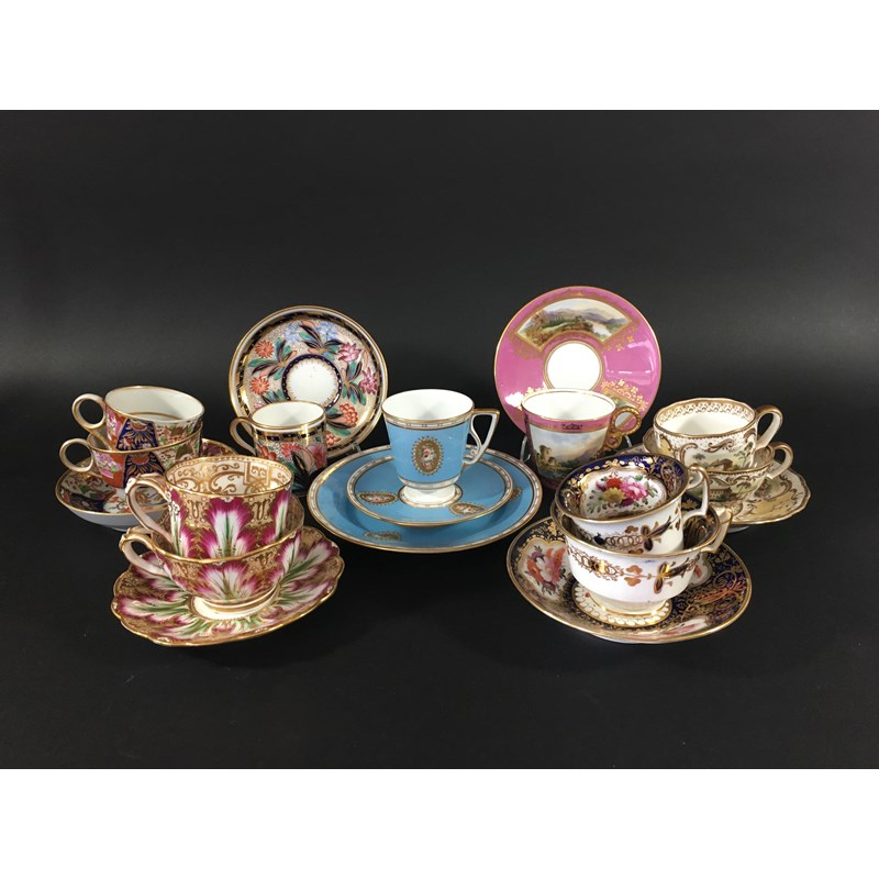 circa 1870, painted with landscapes on a rose pompadour ground; a Copeland trio with gilt floral cartouches on a turquoise ground; six further English porcelain trios and another cup and saucer (9)