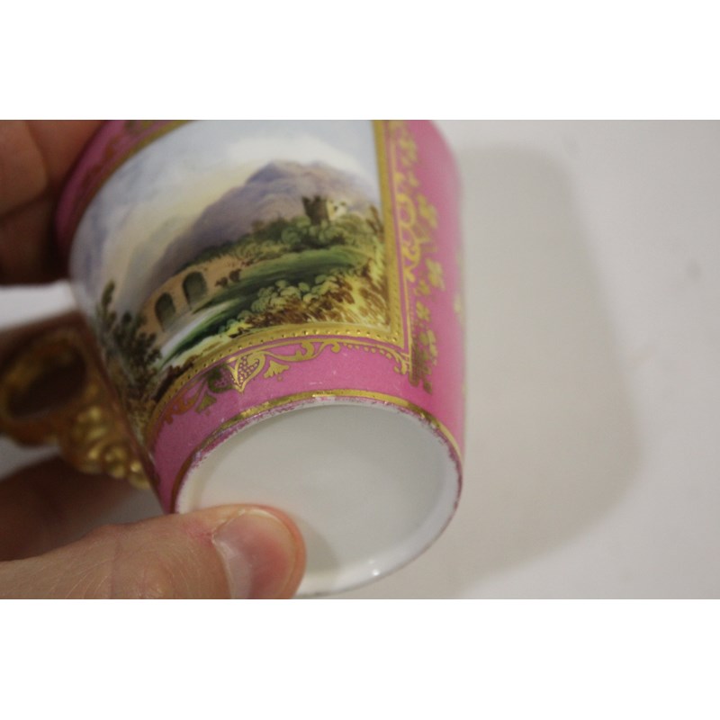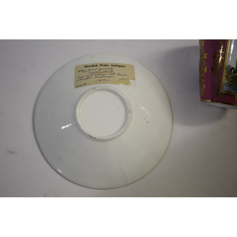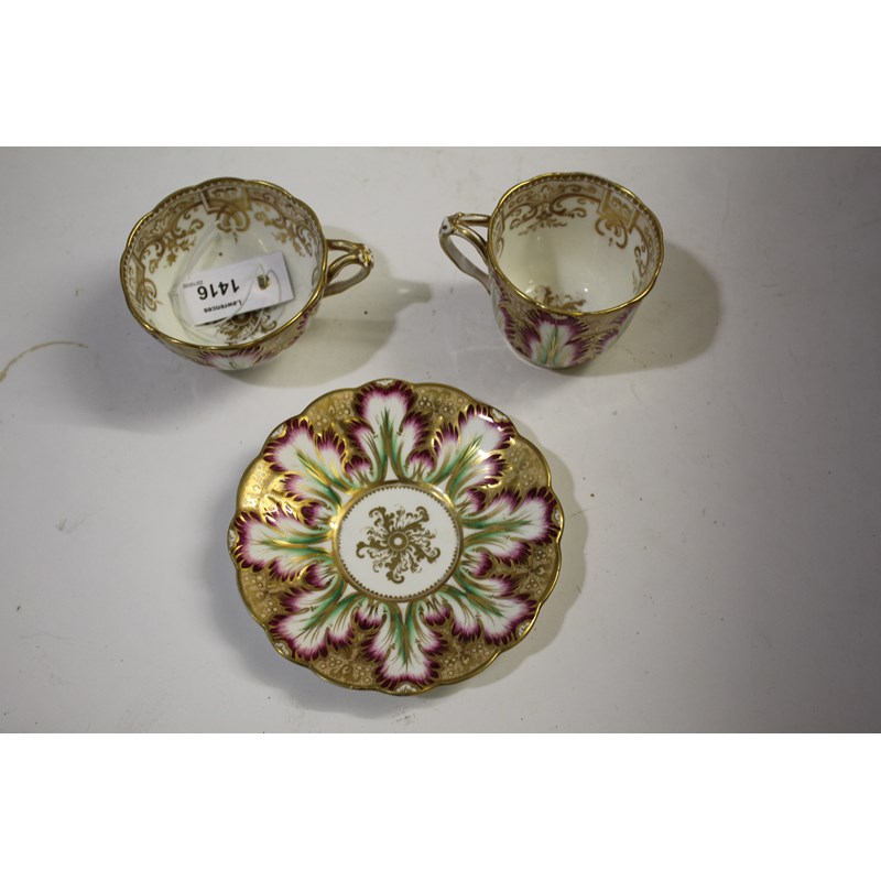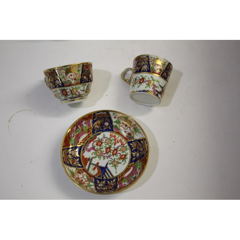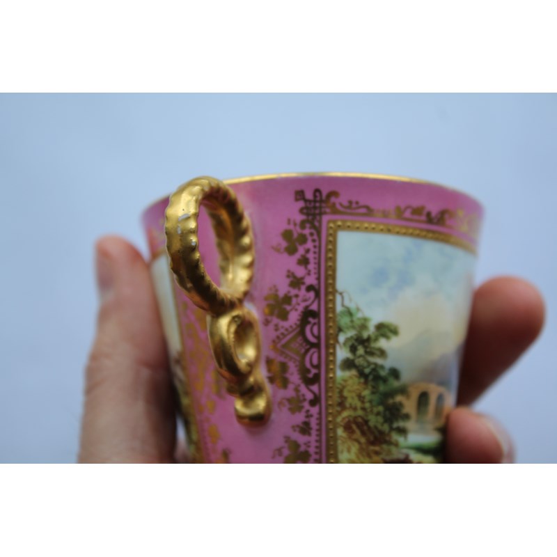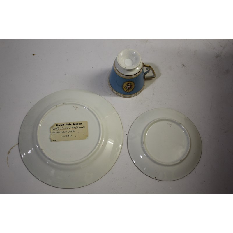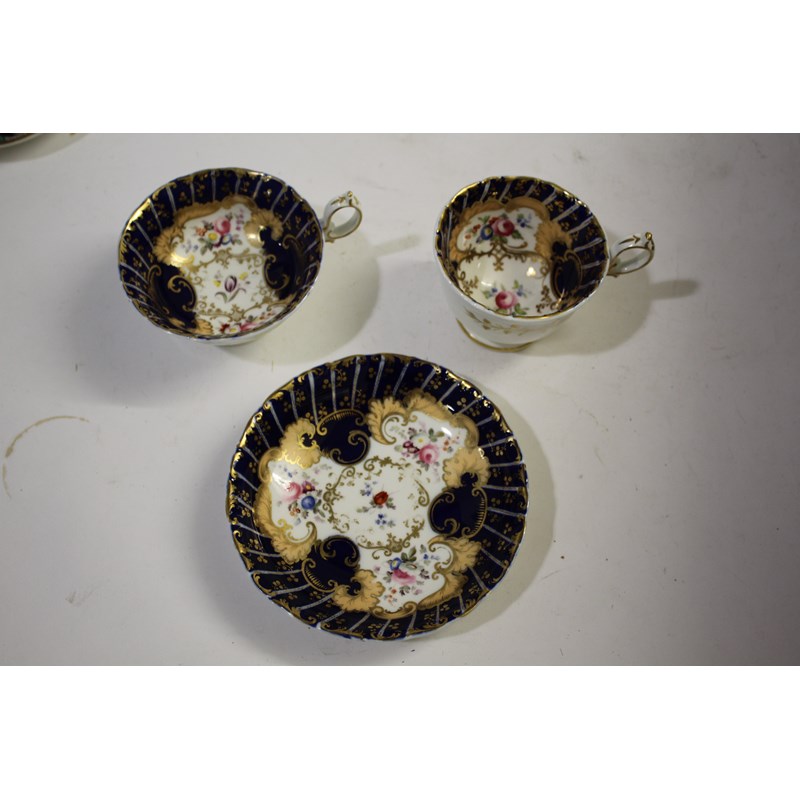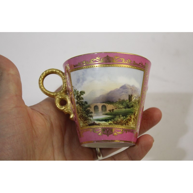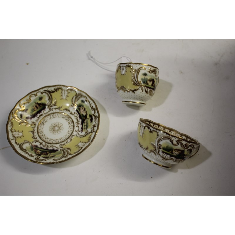 circa 1870, painted with landscapes on a rose pompadour ground; a Copeland trio with gilt floral cartouches on a turquoise ground; six further English porcelain trios and another cup and saucer (9)