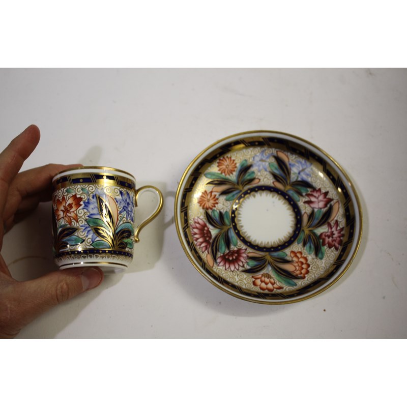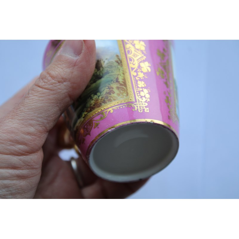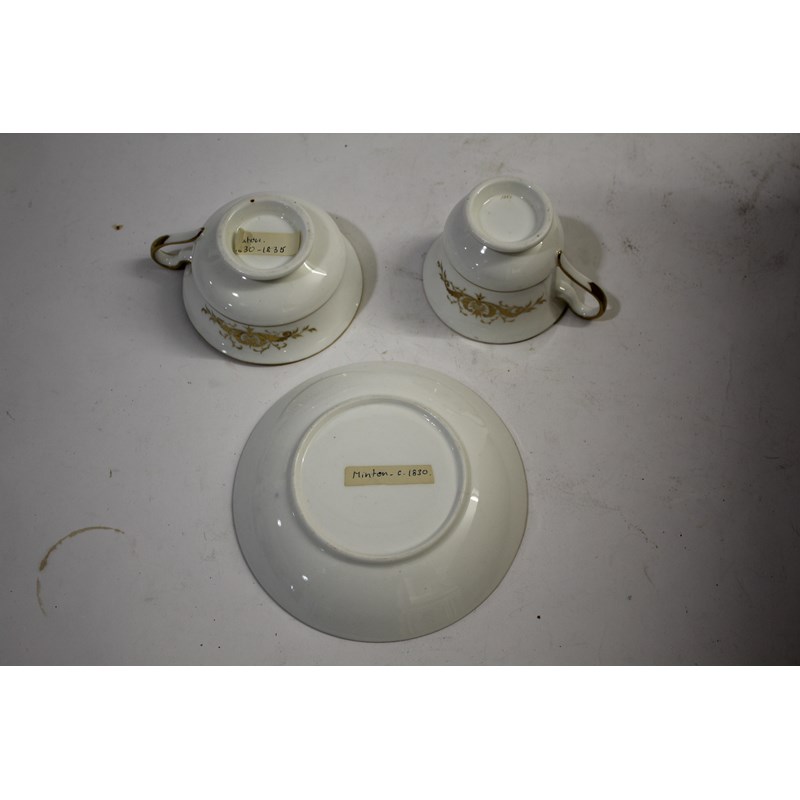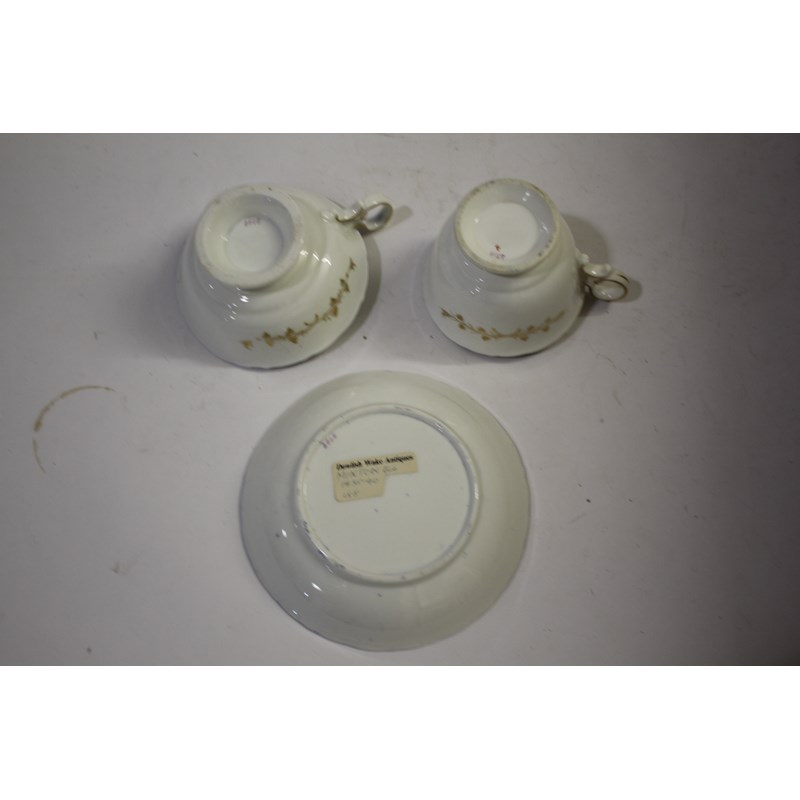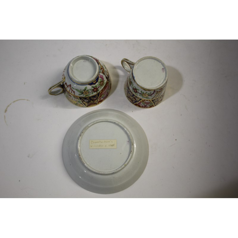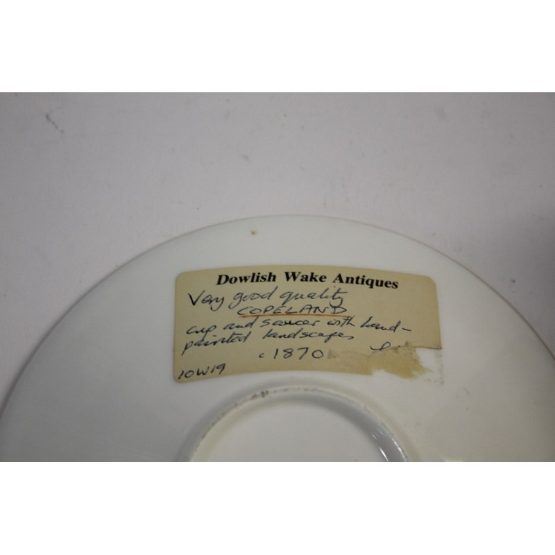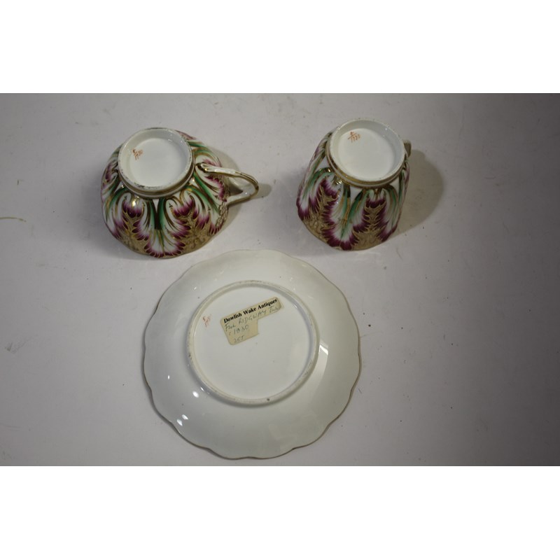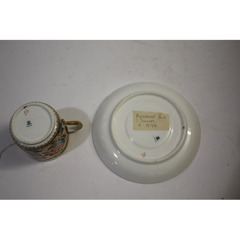 circa 1870, painted with landscapes on a rose pompadour ground; a Copeland trio with gilt floral cartouches on a turquoise ground; six further English porcelain trios and another cup and saucer (9)