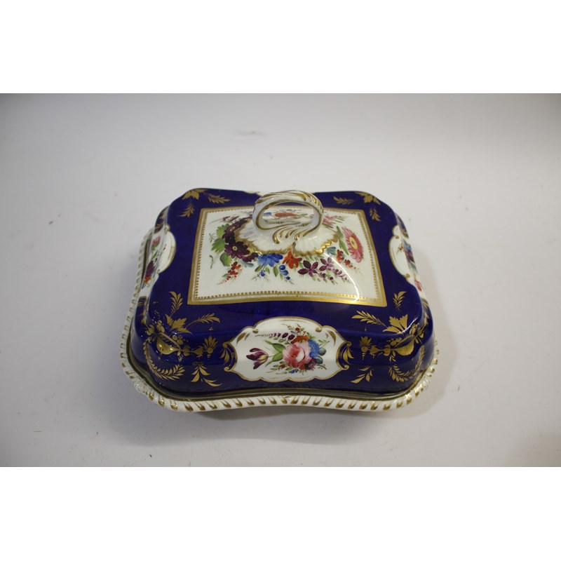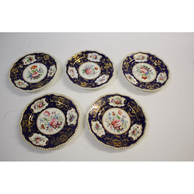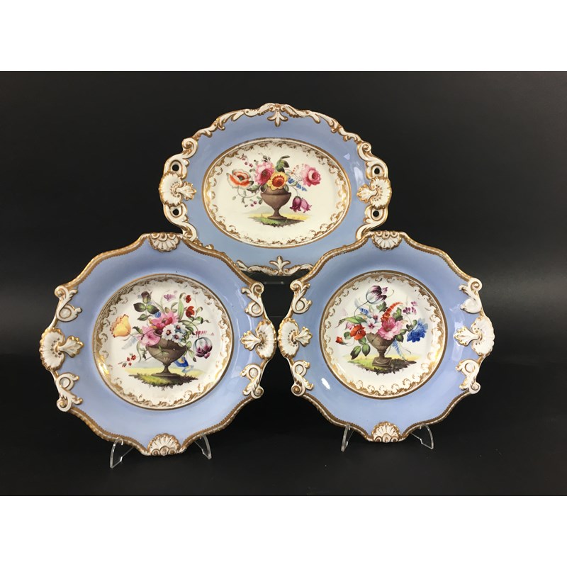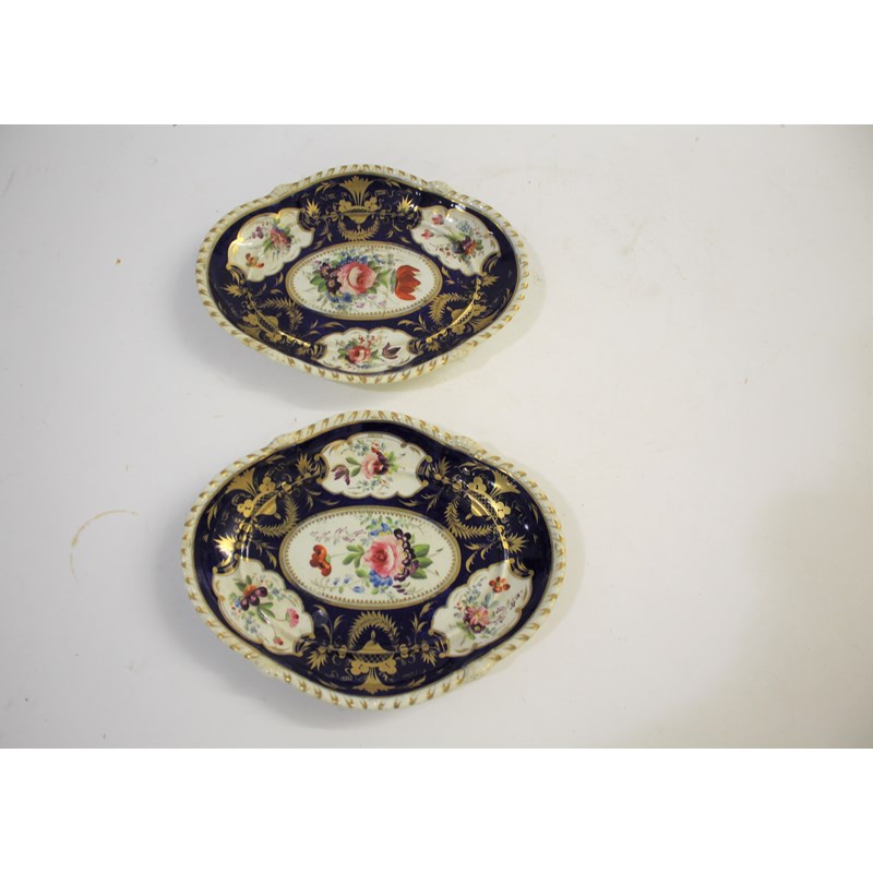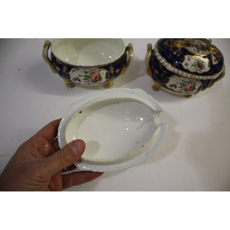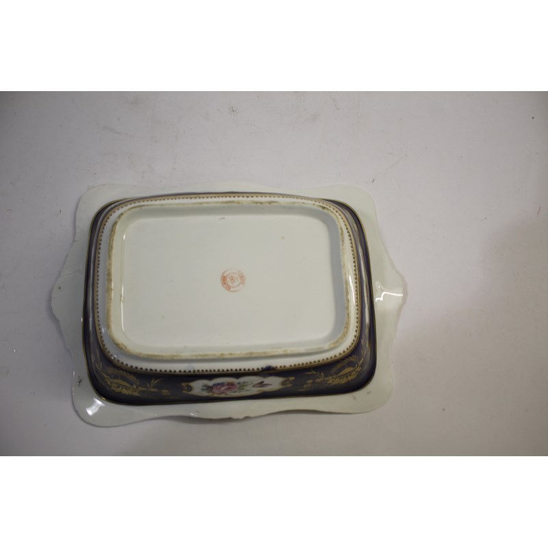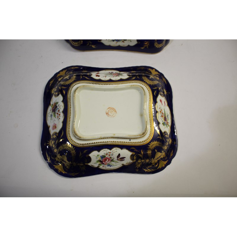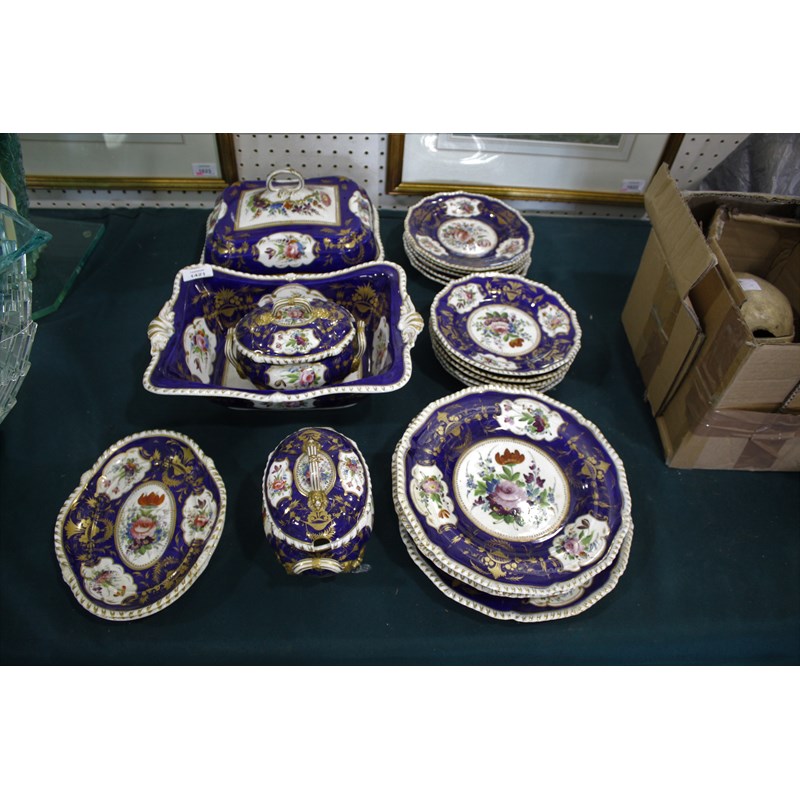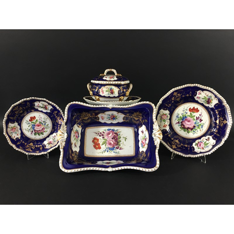 painted with floral sprays on a blue and gilt ground, comprising a rectangular fruit bowl, tureen and cover, two sauce tureens, covers and stand, four dinner plates and ten side plates, printed and painted marks, width of fruit bowl 33cm (18)