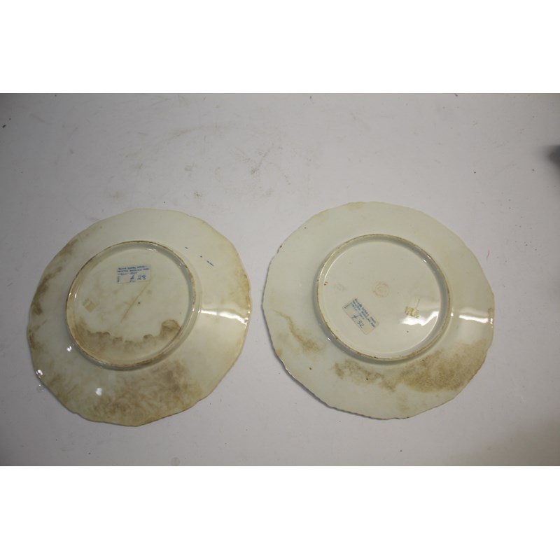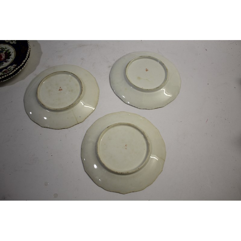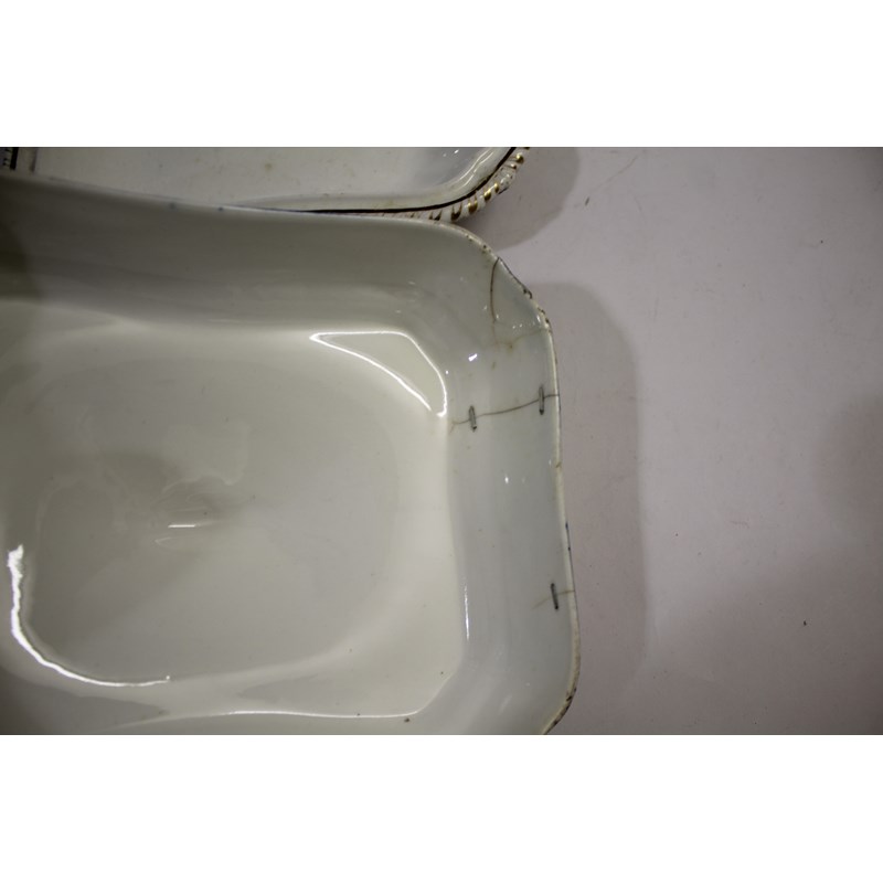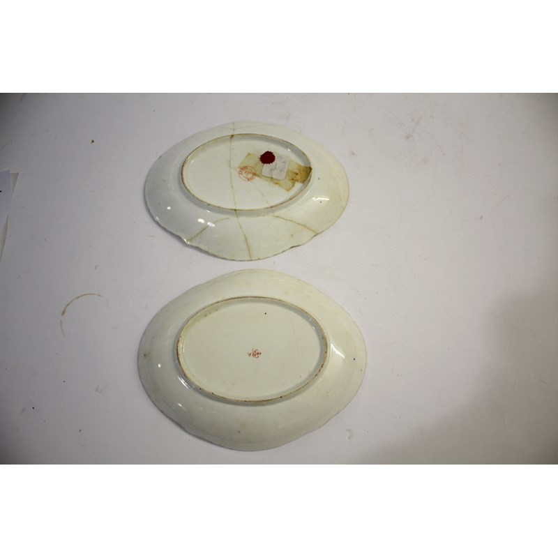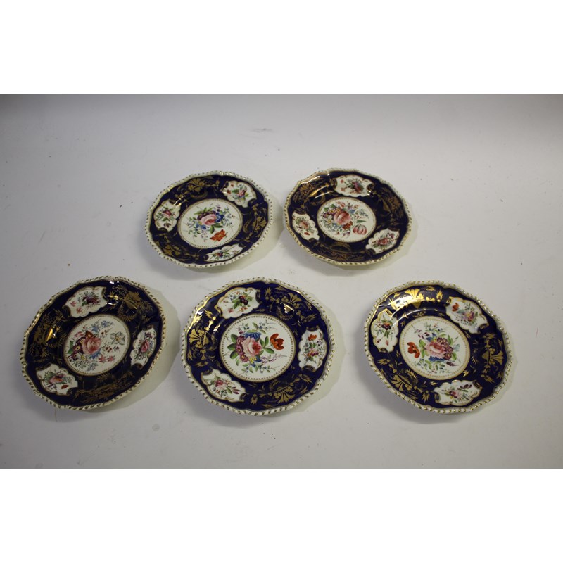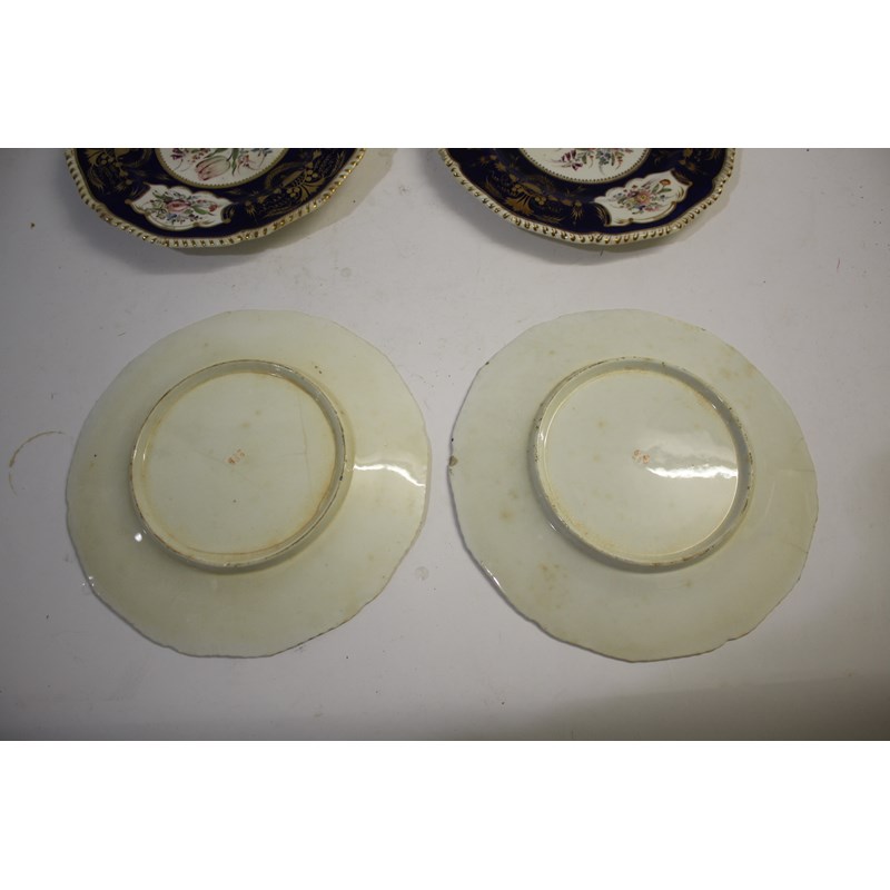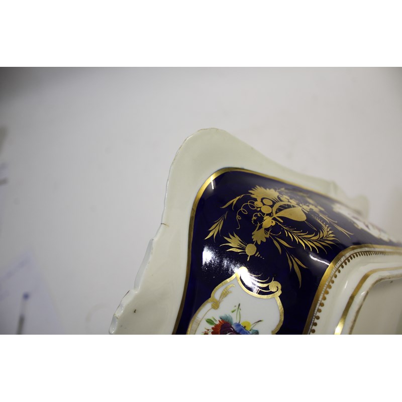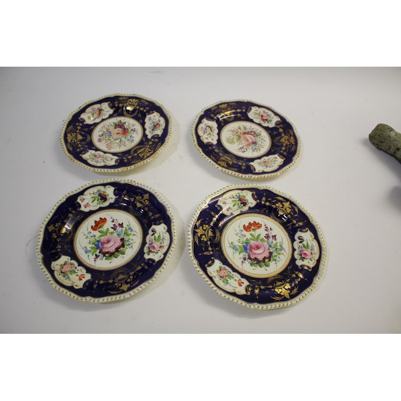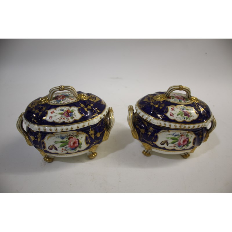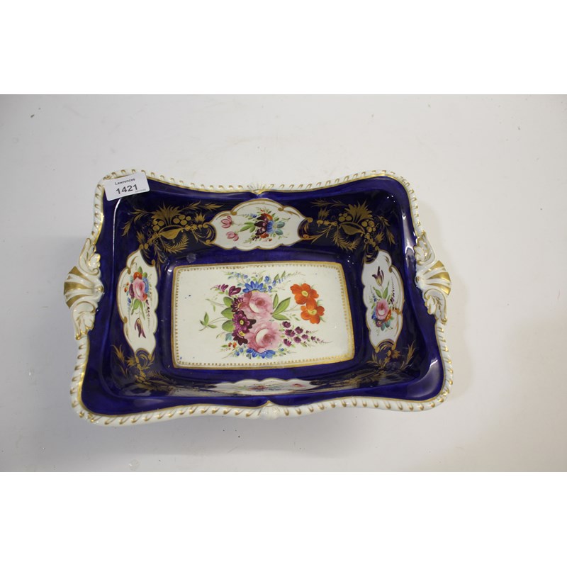 painted with floral sprays on a blue and gilt ground, comprising a rectangular fruit bowl, tureen and cover, two sauce tureens, covers and stand, four dinner plates and ten side plates, printed and painted marks, width of fruit bowl 33cm (18)