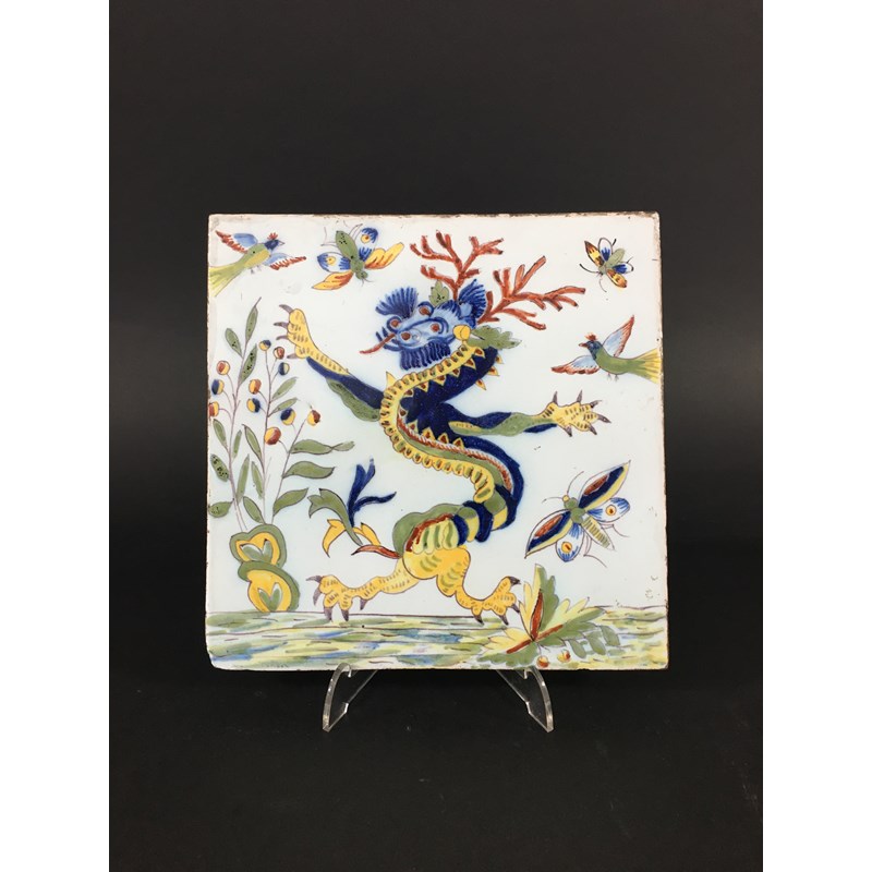 potentially 18th century, painted with a chinoiserie dragon, birds and insects, 20cm square