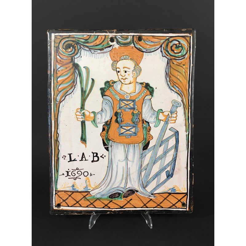probably Nevers, France, painted with a portrait of St Lawrence holding a grid iron and palm leaf beside the initials LAB (Laurentius Ave Beatus) and dated 1690, 32.5cm x 26cm