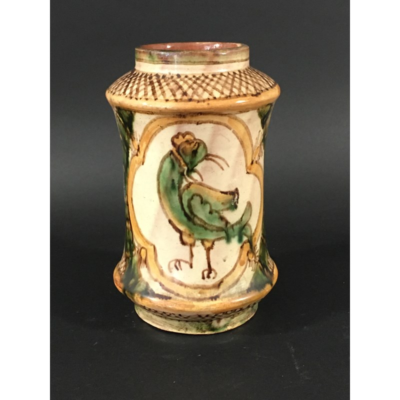 DERUTA STYLE MAIOLICA ALBARELLO painted with cockerals beneath trellis shoulders, painted marks, height 21cm