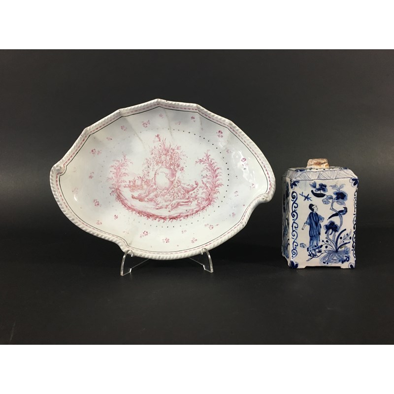 18th century, blue painted with chinoiserie figural scenes, VP mark, height 12cm; together with a continental faience dish, late 18th century, of leaf form, puce painted with a vase and game, width 25cm (2)
