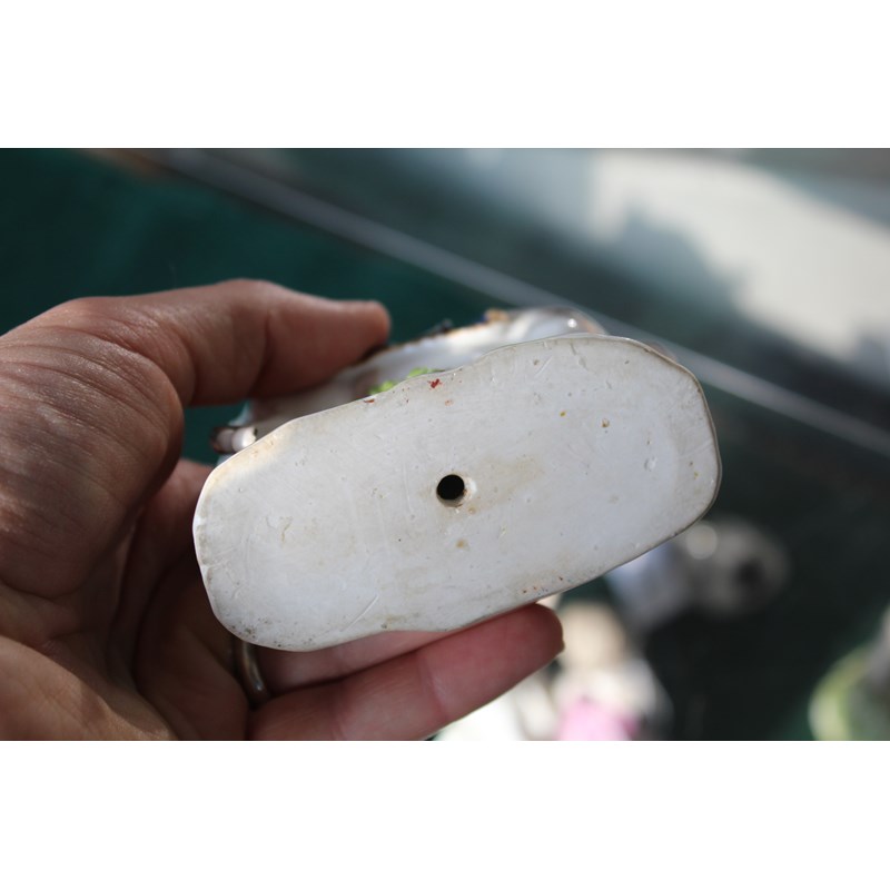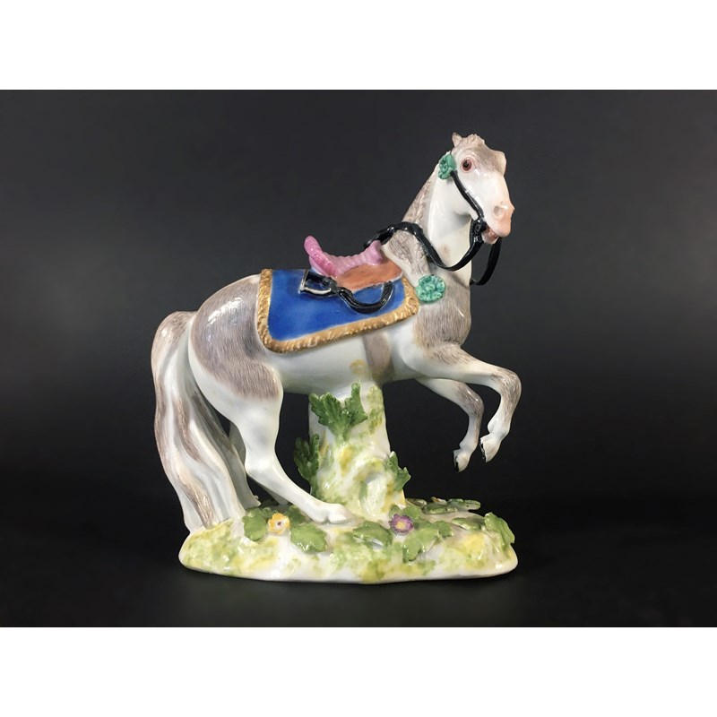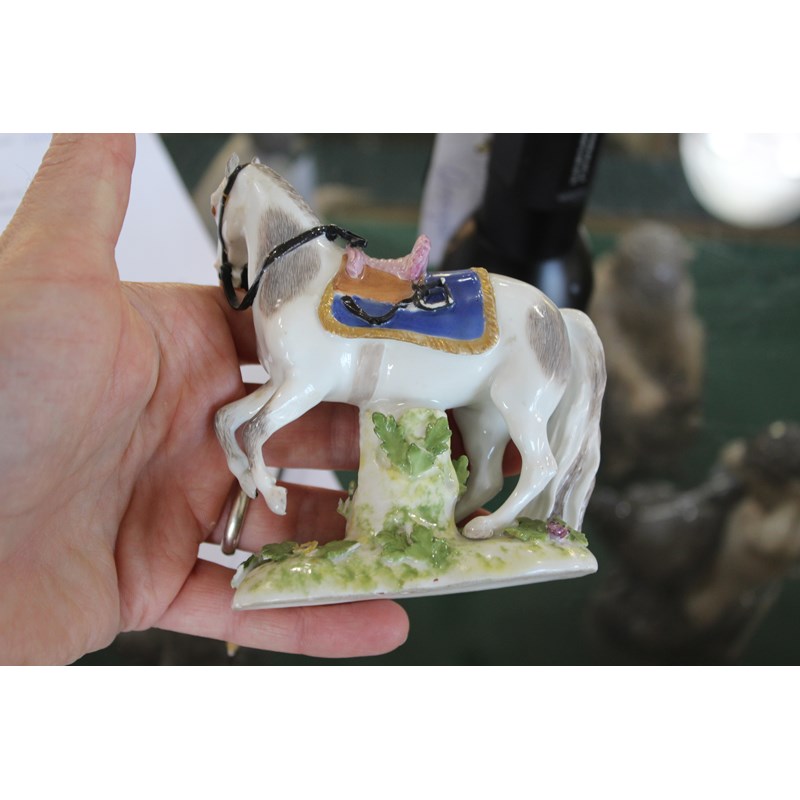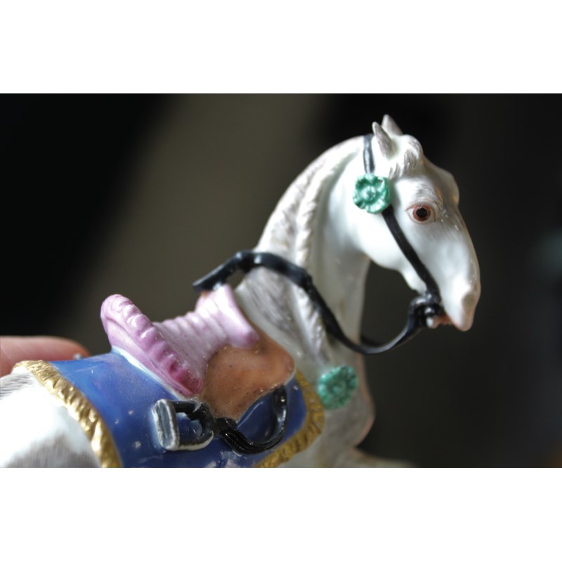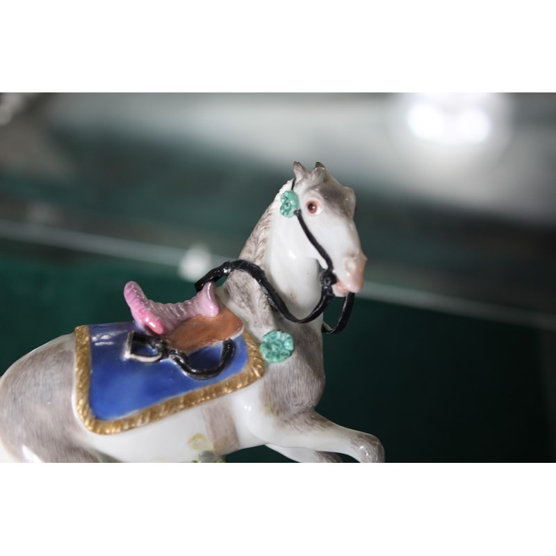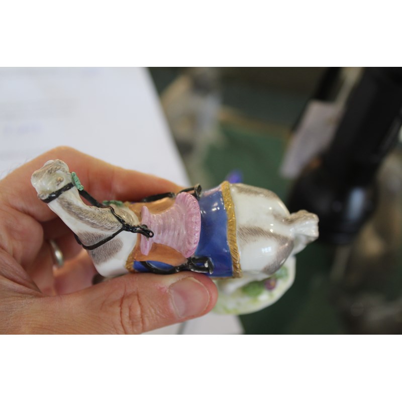 mid 18th century, with a saddle and gilt lined numnah, on a floral encrusted base, blue crossed sword mark to rear of base, height 11.5cm