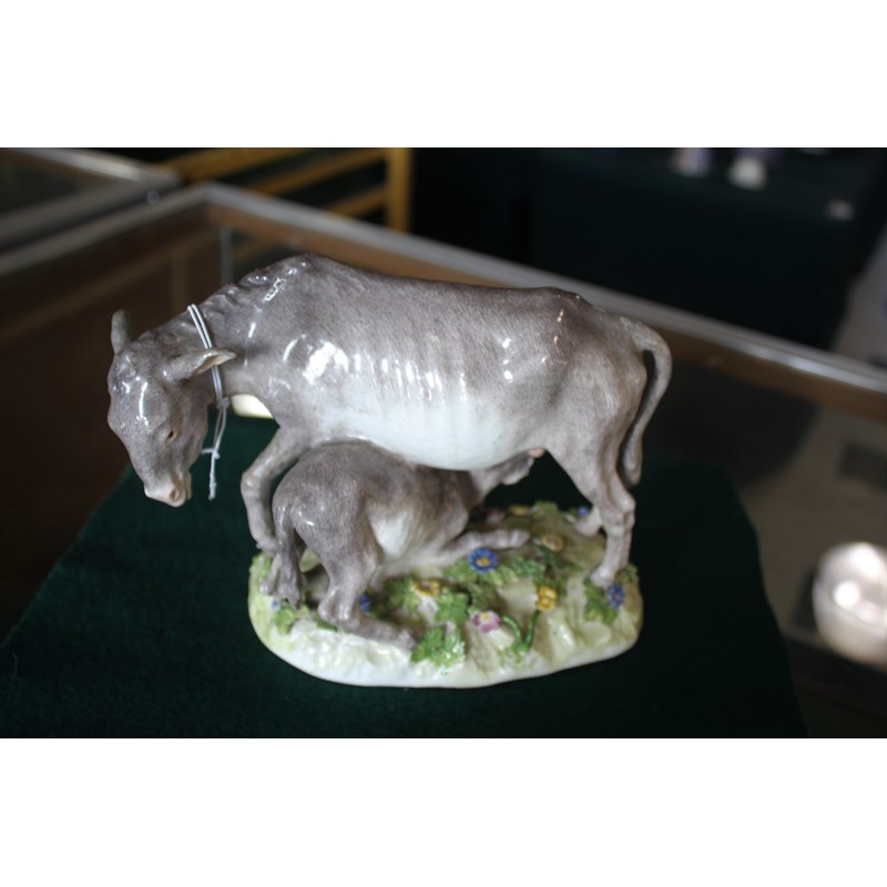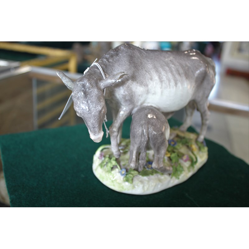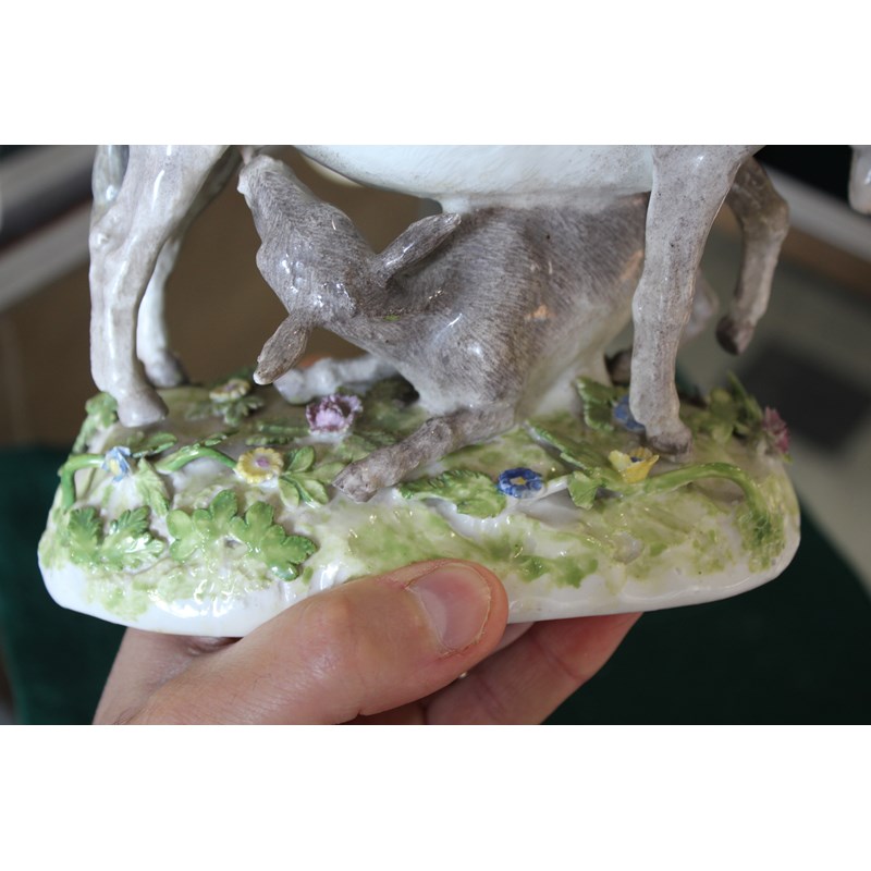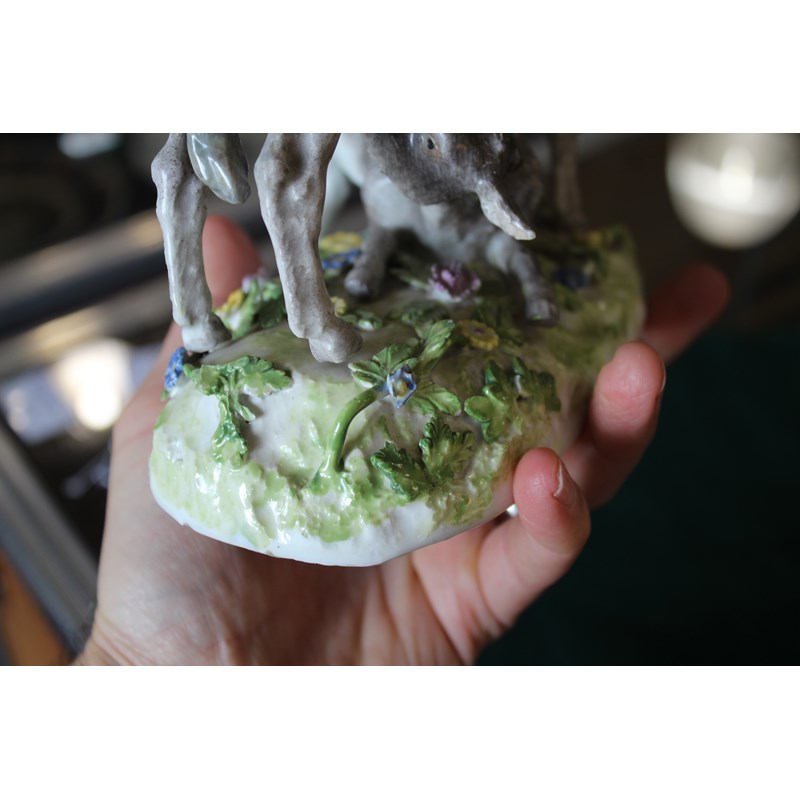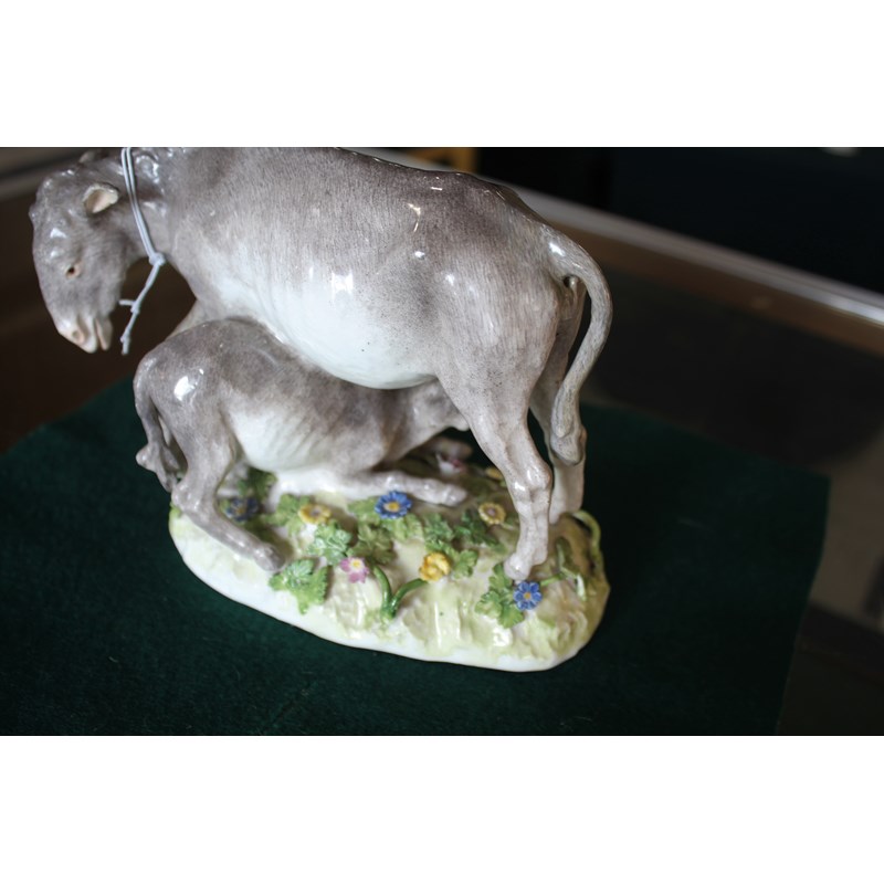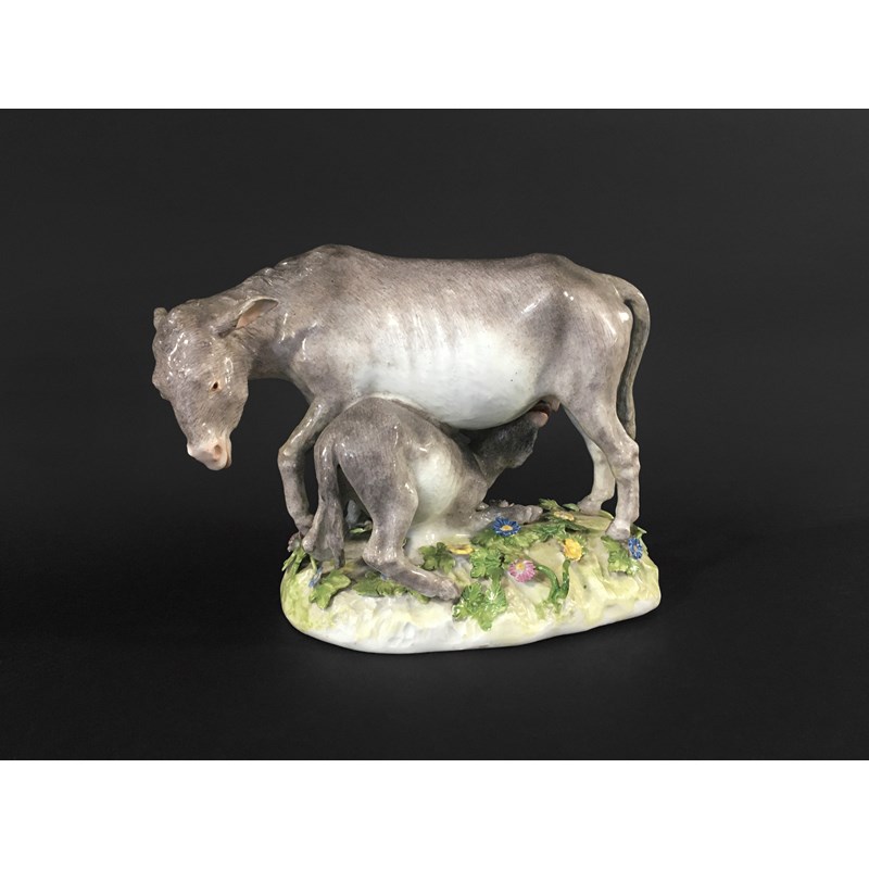 circa 1750, after Kaendler, the foal suckling, on a floral encrusted base, blue crossed sword marks to edge base, height 15cm