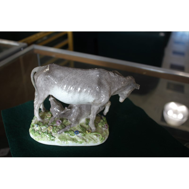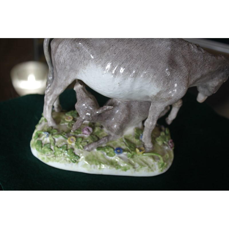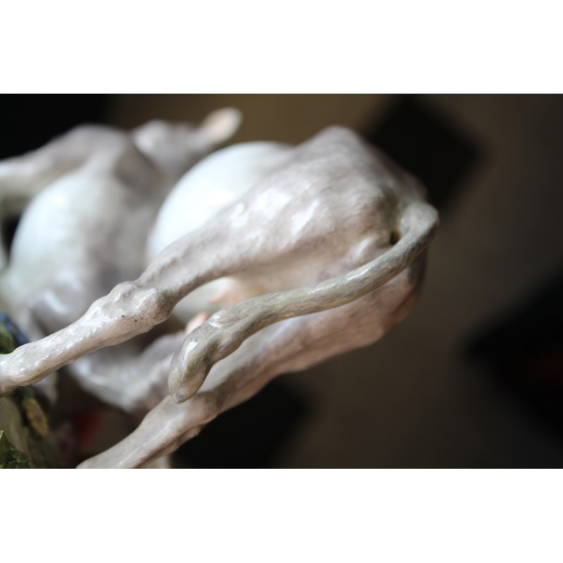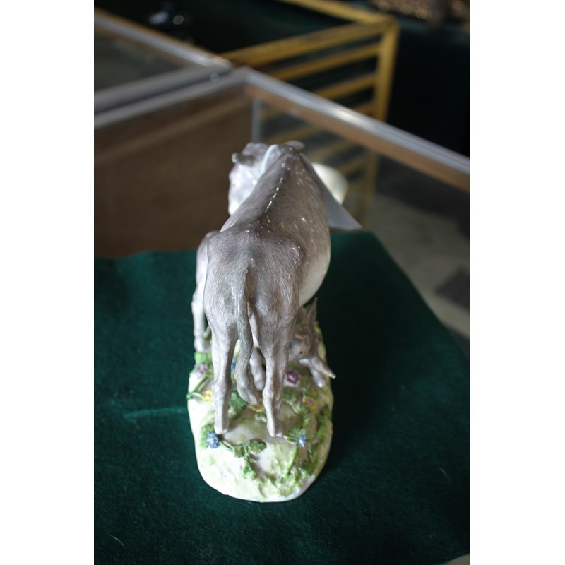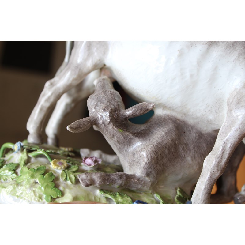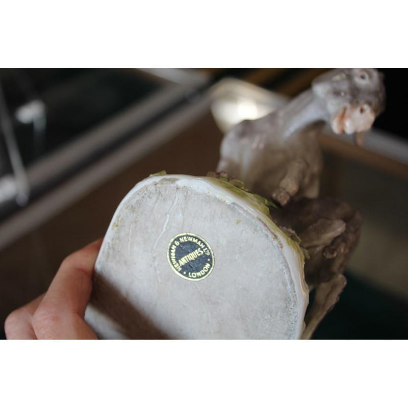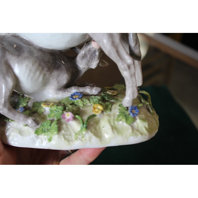circa 1750, after Kaendler, the foal suckling, on a floral encrusted base, blue crossed sword marks to edge base, height 15cm
