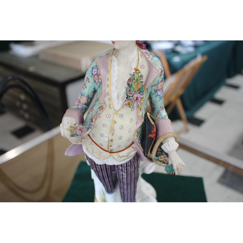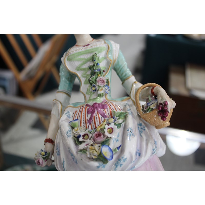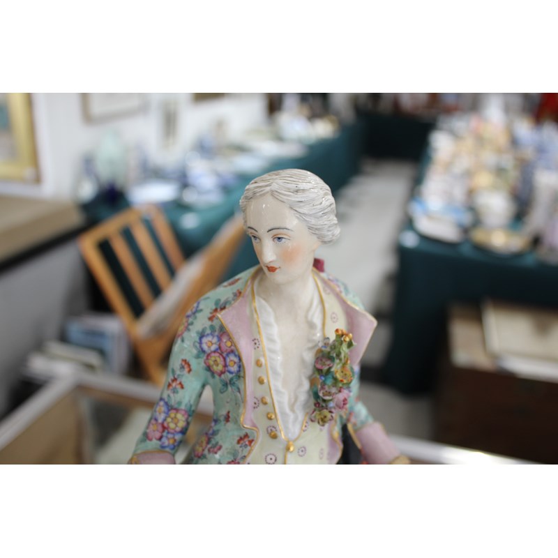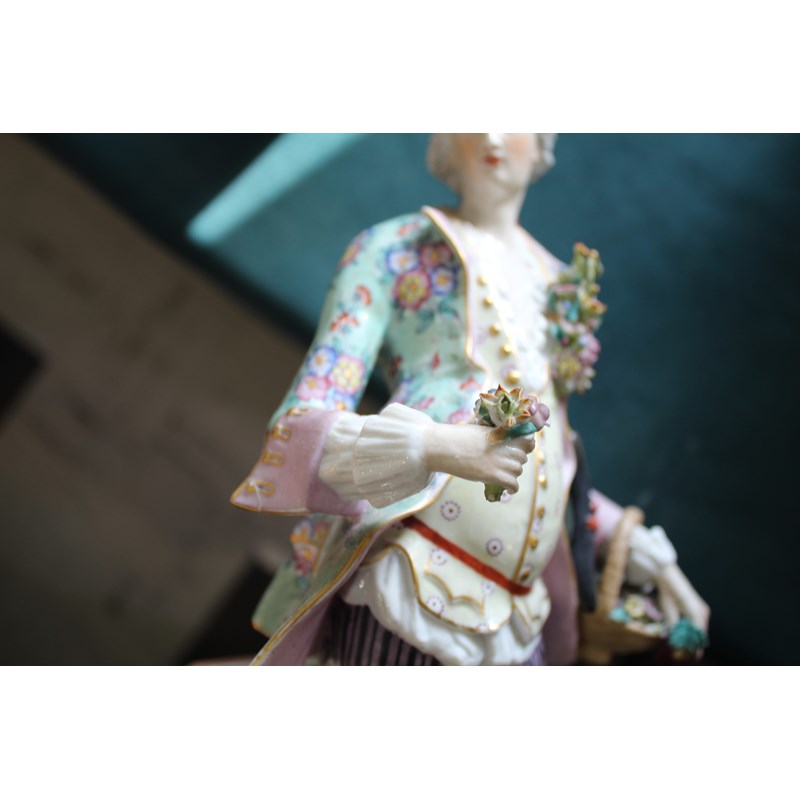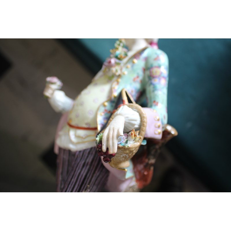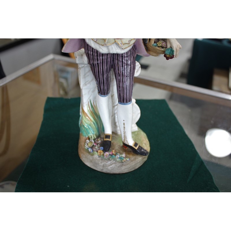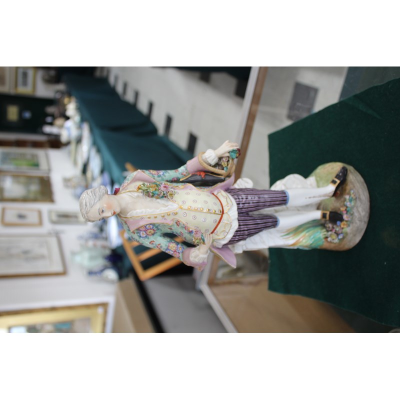 late 19th century, applied with two cherubs and floral encrustations, height 34cm; together with a pair of French porcelain figures, probably Montreuil, of an elegant couple, blue factory marks, height 37cm (3)